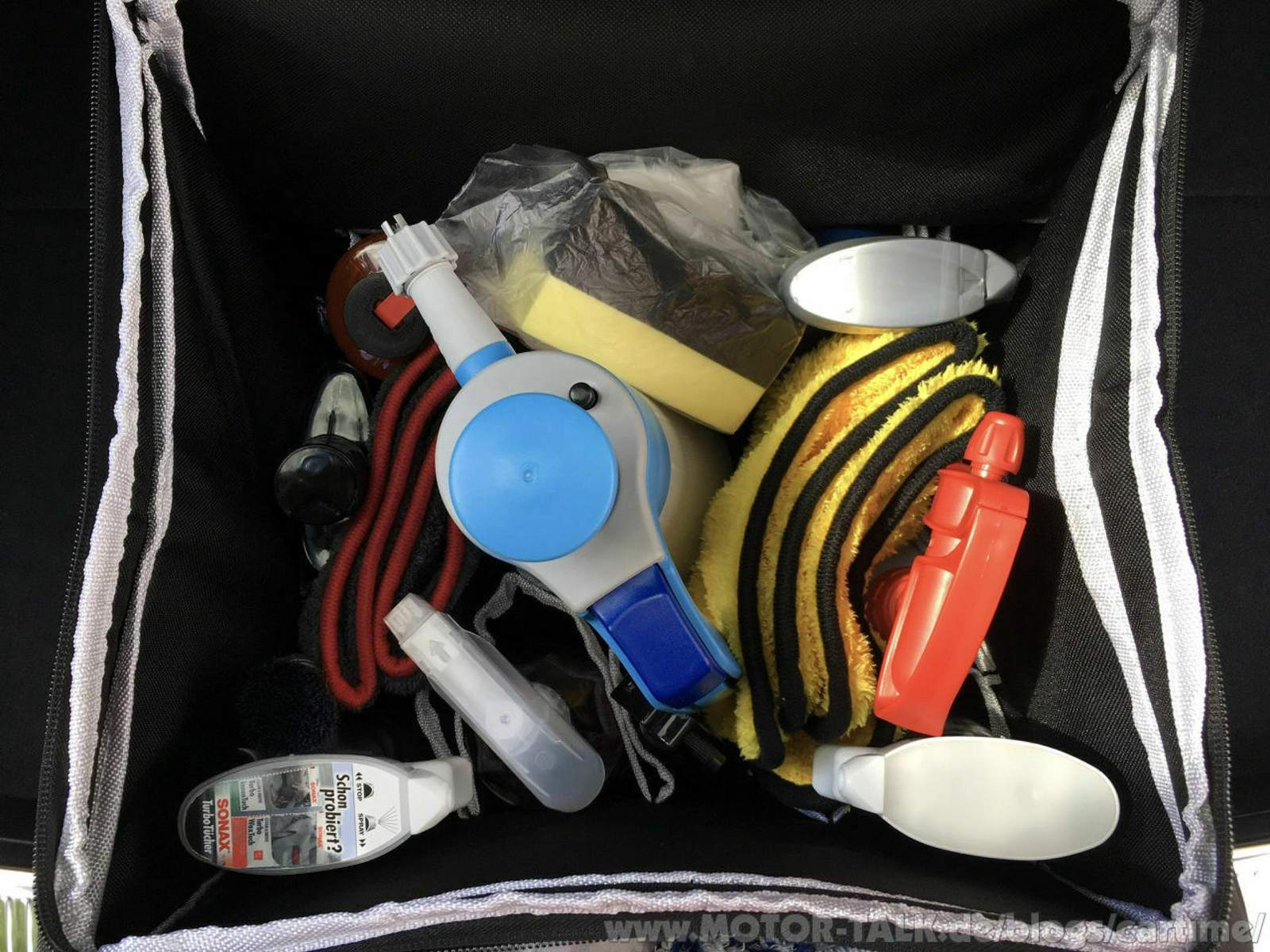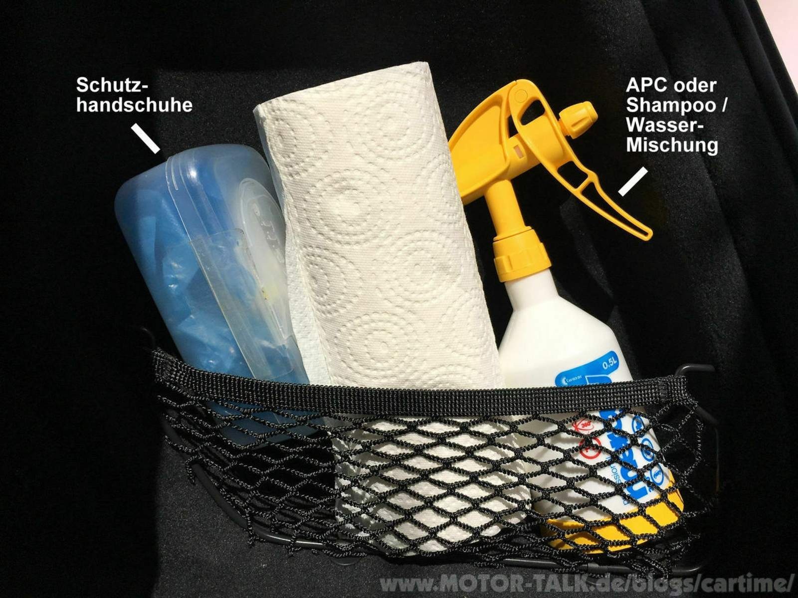Diese Sachen passen alle in meine kleine Monello Tasche, diese habe ich im linken Gepäcknetz vom Kofferraum meiner mexikanischen Rennkuh. Im Alltag kann man sonst auch z.B. Radschraubenkappen oder Nachfüllöl in die kleine Tasche packen. Auf der anderen Seite des Kofferraumes führe ich dann noch eine kleine Kwazar mit wahlweise APC oder einem Shampoo-Wassser Gemisch mit. Dazu gesellen sich dann auf der anderen Seite noch Schutzhandschuhe und etwas Küchenpapier z.B. zum einweichen von Vogelkot.