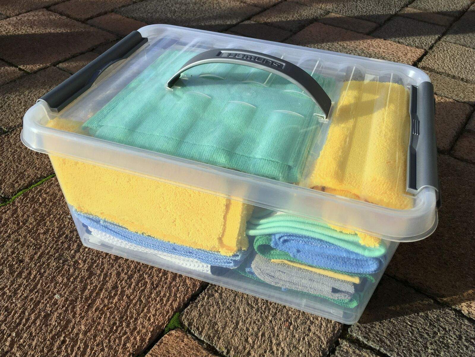 Mit jeweils 2x mit 15 L, 2x mit 22 Liter, 1x 12 L und 2x 0,5 Liter habe ich Sunware Aufbewahrungsboxen für u.a. meine u.a. Mikrofasertücher. So sind die Sachen auch immer geschützt gelagert. Die Sunware Boxen sind sehr stabil und man kann sie sehr leicht öffnen und schließen. Das ganze schaut bei mir aus wie unten folgt. Sie sind auch wieder aus Holland, ist das jetzt Zufall!? Naja ich hab sie ja eigentlich aus dem Baumarkt aber pssst. Lekker Opbergboxen. Kann man sonst auch Süßigkeiten drin verstecken, dann lieber eine blickdichte nehmen oder die Schoki in die Tücher einwickeln!