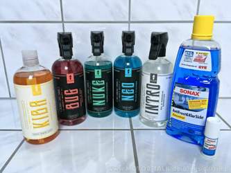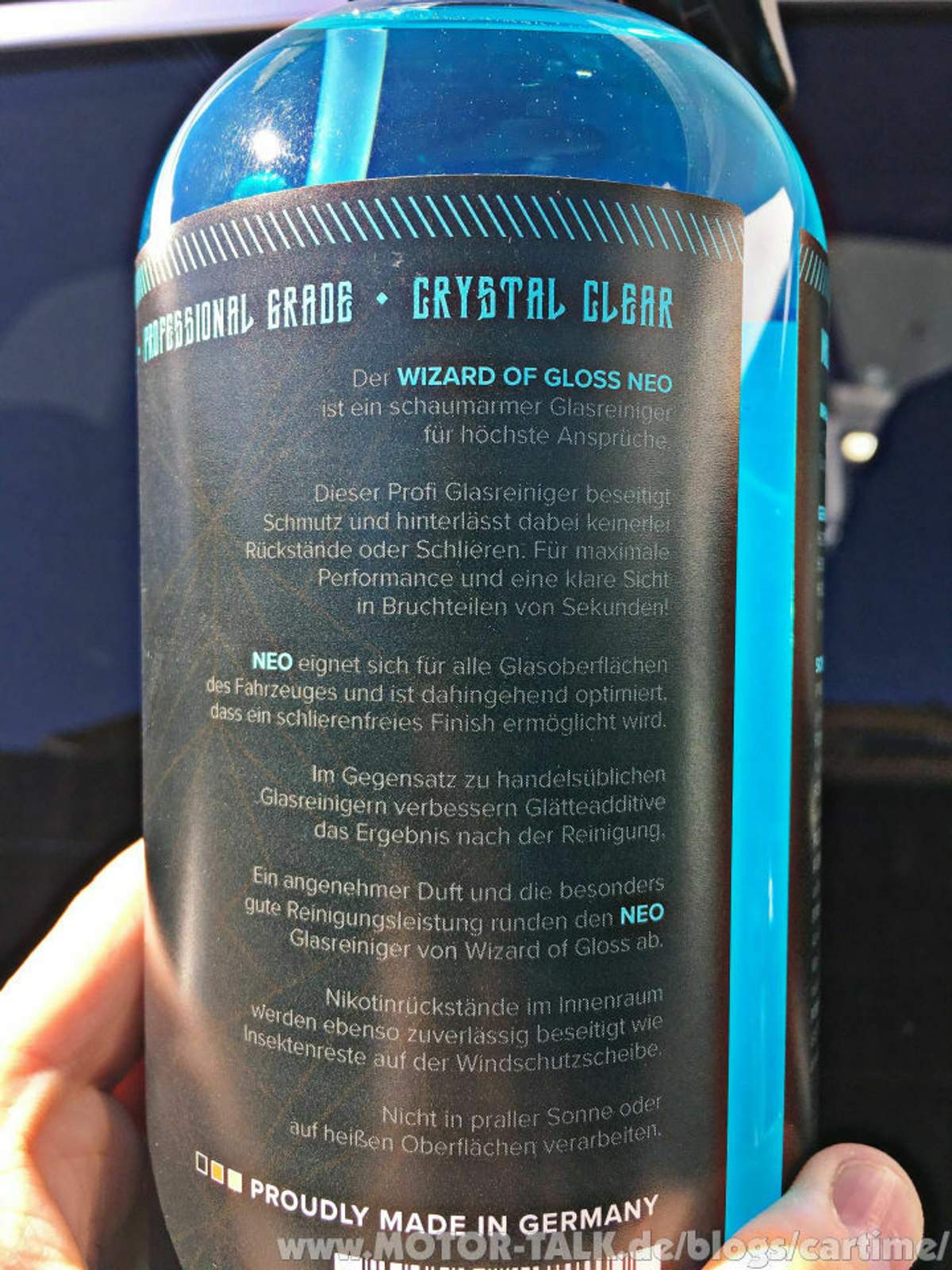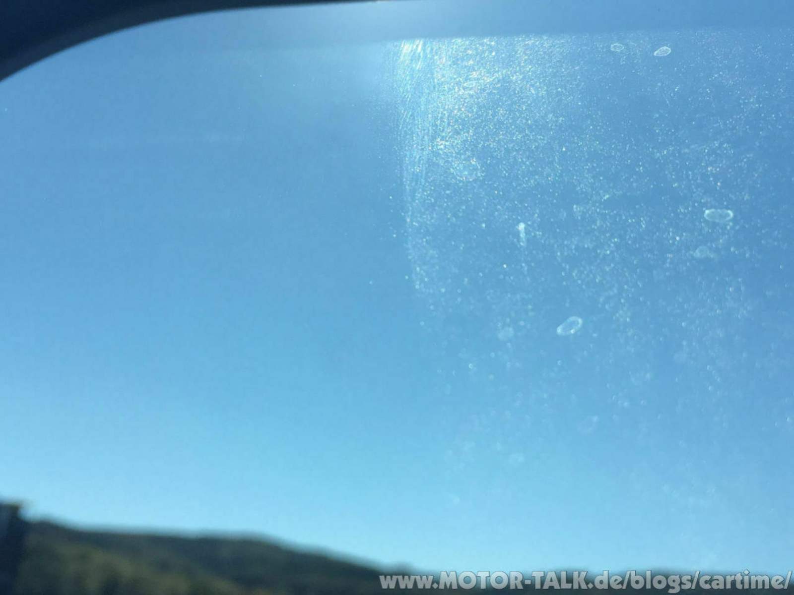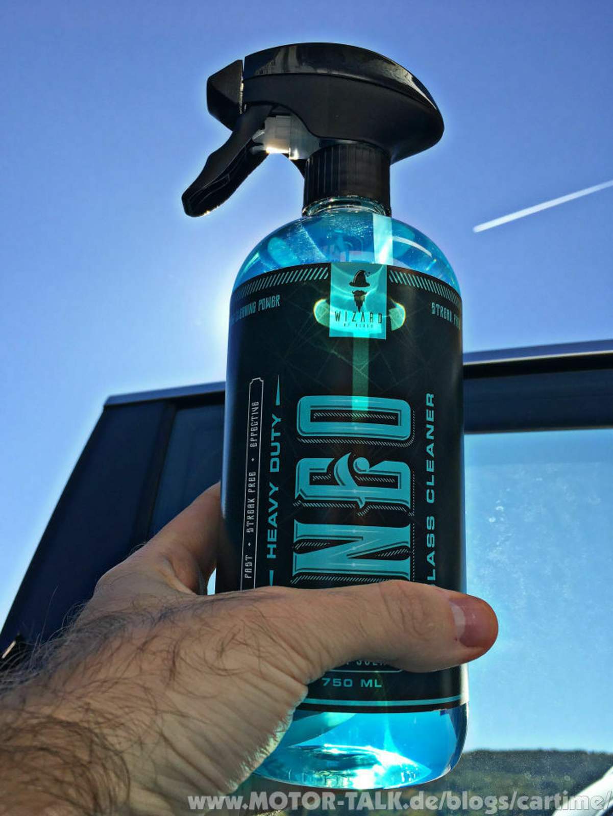Die Scheiben sind noch mit Wasserflecken verschmutzt. Das ist ein Fall für Neo. Er riecht als Glasreiniger nach Melone. Ihn werde ich in Verbindung mit dem Glastuch Clear View anwenden. Zwei Sprühstöße auf das Tuch und ab auf die Scheiben damit. Hat sich bei mir, an den Scheiben, als bessere Methode erwiesen, als sofort auf die Scheiben zu sprühen. Wie auch schon bei einem Test zuvor, reichen auch hier max. 2 Mal drüberwischen für eine klare Sicht. Der Geruch, der auch hier wieder in der Luft liegt ist erfrischend. Besser als beißend nach Alkohol.
