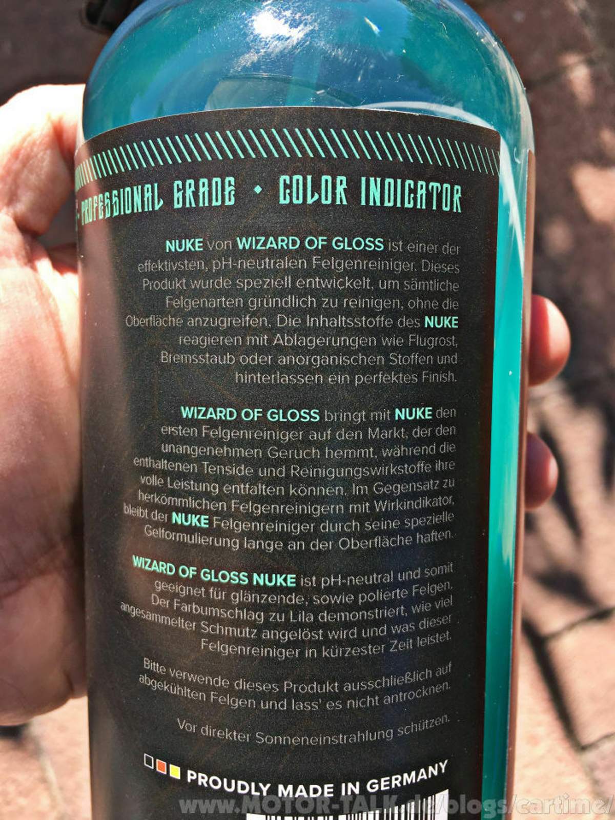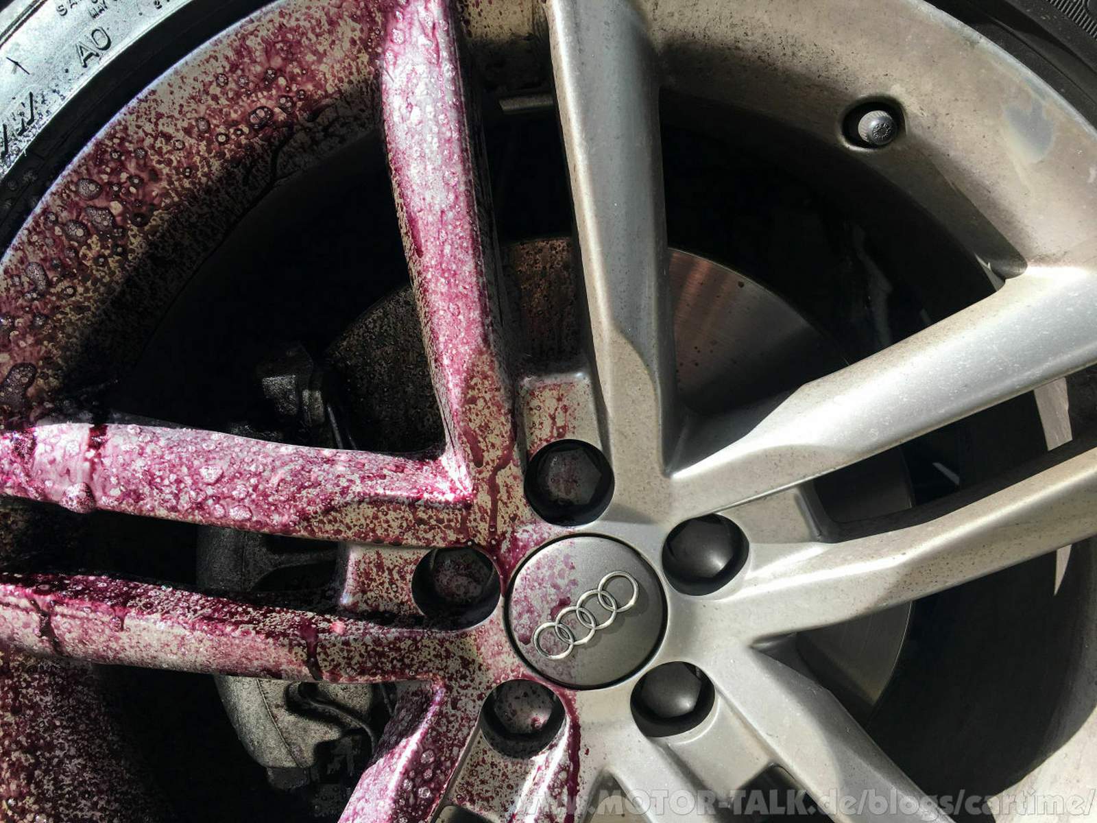 Um mal zu sehen, was es wirklich ausmacht werde ich zunächst nur eine halbe Felge mit dem Nuke einsprühen. Damit es ein fairer Vergleich wird, sind die Felgen auch nicht versiegelt. Das ganze auf die Felge gesprüht, kommt nach ca. einer halben Minute der Farbunschlag des Wirkindikators in lila zum Vorschein. Die andere Hälfte habe ich mit einem Stück Pappe abgedeckt. Eine Einwirkzeit ist auf der Flasche nicht angegeben. Ich gebe dem ganzen wieder ca. 2-3 Minuten.