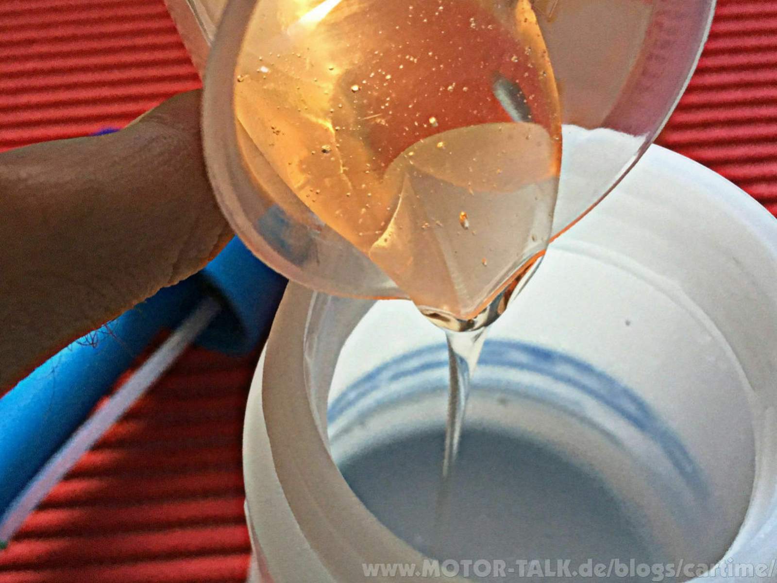 Da mir das Kiba immernoch sehr gut gefällt, war die kleine Flasche mit den 750ml schnell "verspeist". So habe ich mir nun gleich mal die 3L Kanister-Variante gegönnt. Passend für einen Test mit der großen Gloria FM 30. Von der Dosierung her habe ich auf die 3L Wasser 60 ml vom Kiba eingefüllt. Zuvor wieder gut schütteln! Denn es handelt sich hier um einen „Shake“.
