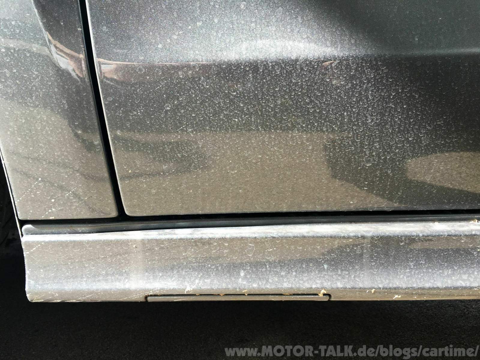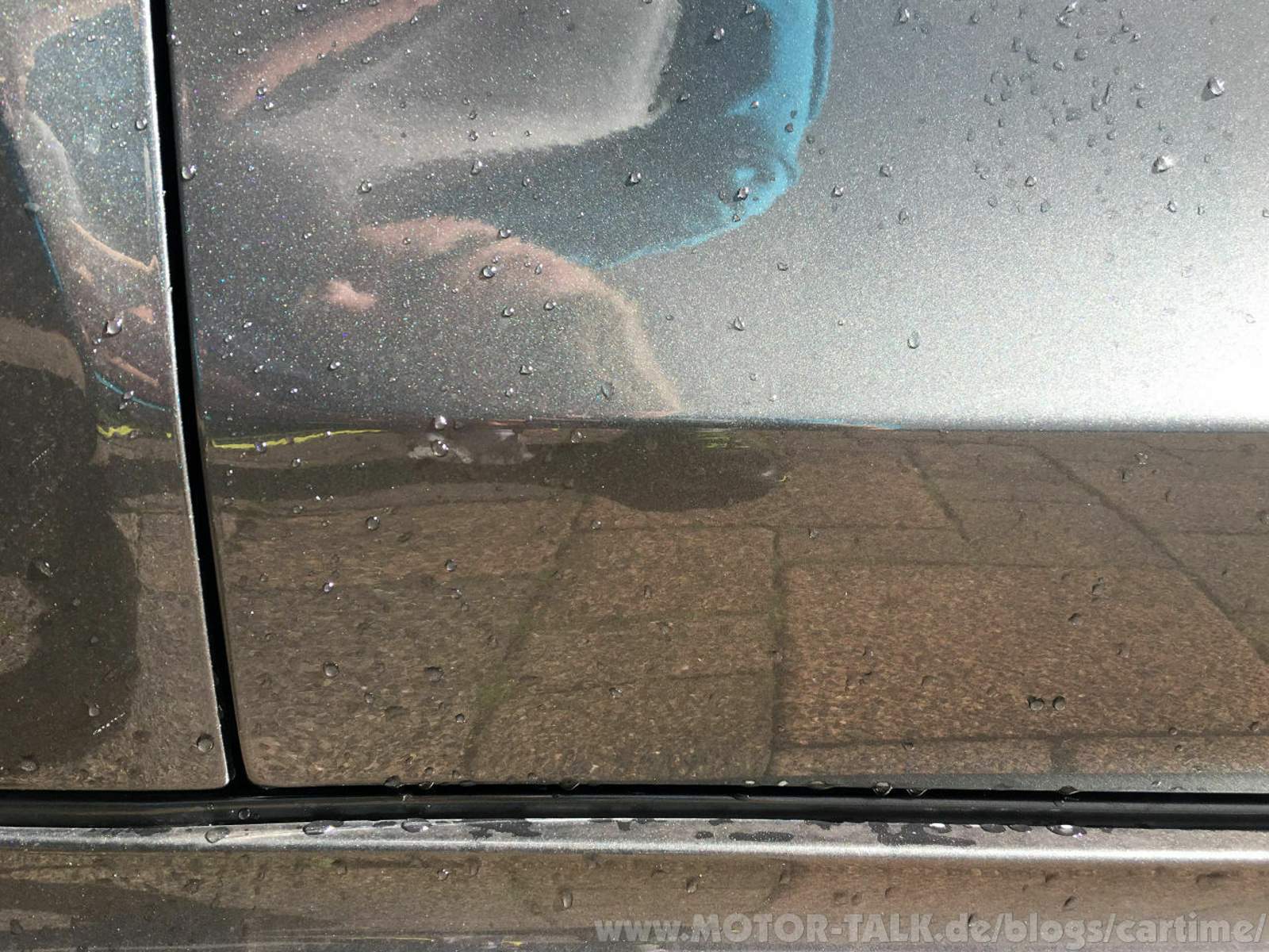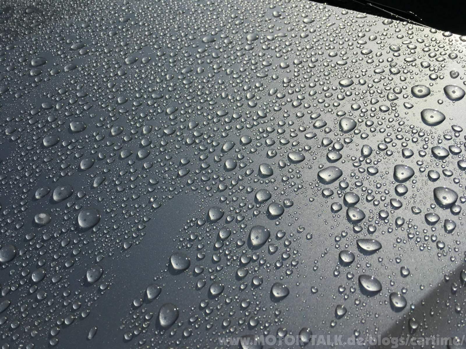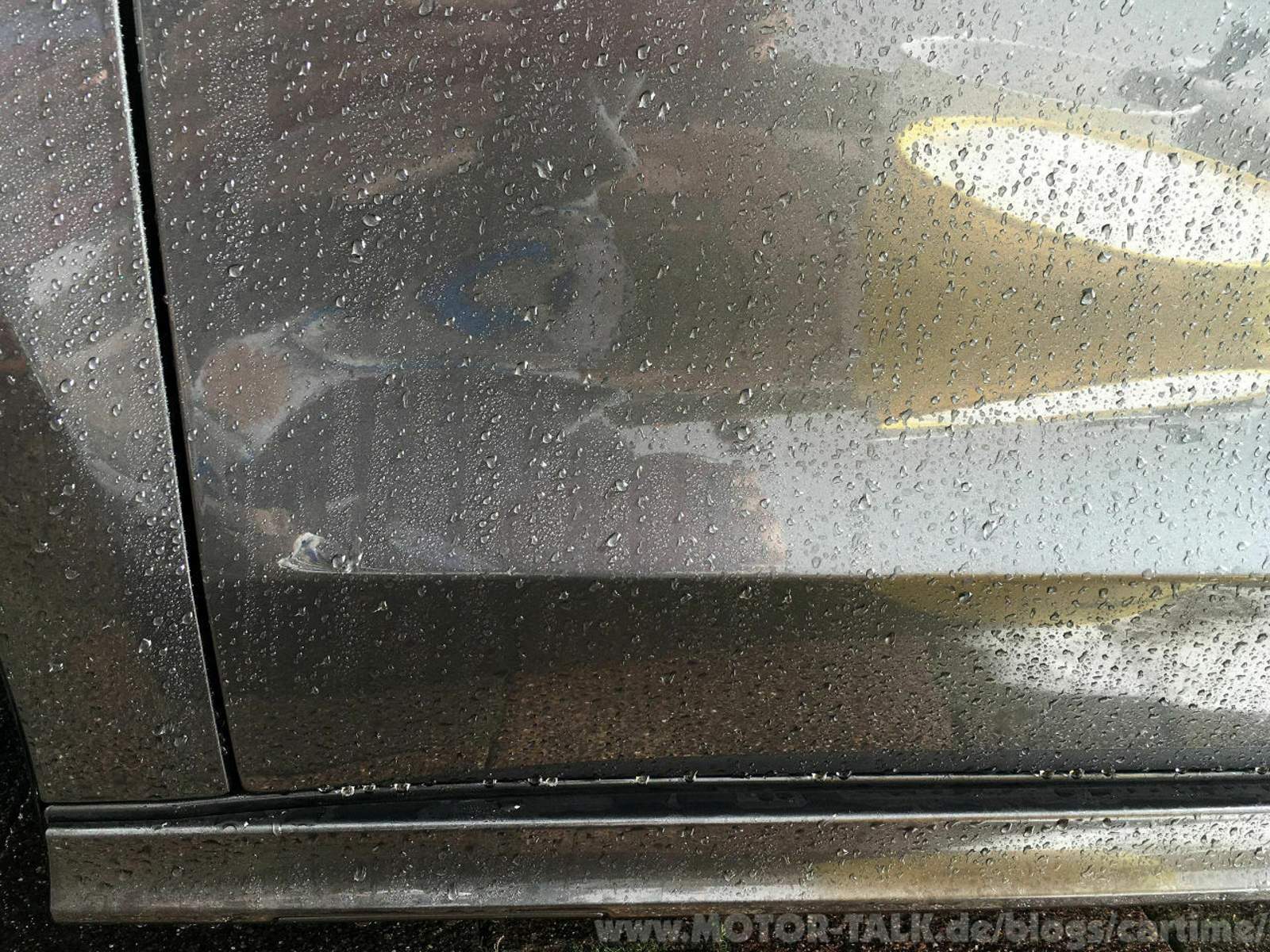 Anfang April habe ich ja drei verschiedene Wachse auf zwei Fahrzeugen aufgetragen und ausprobiert. Das waren das Polishangel Rapidwaxx, das Autosol Hartwachs für matte Folien und das Bilt Hamber Double Speed-Wax. Der Artikel kam dann aber erst Ende April online. Double Speed-Wax und Rapidwaxx haben einen sehr guten Job gemacht. Rund um die Radhäuser begannen die Wachse schon relativ früh auf dem Lack leicht zu schwächeln. Das Rapidwaxx etwas mehr als das Double Speed-Wax. Das war nach den ersten dreieinhalb Monaten. Das zog sich auch so weiter fort. Front- und Heckbereich schwächelten auch an ein paar Stellen, bis zum Abschluss des Tests. Das Dach und ein Großteil der Motorhauben perlen allerdings fast wie am ersten Tag. Einzig allein das Autosol Hartwachs für matte Folien kann ich leider nicht empfehlen, da es nach Regen hellere milchige Flecken auf der matten Oberfläche hinterließ. Lässt sich schwierig auf einem Foto einfangen auf silber matt. Daher gibt’s kein Foto. Vom Schutzfaktor ging es aber in Ordnung. Dieses Folienwachs war aber auch im obigen Bereich des Fahrzeugs (ab den Spiegeln aufwärts). Desweiteren muss ich dazu sagen, dass es sich bei den Testfahrzeugen um Garagenfahrzeuge handelt. Die standen also nicht den ganzen Tag in der brütenden Hitze herum. Hier mal ein paar Bilder des Beading’s im sauberen Zustand.