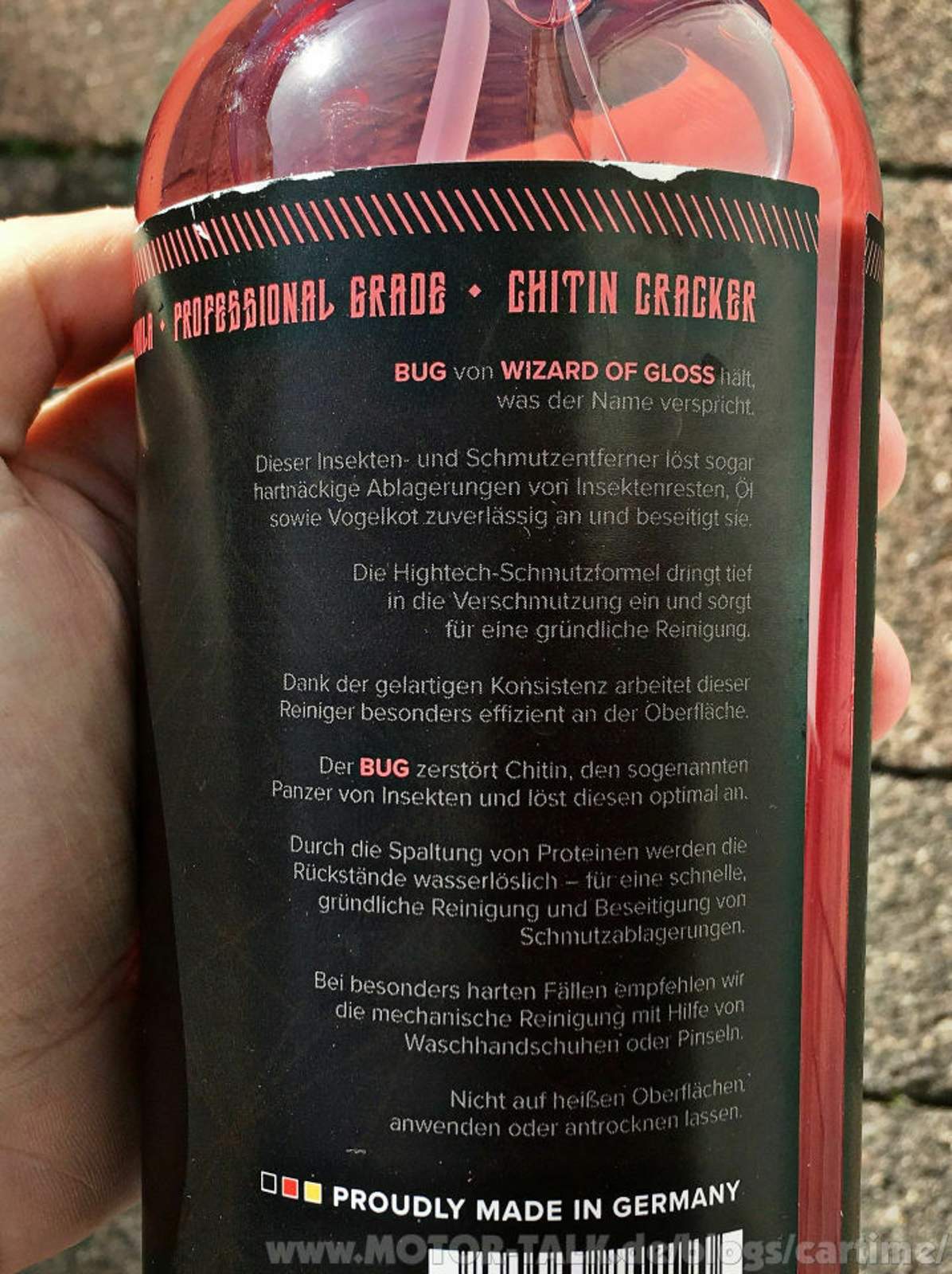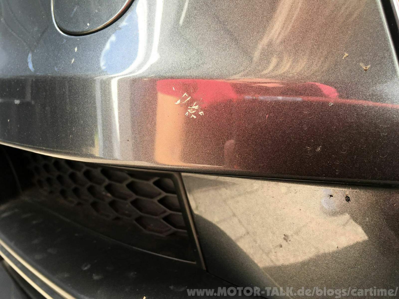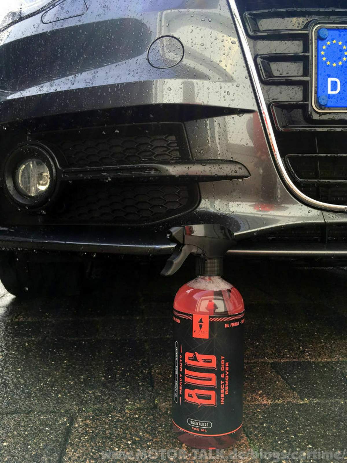 Insekten, Vogelkot & Öl. Das ist das Aufgabengebiet von dem gelartigen Bug. Wem der „Kiba Shake“ nicht reichte und dem noch nach einer weiteren „Proteinbehandlung“ ist. Bei extremen Fällen beim Einweichen mit Pinsel nachbearbeiten. Übrigens sehe ich oft welche, die die ganze Front mit Insektenentferner besprühen. Man braucht nur da sprühen wo auch effektiv Insekten sind. Einwirkzeit ist keine angegeben. Nach dem Aufsprühen lasse ich die Flüssigkeit kurz 2-3 Minuten einwirken. Danach wird abgekärchert. Die Insektenreste sind echt alle verschwunden. Die waren zu diesem Zeitpunkt um die 3 Wochen drauf. Das einzige was ich noch erkennen kann sind die Steinschläge. Dagegen ist leider noch kein märchenhaftes Kraut gewachsen.