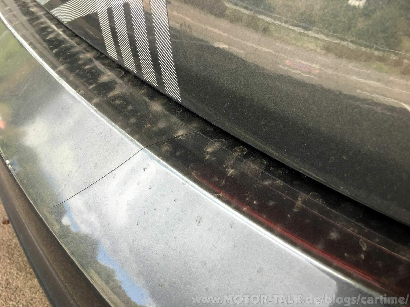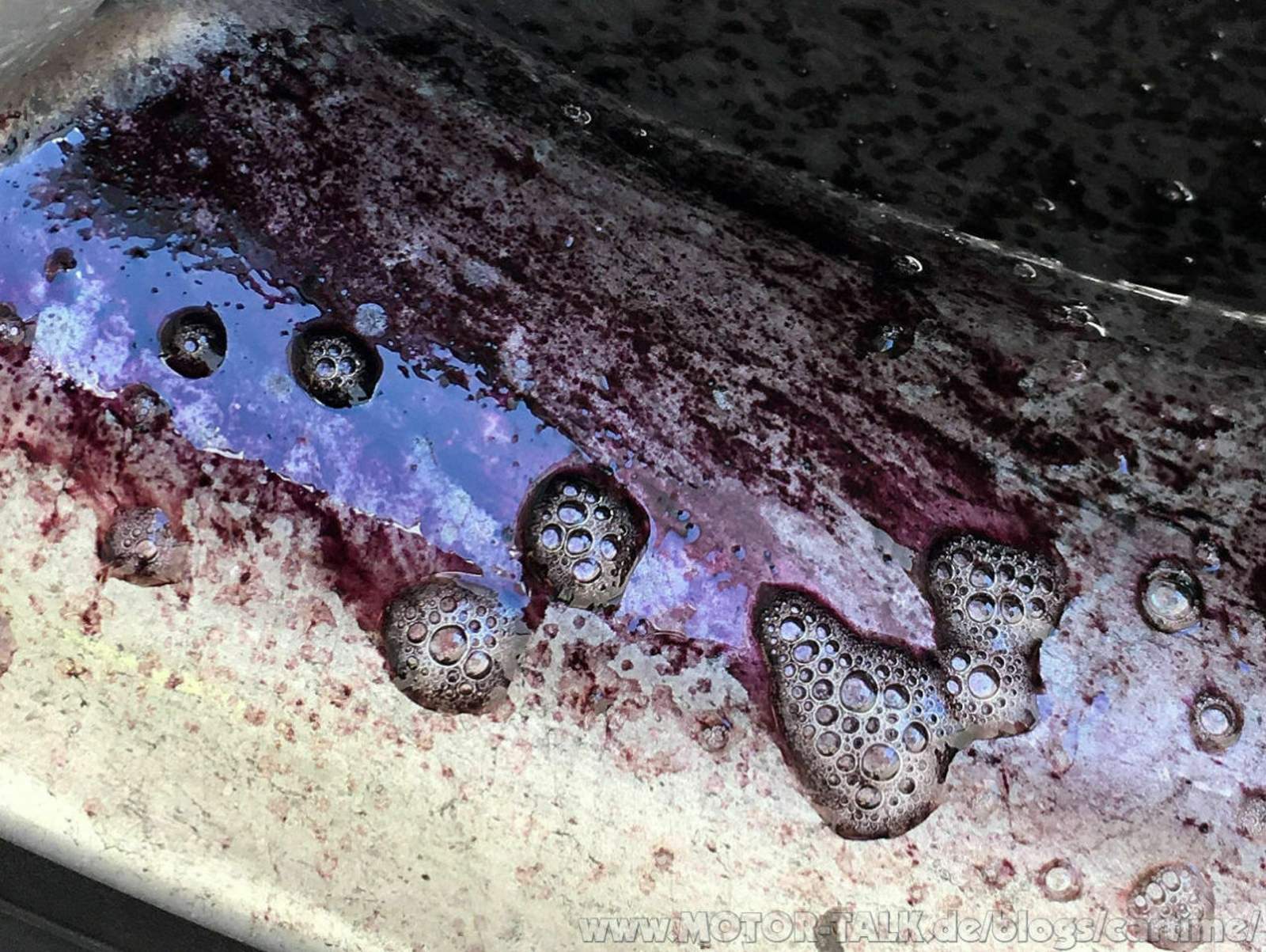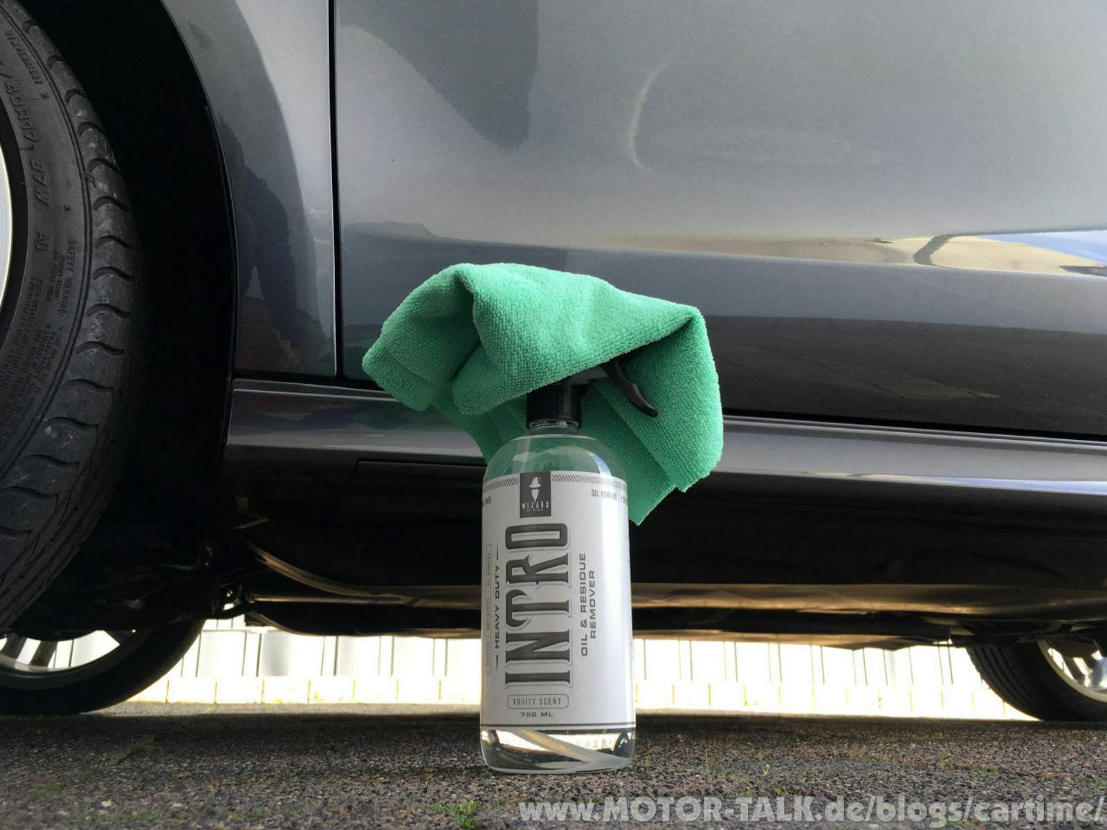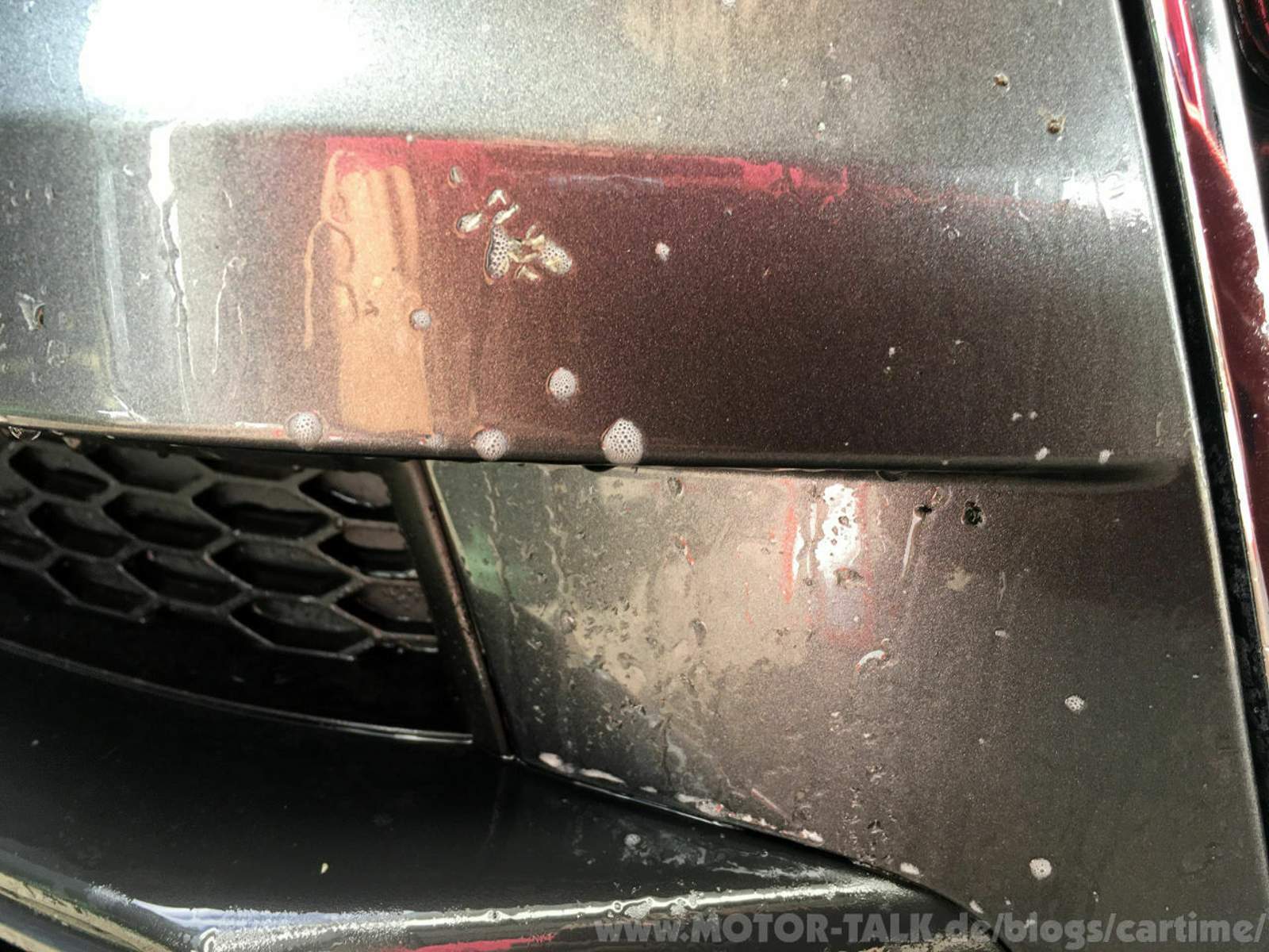 Insekten, Vogelkot & Öl. Das ist das Aufgabengebiet von dem gelartigen Bug. Wem der „Kiba Shake“ nicht reichte und dem noch nach einer weiteren „Proteinbehandlung“ ist. Bei extremen Fällen beim Einweichen mit Pinsel nachbearbeiten. Übrigens sehe ich oft welche, die die ganze Front mit Insektenentferner besprühen. Man braucht nur da sprühen wo auch effektiv Insekten sind. Einwirkzeit ist keine angegeben. Nach dem Aufsprühen lasse ich die Flüssigkeit kurz 2-3 Minuten einwirken. Danach wird abgekärchert. Die Insektenreste sind echt alle verschwunden. Die waren zu diesem Zeitpunkt um die 3 Wochen drauf. Das einzige was ich noch erkennen kann sind die Steinschläge. Dagegen ist leider noch kein märchenhaftes Kraut gewachsen.