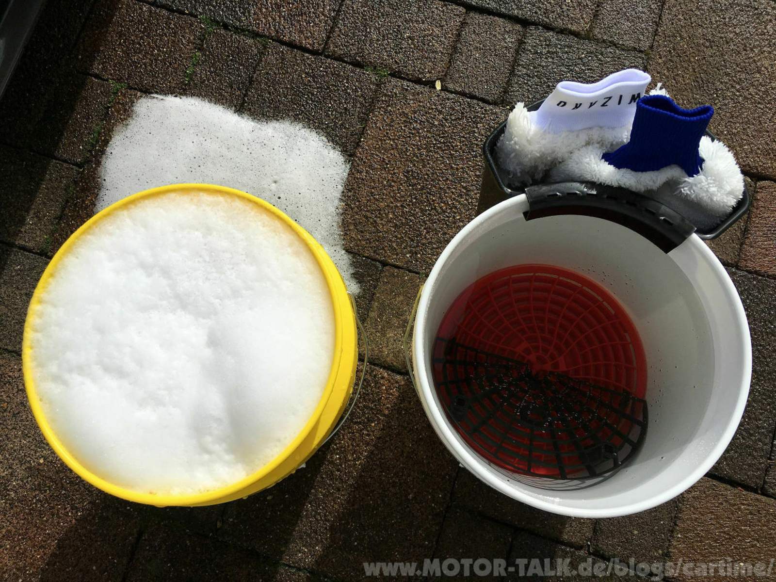 Jetzt wird noch schön von Hand gewaschen. Da gehe ich diesmal aber nicht näher drauf ein. Dazu nur zwei Dinge. Den oberen Teil habe ich nach Dosierungsangabe mit Autoshampoo gewaschen. Für den unteren Teil des Fahrzeugs, den ich neu wachsen möchte, habe noch etwas mehr Autoshampoo in den Wascheimer gefüllt. Sodass es überdosiert wurde und die alten Wachsreste mit anlöst. Auf dem Bild sieht man rechts den Klarwasser Eimer mit der Dirt Lock + Washboard.