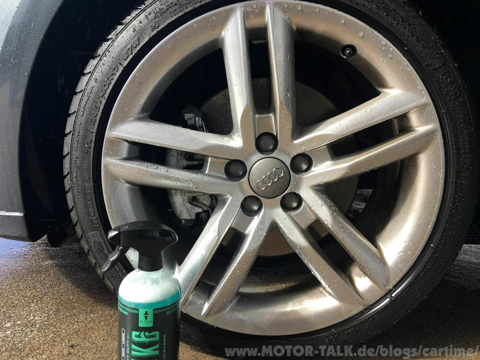 Einen pH-neutralen Felgenreiniger gibt es auch. Der riecht sehr arg nach Vanille. Die meisten riechen nicht sonderlich gut. Schlimme Begegnungen bzgl. Geruch hatte ich schon mit dem ein oder anderen Felgenreiniger. Das kann einem durchaus schon mal die Schuhe ausziehen. Widerum sagen andere ein Felgenreiniger der gut riecht kann nichts. Das sehen wir später.