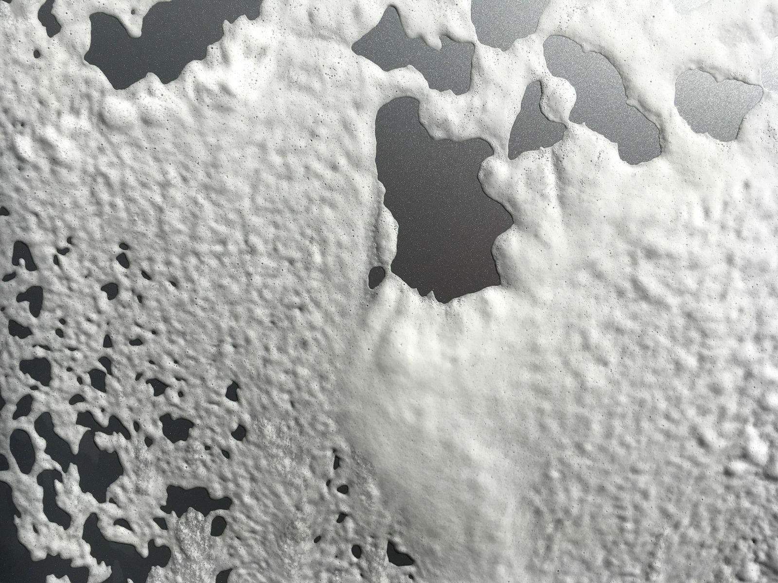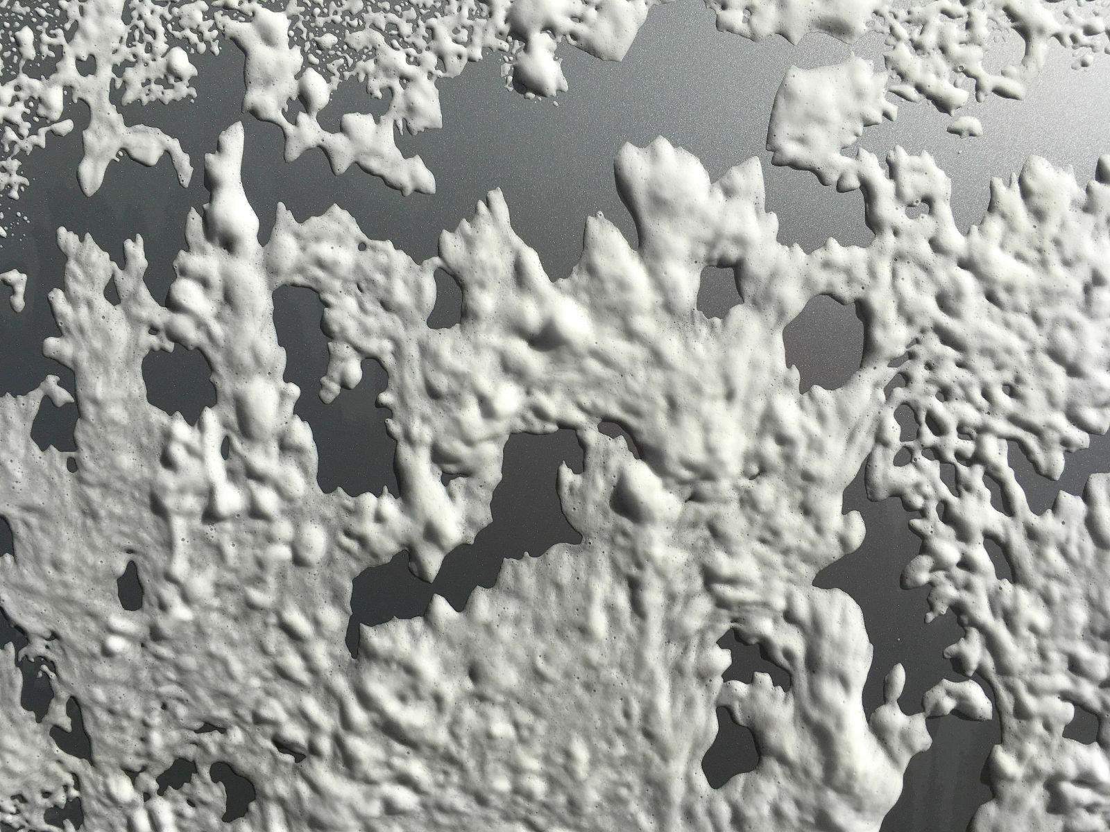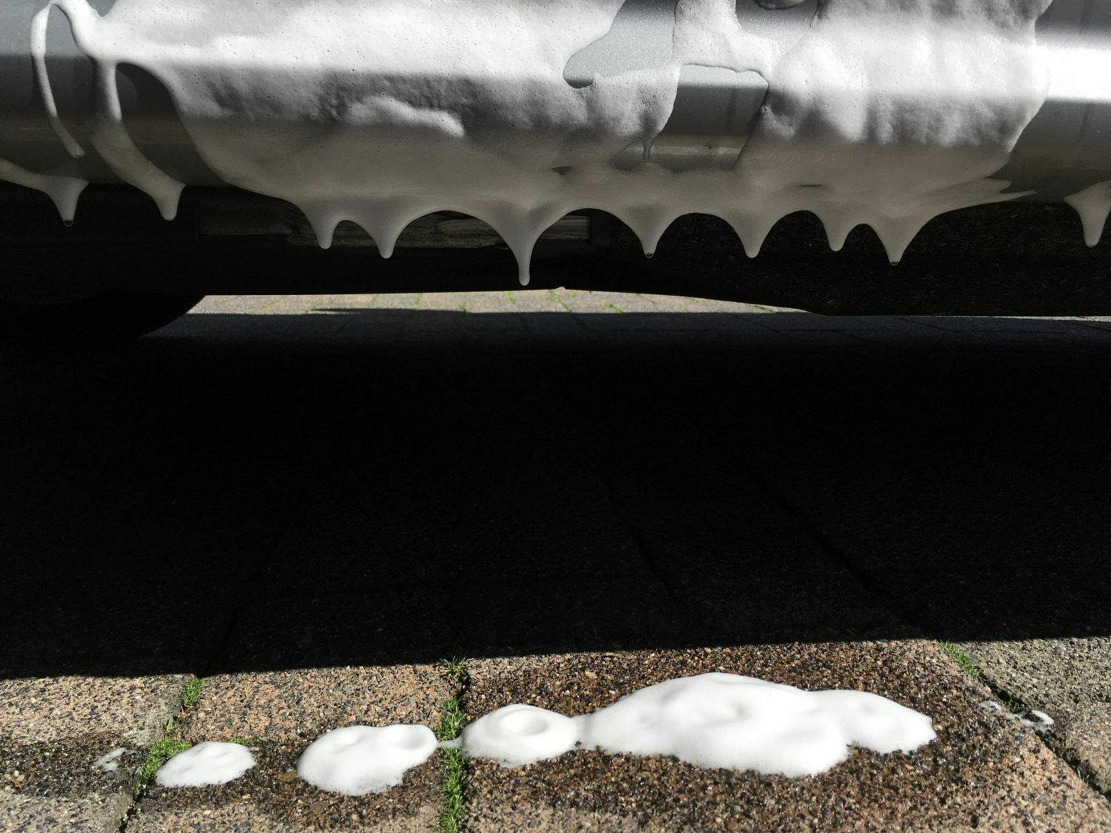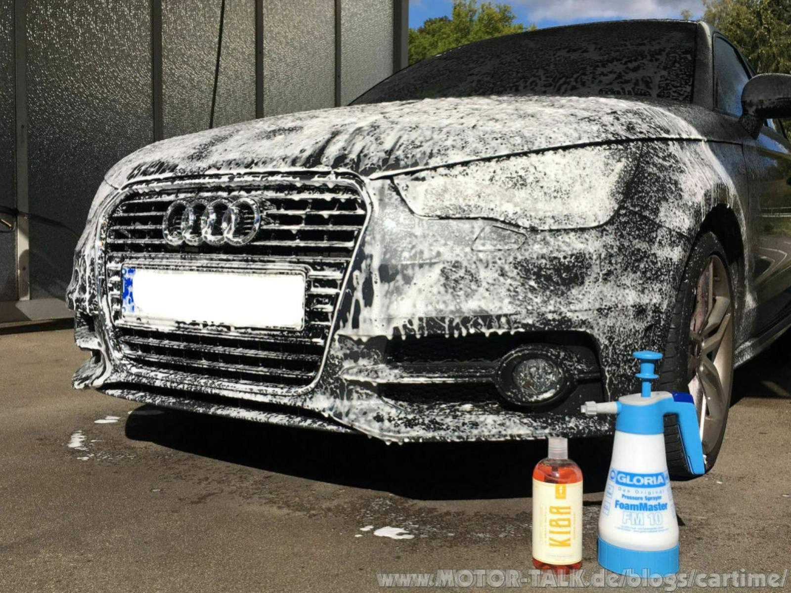 Man gibt um die 30 ml von dem richtig dickflüssigen „Shake“ auf 1 Liter in den Schaumsprüher. Es braucht kein Autoshampoo welches man zusätzlich hinzugeben muss! Wachse und Versiegellungen werden dabei nicht angegriffen. Der durch die FM 10 entstandene Schaum bleibt auch gut auf dem Fahrzeug. Leider schien mir Sonne etwas auf die Motorhaube in der Waschbox, was jetzt nicht so von Vorteil war. So habe ich zügig Bilder gemacht und dann vorne etwas eiliger abgekärchert. Zuvor war schon ordentlich an Schmutz auf dem A1. Dieser konnte nun schon durch die Vorwäsche allein, grob entfernt werden. Das hat gut geklappt.