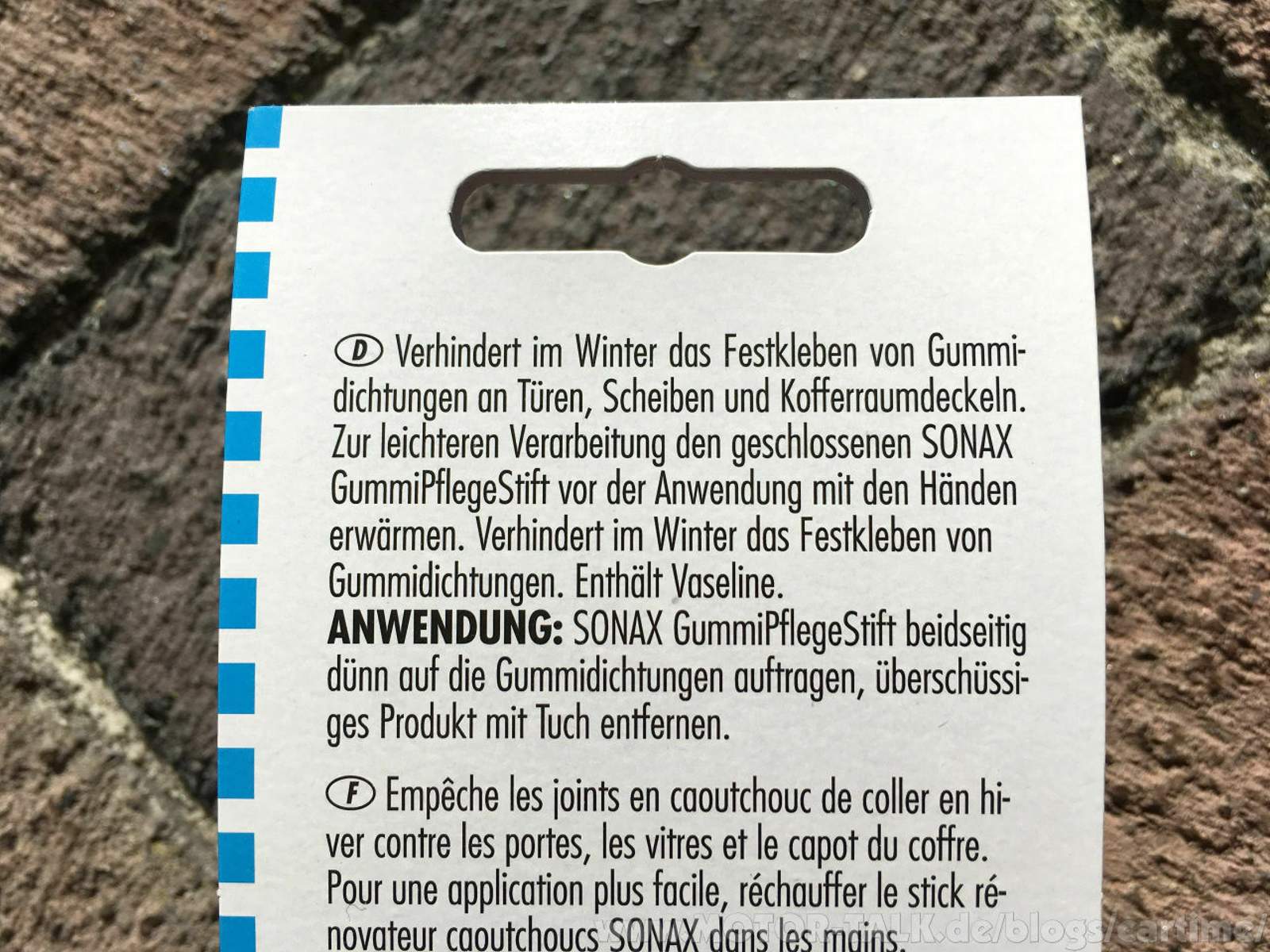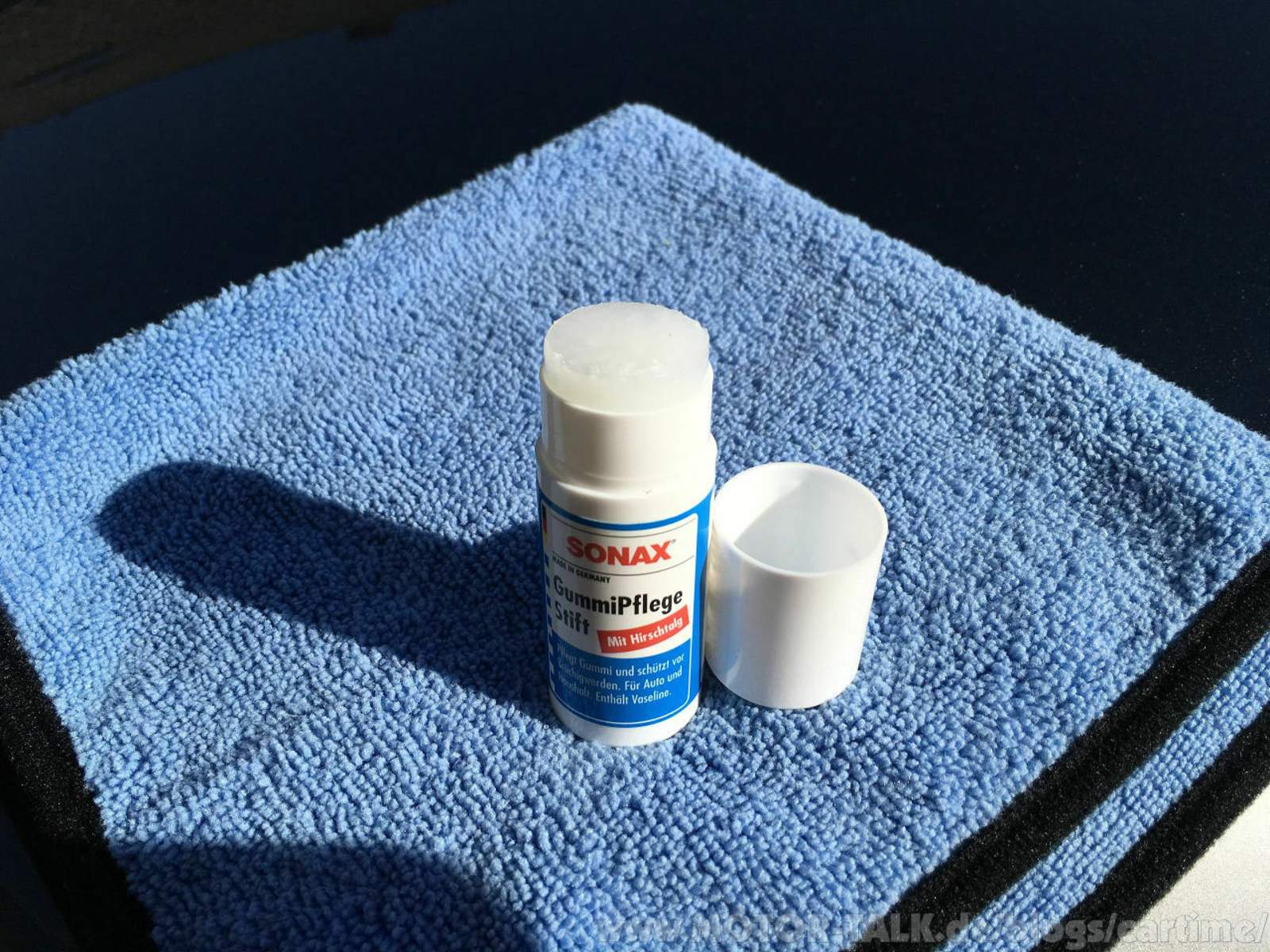 Auch Türgummi‘s benötigen vor der kalten Jahreszeit eine besondere Pflege! Bevor man ein Pflegemittel aufträgt, ist es wichtig die Türgummis von Schmutz und Feuchtigkeit zu befreien. Nur auf einem sauberen Untergrund kann die Pflege ordentlich haften und ihre Wirklung erzielen. Das kann man mit etwas verdünntem APC Reiniger und einem Mikrofasertuch tun. Es ist also darauf zu achten, dass die Türgummis nach der Reinigung trocken sind. Dann kann es losgehen. Dafür nehme ich mir den GummiPflegestift von Sonax. Das ist ein Stift ähnlich wie ein Labello. Nur mit dem Unterschied, dass man unten drückt und oben etwas rausfährt. Mit dem Stift kann man leicht die Gummidichtungen an den Türen abfahren. Er enthält Vaseline. Beide Dichtungen, die an den Türen und die auf der Seite des Fahrzeugs. Jetzt lässt man das ganze gut einwirken. Ich lasse dazu die Türen noch etwas auf. Eine Zeitangabe ist nicht jedoch auf der Verpackung. Anschließend kann man noch mit einem Tuch etwas „einmassieren“. Aber nur ganz vorsichtig. Wir möchten den aufgetragenen Film ja nicht wieder komplett entfernen.