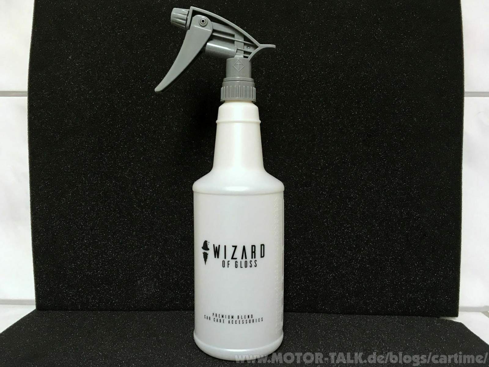 Es gibt nun sogar schon eine Wizard of Gloss Leerflasche. Im Prinzip gibt es diese Flasche aber schon von Herstellern wie z.B. Meguiar's oder Auto Finesse. Sie fasst 964 ml und hat einen chemieresistenten Sprühkopf. Den Sprühstrahl kann man von einem geraden Punktstrahl bis hin zu einem feinen Sprühnebel verstellen. An der Seite der Flasche sind Volumen- und Verdünnskalen angebracht. Und es gibt eine Stelle, wo man hinschreiben kann was man eingefüllt hat. Was man sagen muss, dass das Material nicht so dick ist, wie das von einer Kwazar Sprühflasche.
