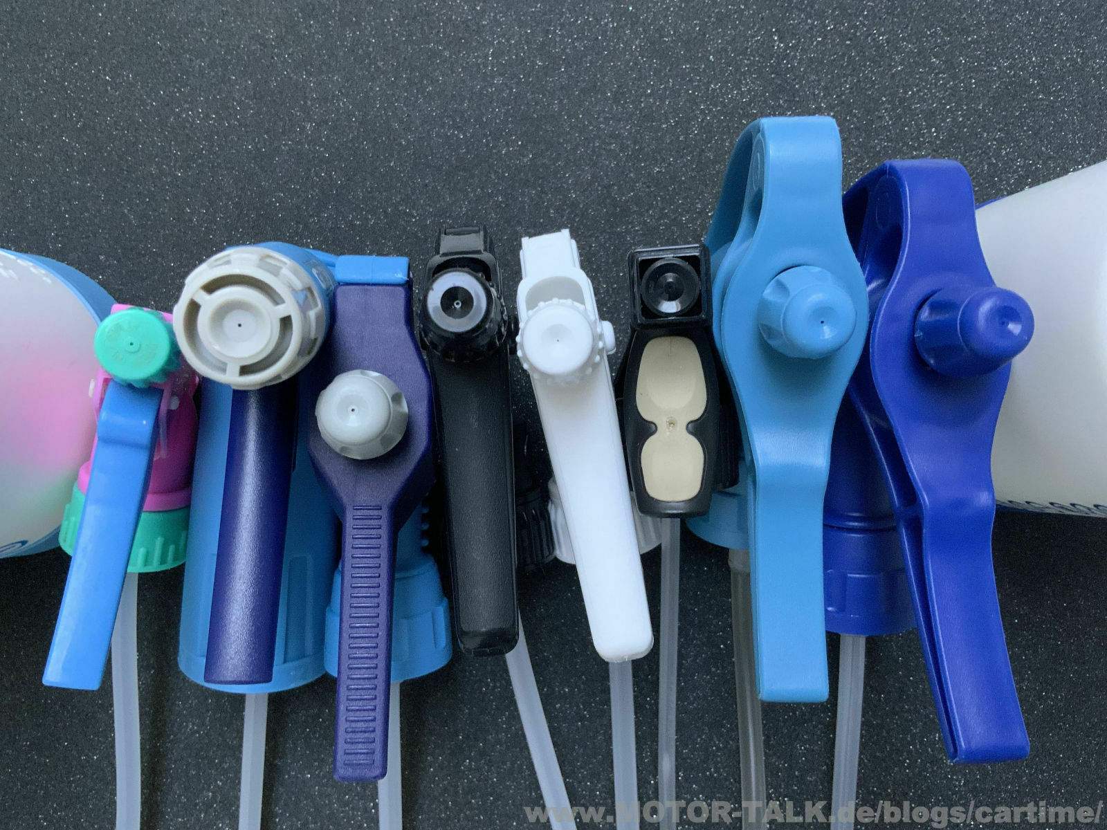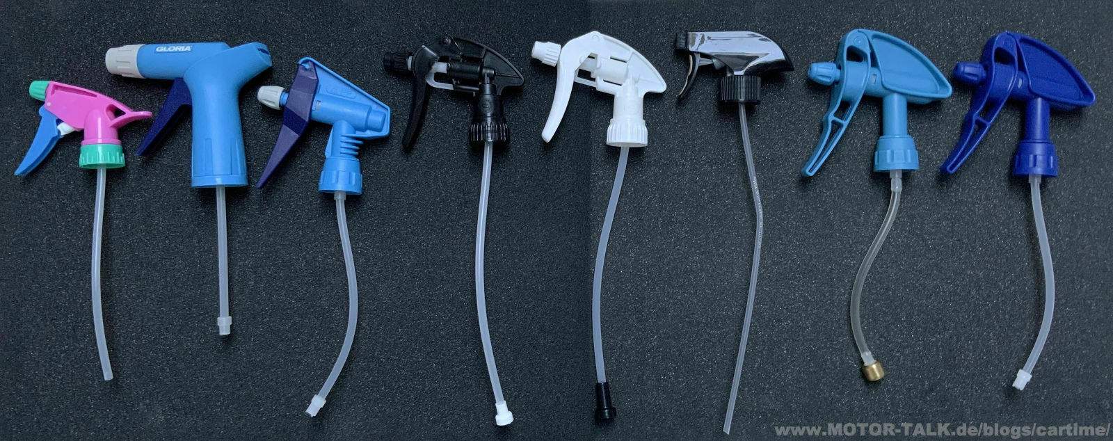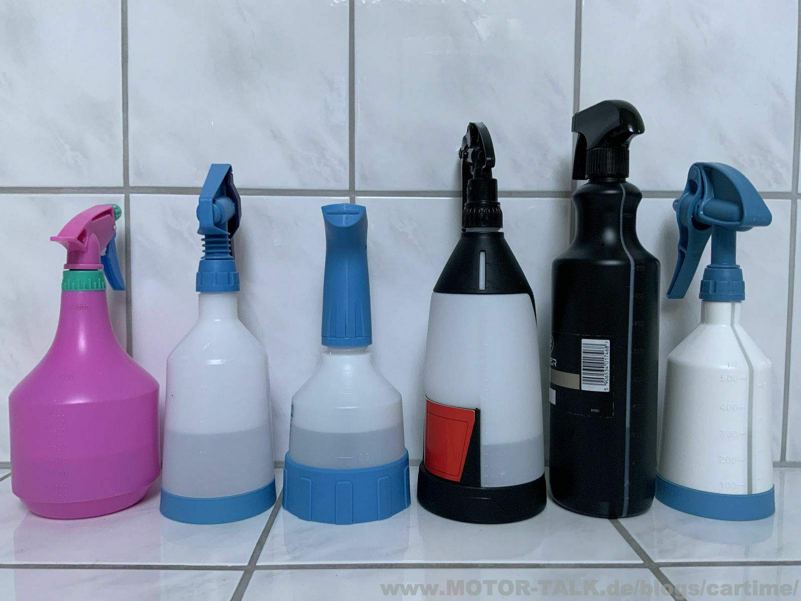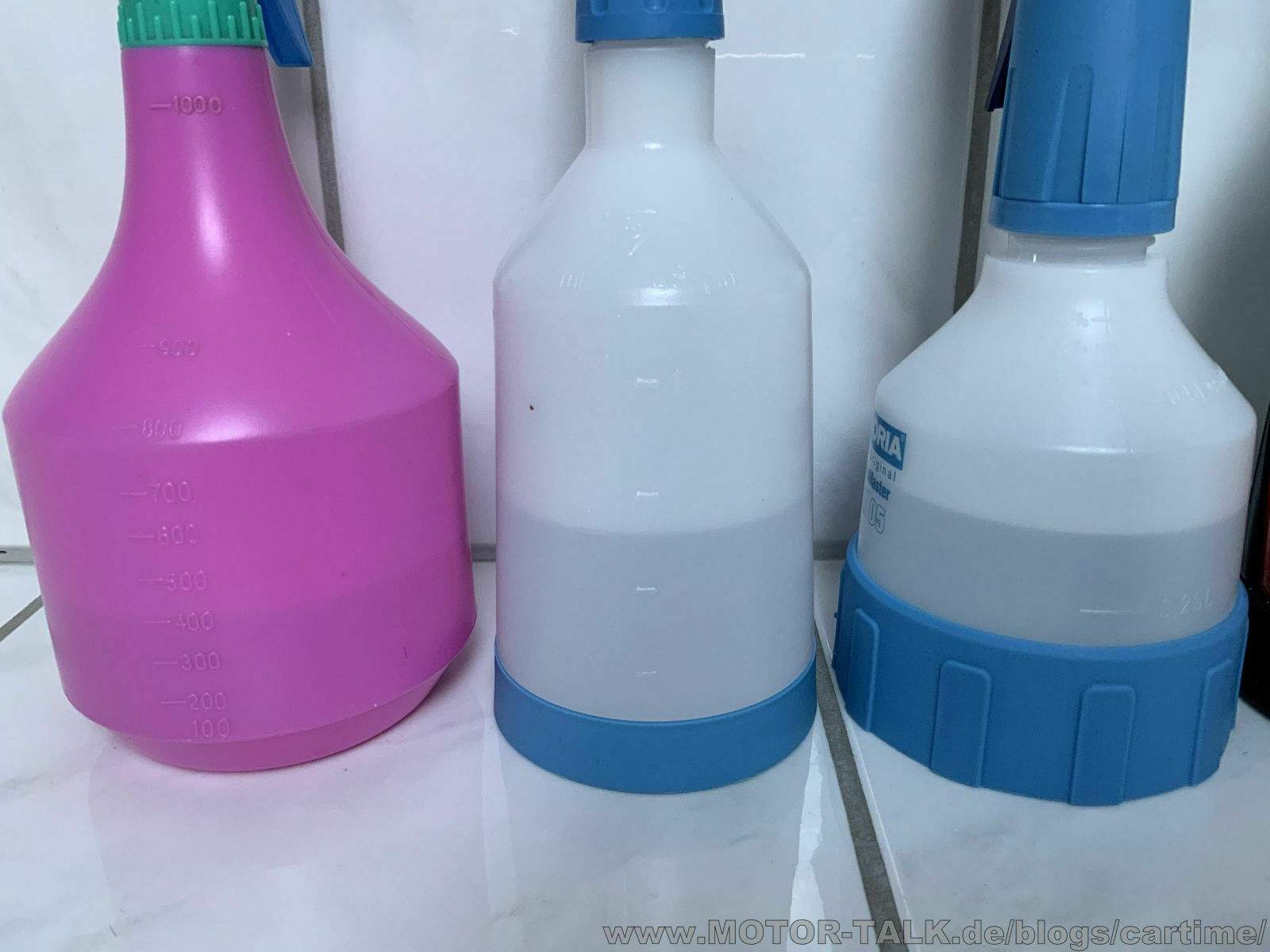 sie sind ein wichtiges Utensil bei der Autopflege, die Sprühflaschen. Ob schon bei den normalen handelsüblichen Produkten von Sonax, Dr. Wack & Co oder als einzelne Leerflaschen. Und genau die schauen wir uns mal an. Oft kommt ein Produkt als Konzenrat und muss erst noch angemischt werden. Oder man verdünnt einige Produkte. Ein anderer Grund ist es, dass man mit dem Sprühkopf gar nicht zufrieden ist. Da fällt mir als Beispiel der Tuga grün als erstes ein. Ich habe hier einige Leerflaschen. Was können sie, was ist besonders….