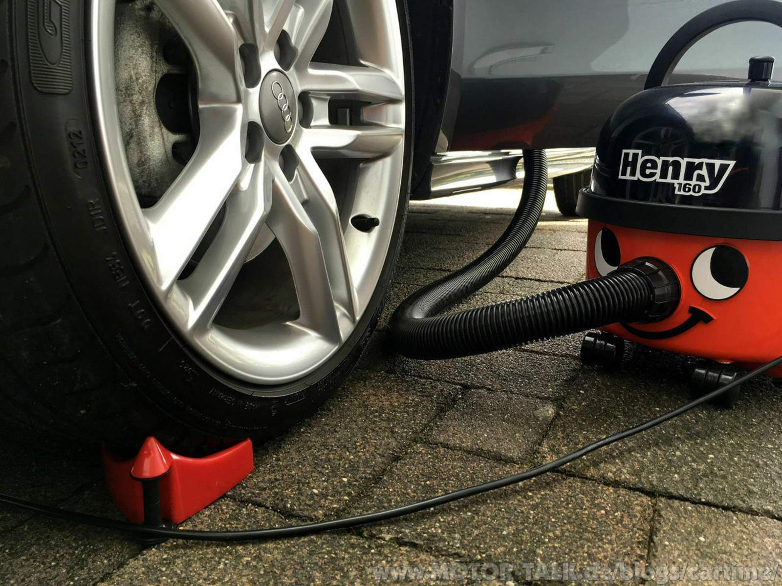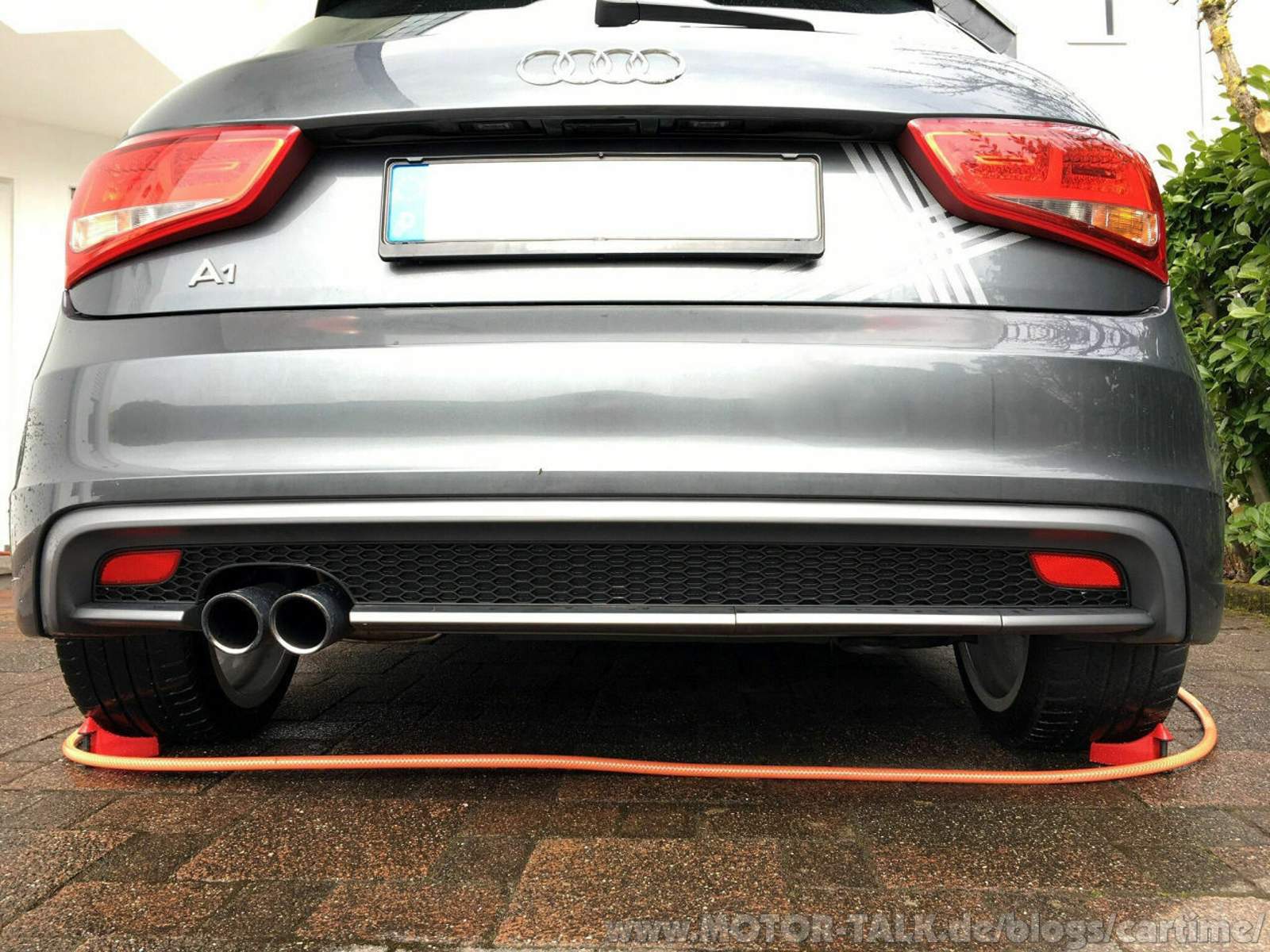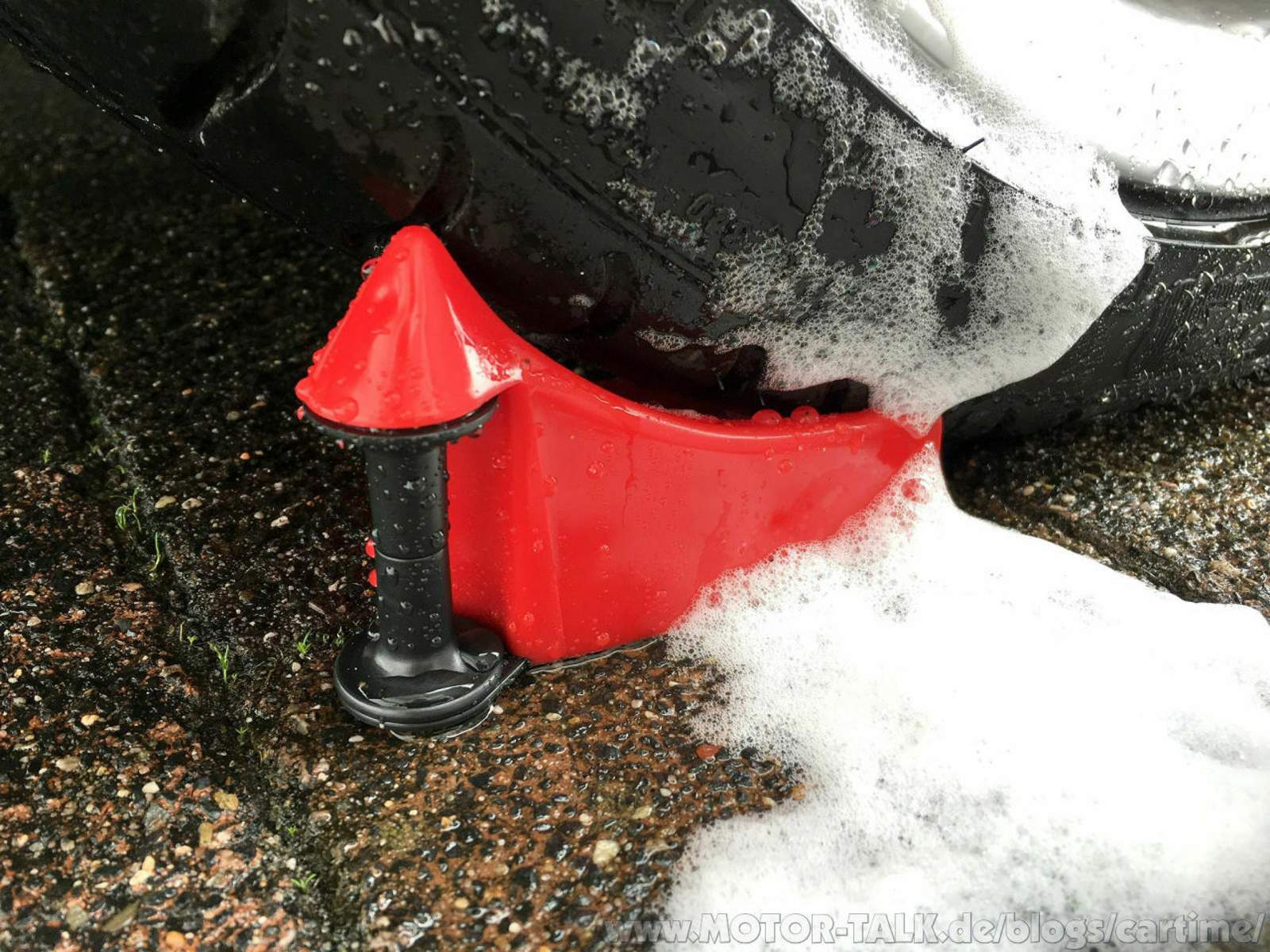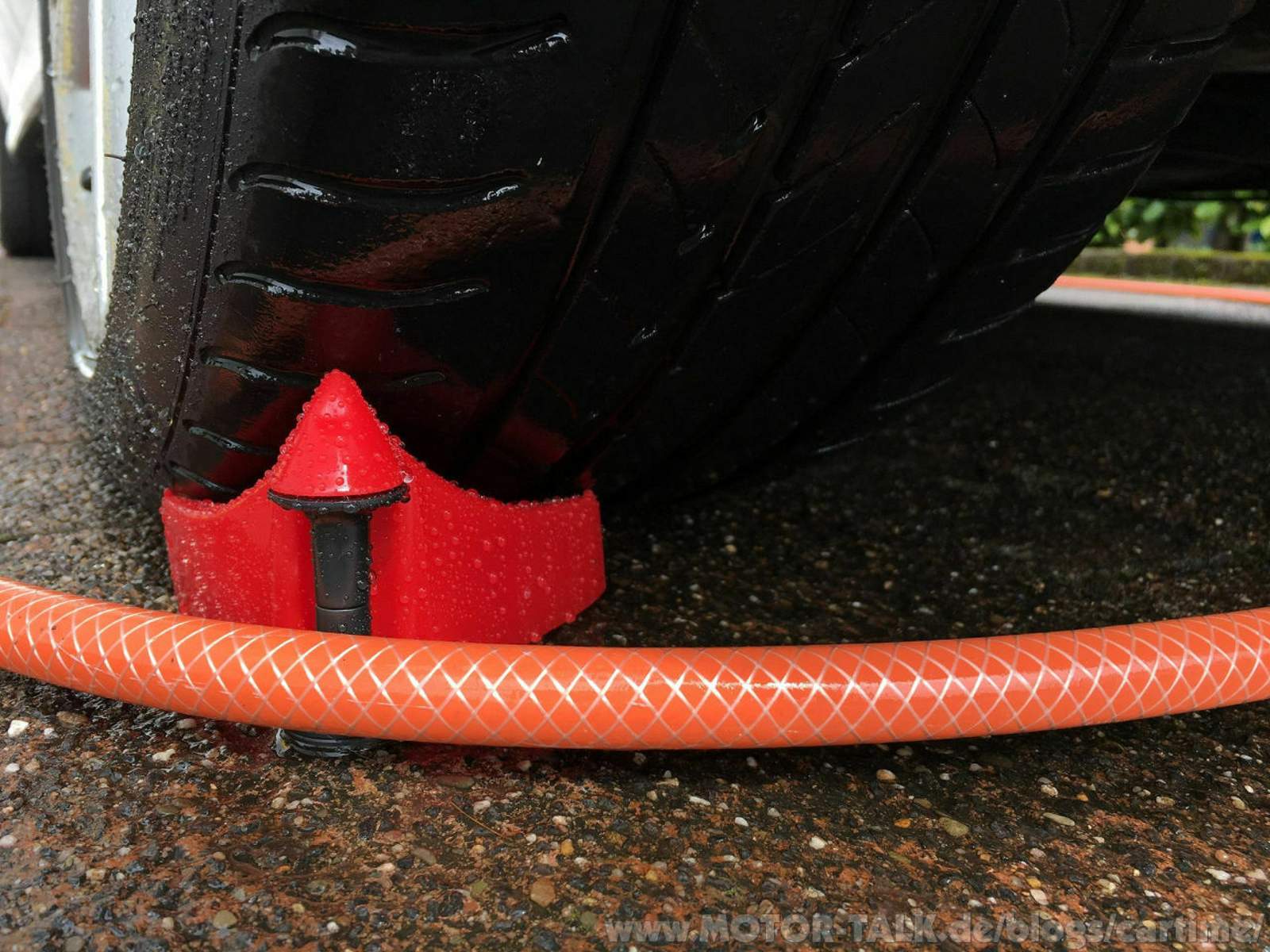 Man steckt den Einklemmschutz einfach fest unter die Reifen. Aber wirklich fest drücken, nicht nur locker anlegen! Das passierte bei mir in 40 Sekunden. Passend ist das ganze für jeden Reifen, unabhängig von der Größe. Durch die Umlenkrollen wird nun der Schlauch einfach um das Fahrzeug geführt. Das funktioniert übrigens auch mit dem Stromkabel der Poliermaschine oder dem eines Staubsaugers. Aber auch Abseits der Autopflege, wenn man z.B. zum Blumen gießen mit Gartenschlauch zum Garten am Auto vorbei muss. Es gibt auch eine Öffnung wo man sie aufhängen kann.