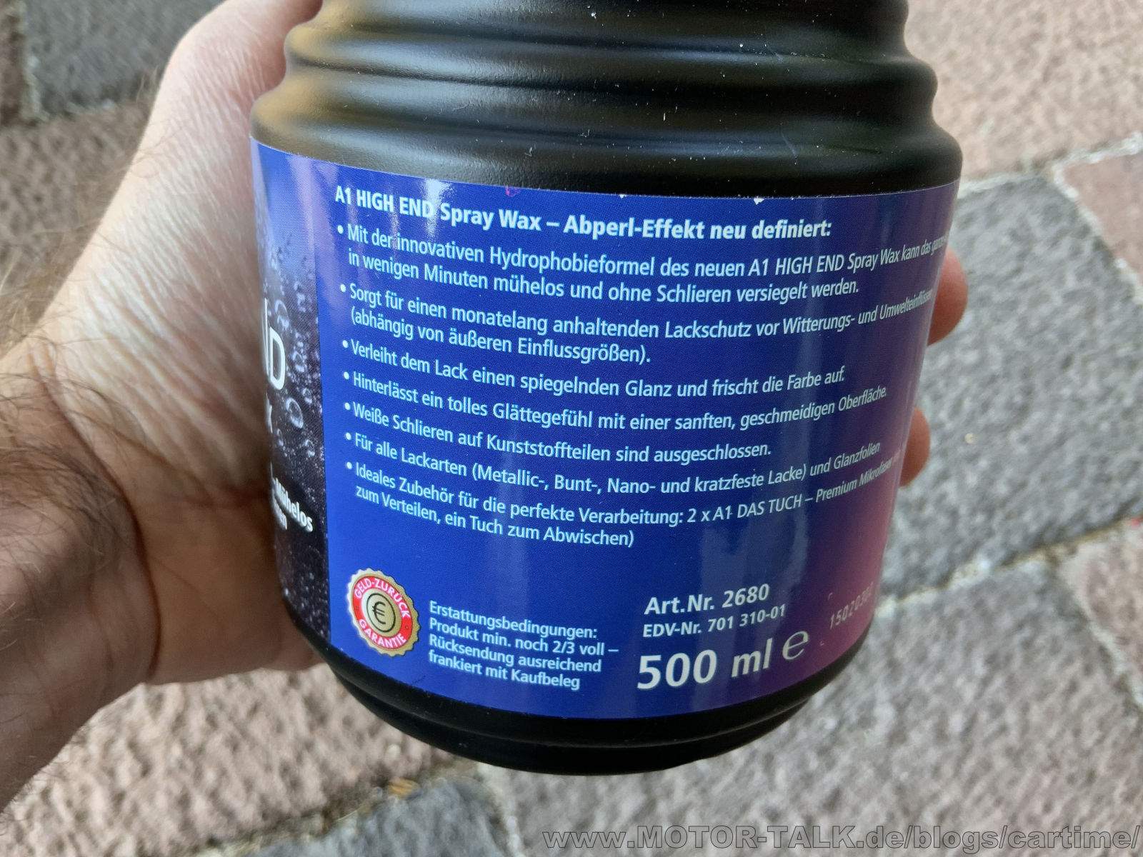 Komplett neu ist der A1 HIGH END Speed Detailer. Als normalen Detailer für nach der Wäsche z.B. zum Entfernen von Wasserflecken oder als Booster für die vorhandene Wachs- oder Versiegelungsschicht. Harmoniert lt. Hersteller auch mit Keramikversiegelungen. Hervorgehobenen wird hier noch ein starkes Beading und eine starke Lackglätte. Auch hier gibt es keine weißen hellen Schlieren auf Kunststoff.