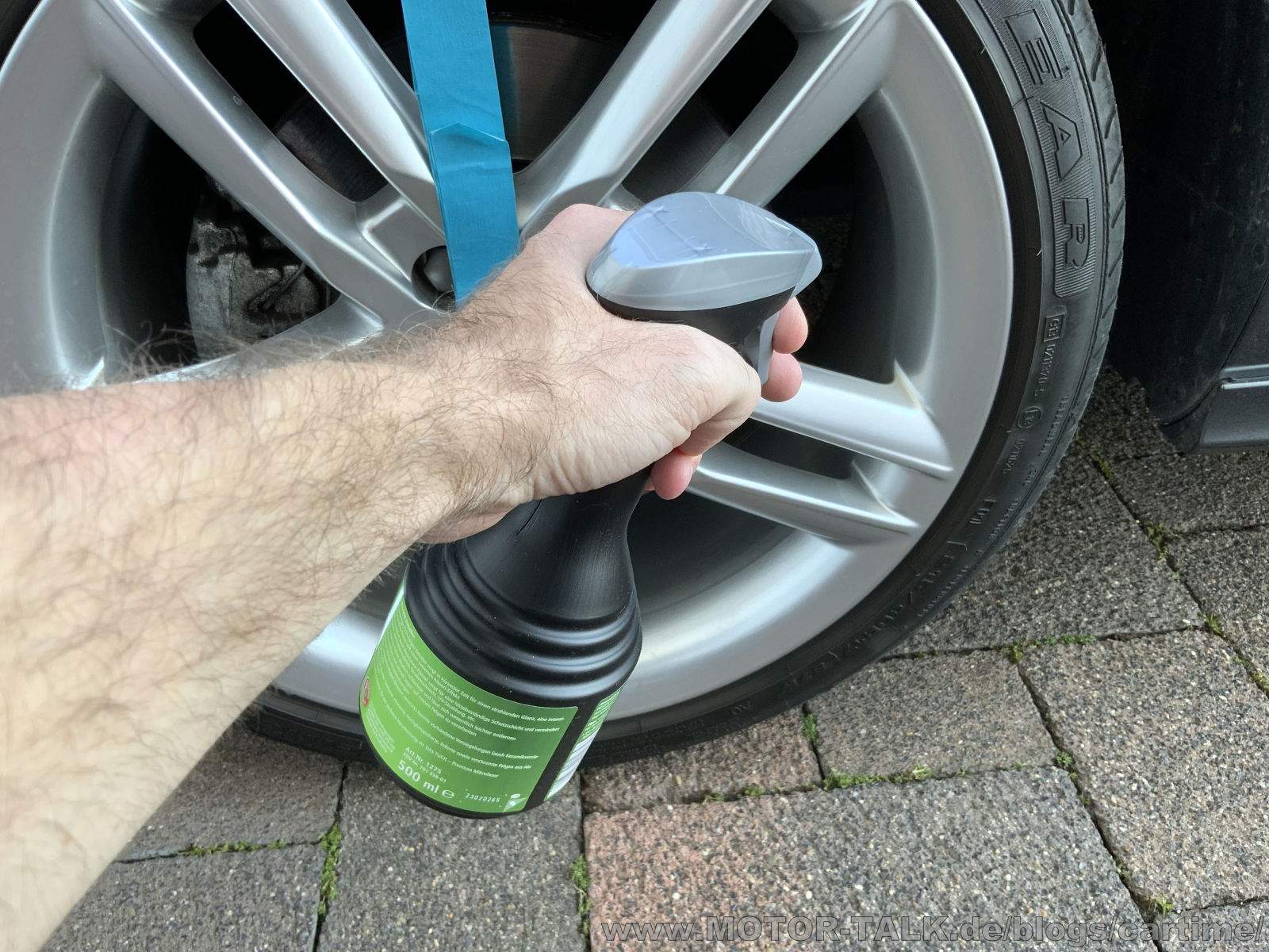Um das Produkt besser testen zu können, teste ich es nur die Hälfte der Felge. So habe ich später den besseren Vergleich. Habe mir etwas von dem Felgen Detailer auf die Felge gesprüht. Habt ihr enge Speichen könnt ihr es auch auf Tuch sprühen und damit verteilen. Dann anschließend mit einer trockenen Tuchseite oder einem frischen Tuch nachpolieren bzw. Reste abnehmen. WICHTIG, nicht in praller Sonne oder auf heißen Felgen anwenden! Im Idealfall sollte nun 2 Stunden kein Wasser auf die Felge kommen.