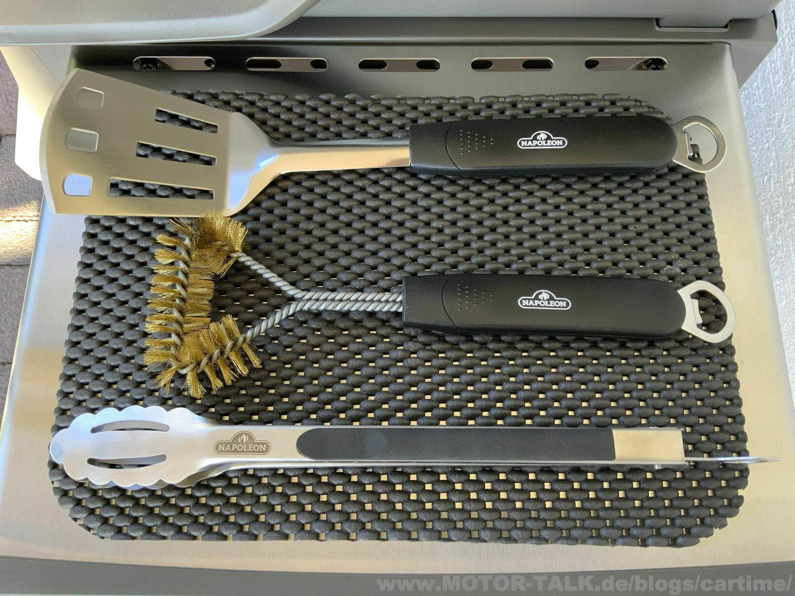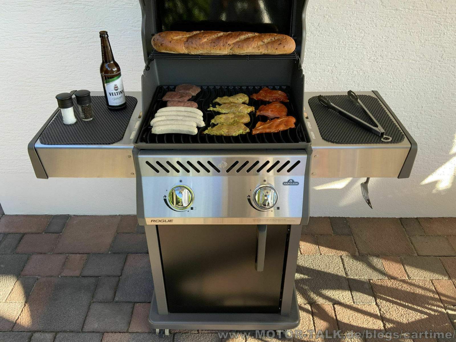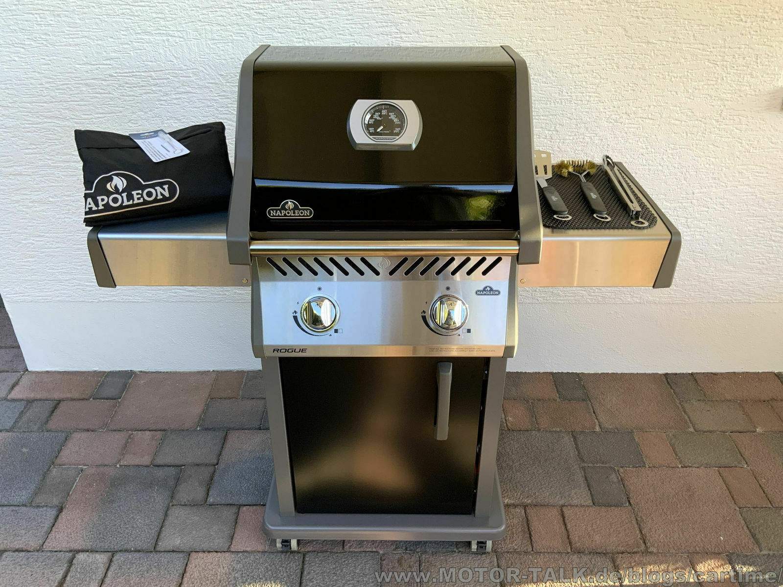 Uns fiel der „kleine“ Rogue 365 auf. Ein feiner 2-Brenner Gasgrill. Man erklärte uns die technischen Daten und sonstige Merkmale des Grills. Natürlich gibt es noch größere mit Sizzle Zone (ist der Seitenbrenner) oder generell mehreren Brennern. Doch der kompakte Rogue 365 gefiel uns so. Der sollte es werden, mitgenommen war er, der "kleine" Nappi Grill. Als Zubehör noch eine Abdeckhaube, etwas Grillbesteck und Feuermeister Grillhandschuhe.