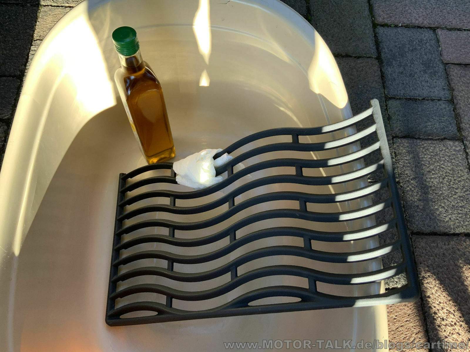 Zunächst habe ich die Gussroste zum Einbrennen mit pflanzlichem Öl eingerieben. Das muss man nicht unbedingt schon sofort am Anfang. Da scheiden sich die Geister. Aber schaden kann es nicht.