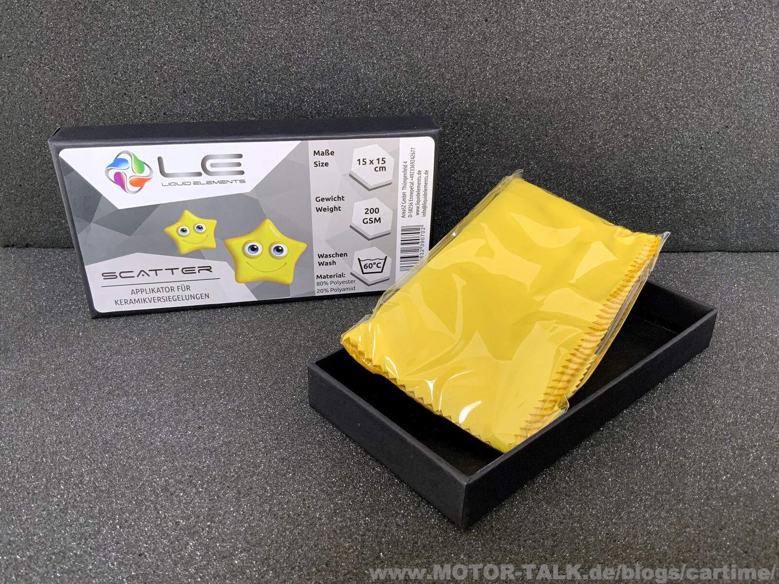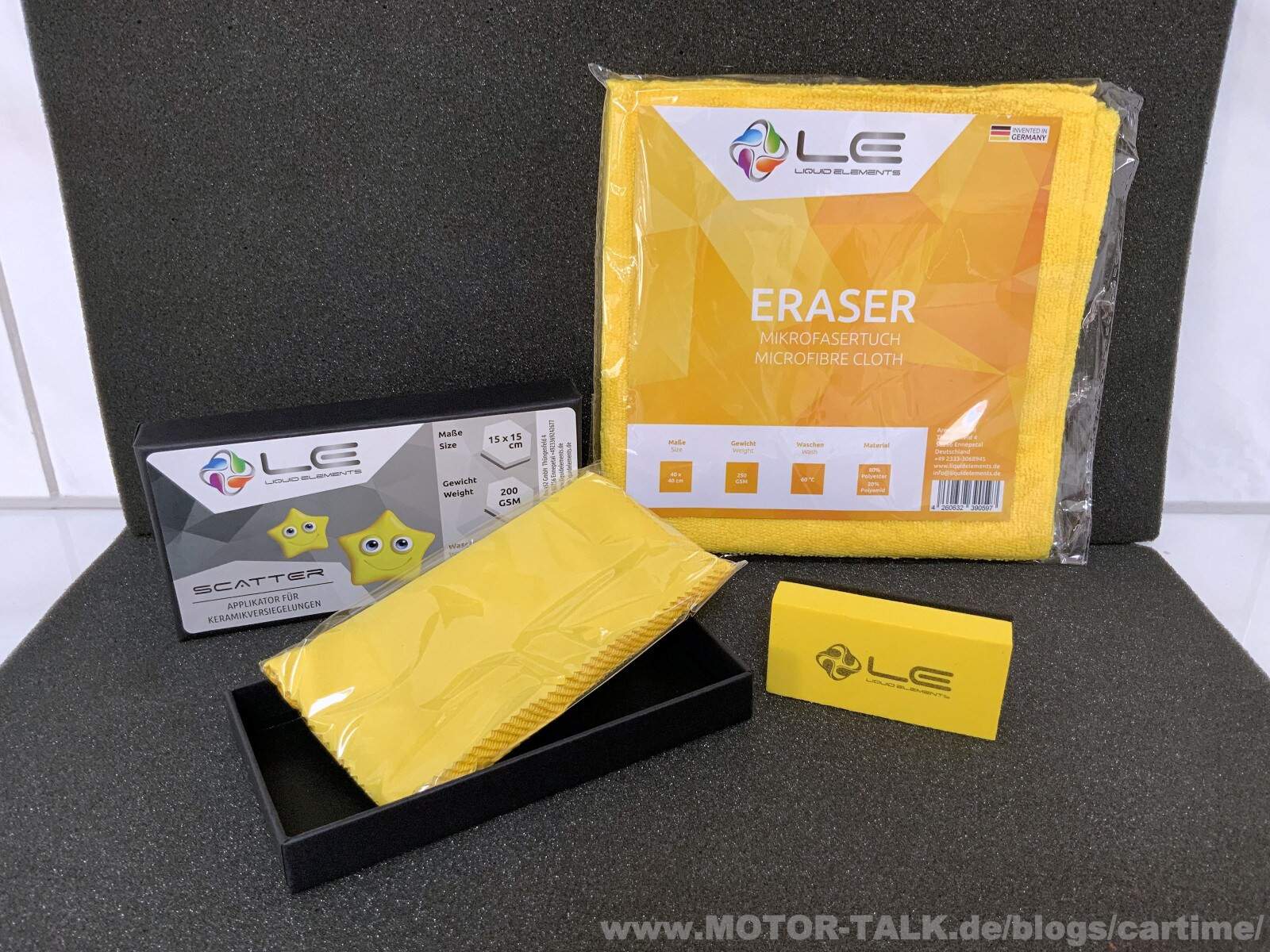 Nun packe ich die kleine Gyeon Q² Rim Box aus. Darin findet ihr neben der Versiegelung eine Anleitung, vier Suede Wildledertücher und ein Applikator.