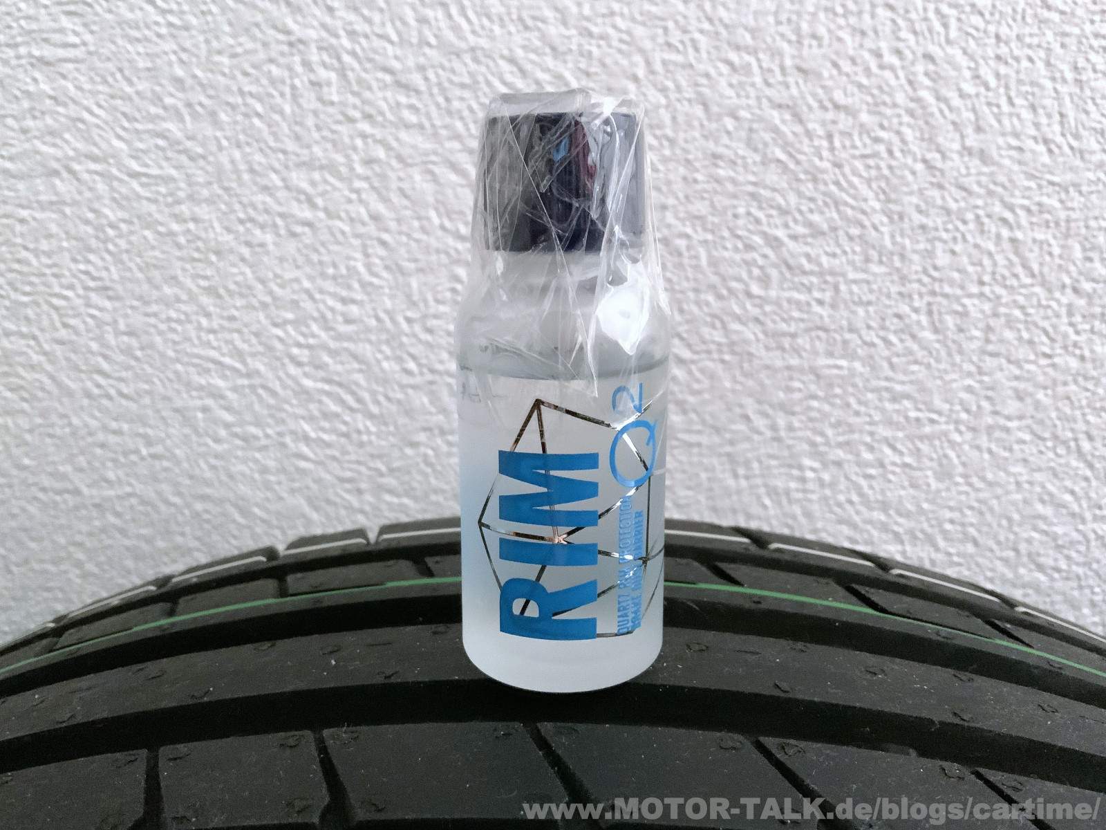Die kleine Glasflasche mit dem Rim dreht ihr wieder fest zu und klebt sie am besten noch zusätzlich ab. Der Hersteller sagt unter Idealbedingungen (kühl, trocken & luftdicht verschlossen) ist sie ca. 6 Monate haltbar. Müsste man mal ausprobieren, ob es evtl. auch länger hält. Falls Sie mal Luft gezogen hat und sich nach Jahren Kristalle gebildet haben, ist sie jedoch meist nicht mehr zu gebrauchen. Hier im folgenden Bild übrigens zusätzlich noch zu sehen, der geringe Verbrauch nach 4 Rädern (18 Zoll).