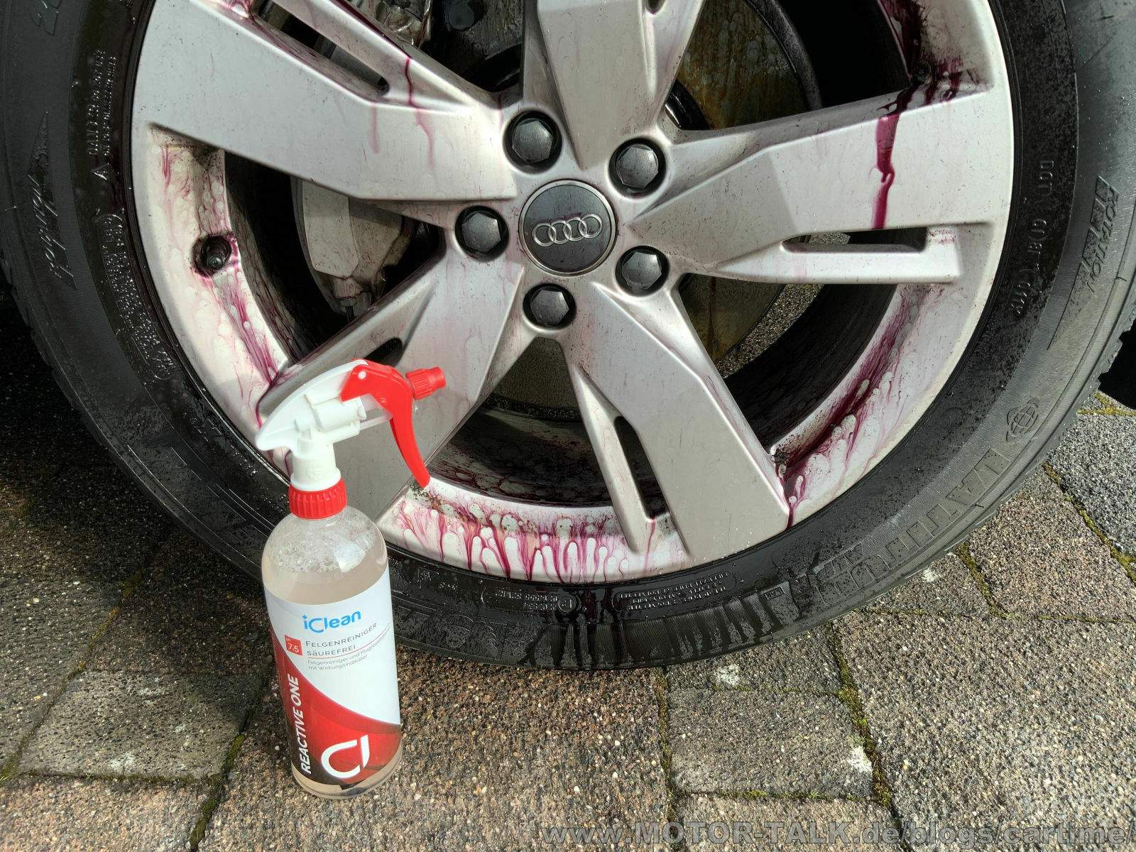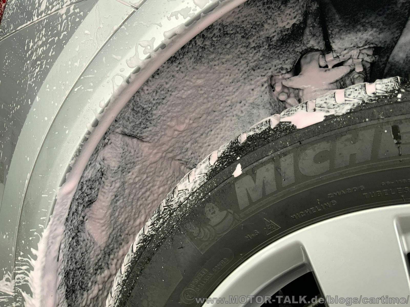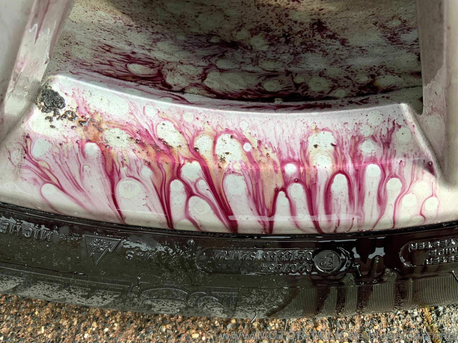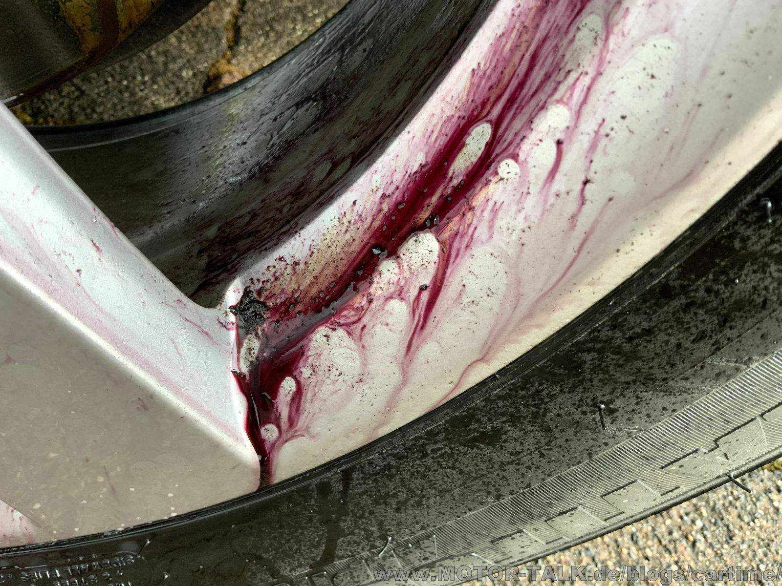 Einen pH-neutralen Felgenreiniger gibt es auch. Er ist etwas gelartig und riecht gar nicht so schlimm, wie von vielen gewohnt. Als Einwirkzeit sind 3-5 Minuten angegeben. Da fängt er auch relativ früh schon an zu wirken und färbt sich dunkellila. Richtig blutig. Dann wird abgekärchert.