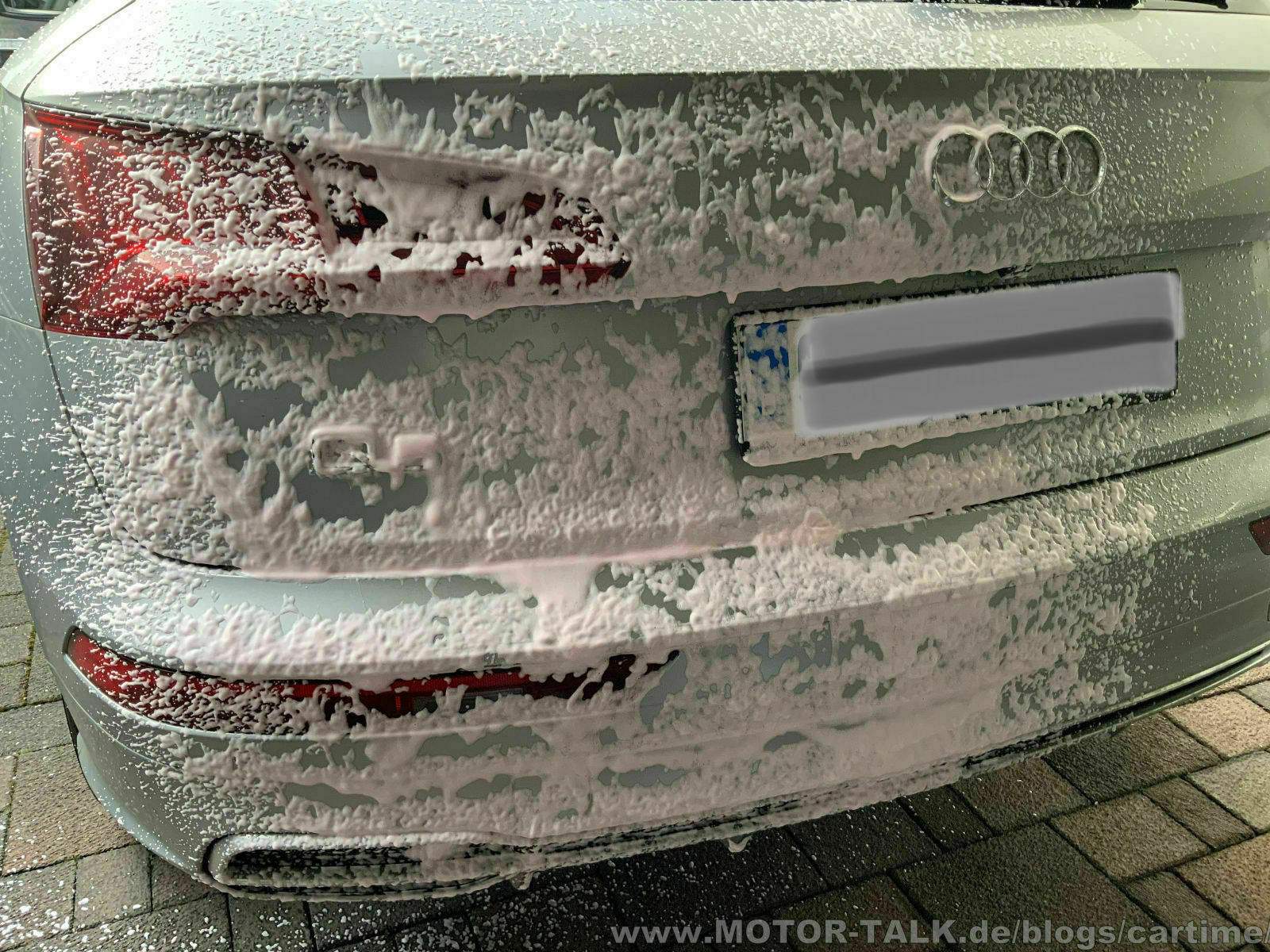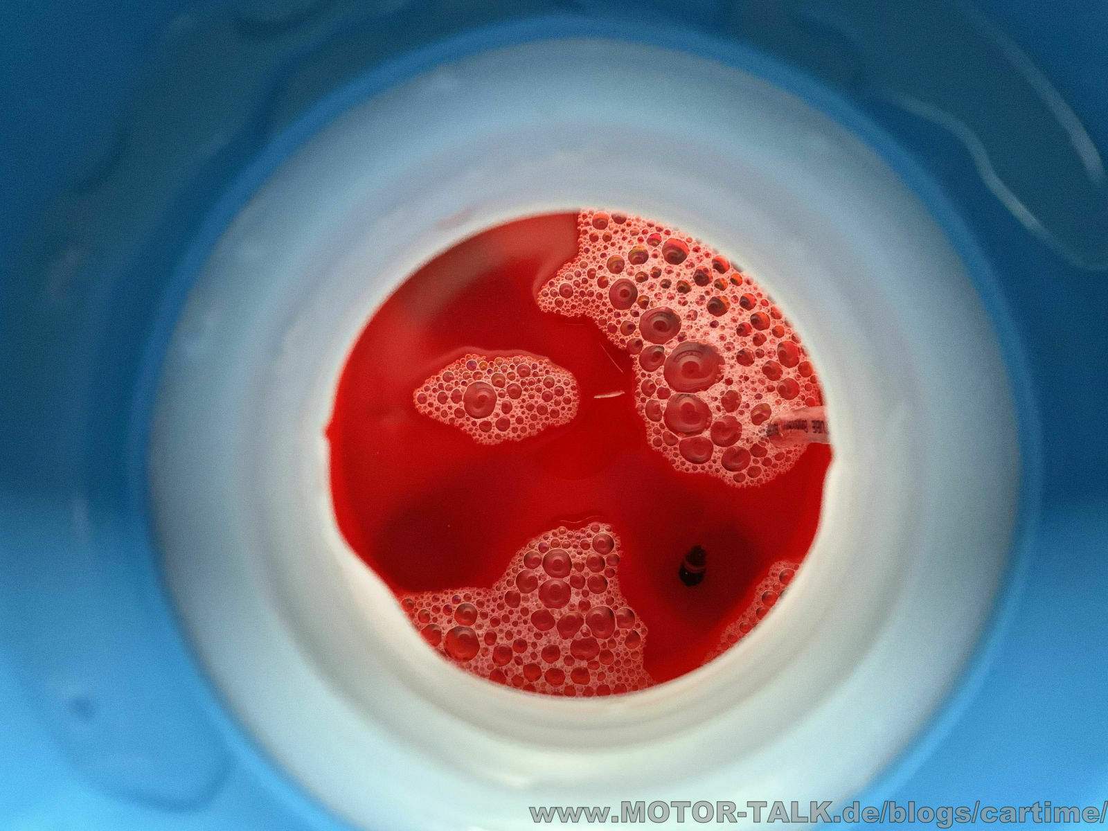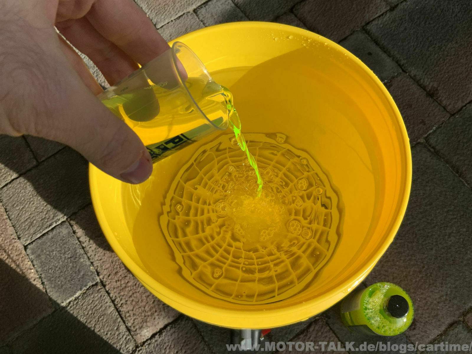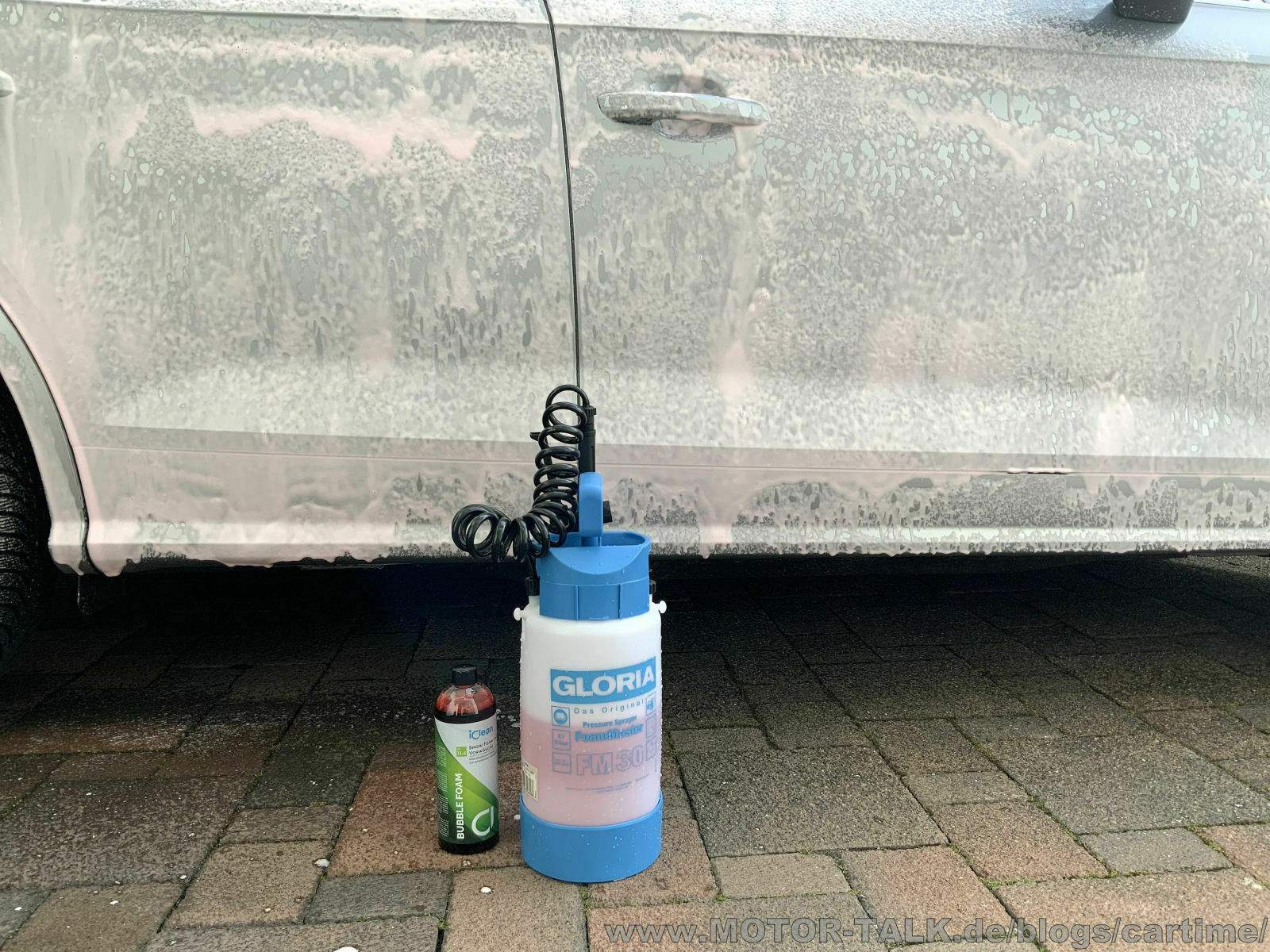 Man gibt um die 20-40 ml Bubble Foam pro 1L Wasser hinzu. Ich habe es bei meinem Schaumsprühgerät, der Gloria FM 30 (3L) mit 50 ml versucht. Später habe ich dann gemerkt, dass es in Verbindung mit dem schwarzen Filter doch zuviel war. Ich habe den blauen gewählt. Später kann man dann doch sparsamer dosieren. Der Schaum haftet beim zweiten Versuch sehr gut an. Die Gloria arbeitet wie immer super mit. Dabei gehe ich beim Frühjahrsputz auch noch detaillierter vor, in die Radkästen und in kleine Ecken und Randbereiche vom Diffusor als Beispiel.