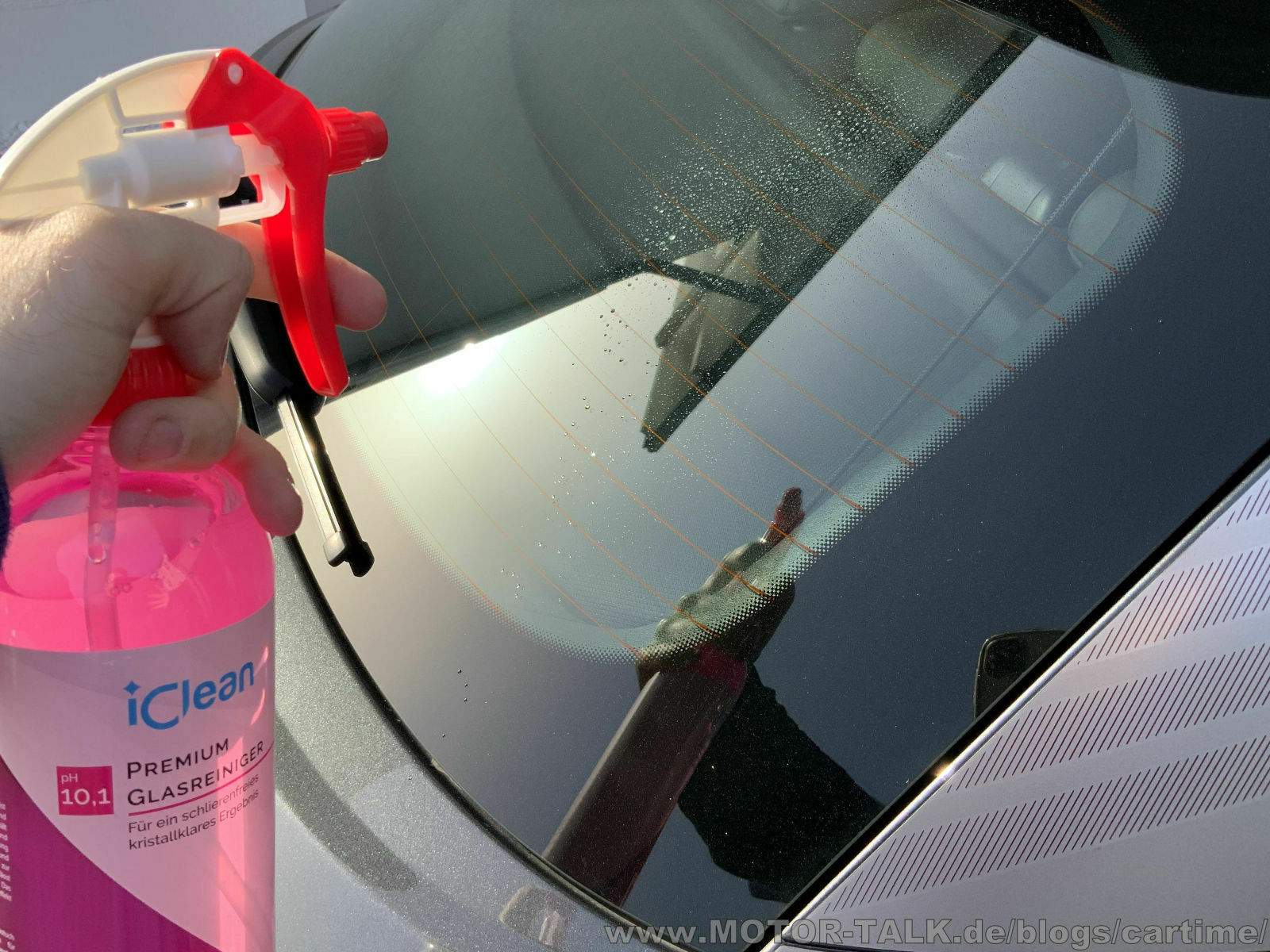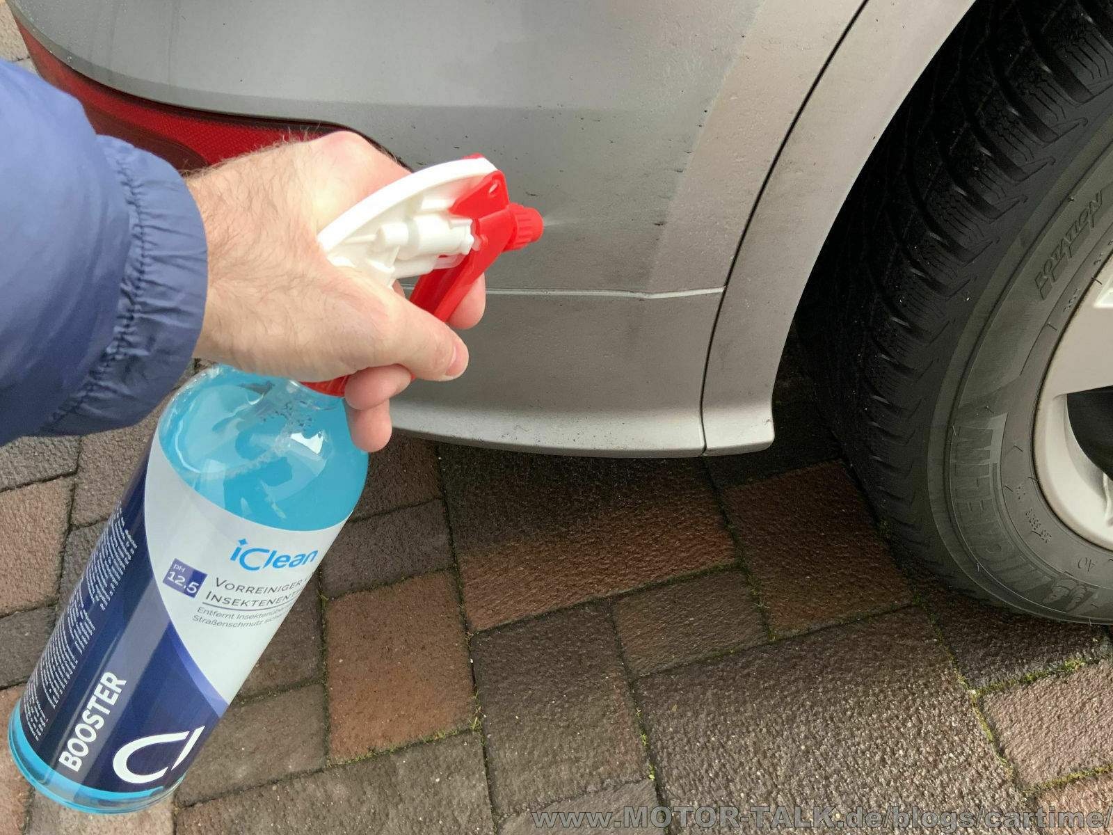 Wenn man starke Verschmutzungen hat, was ja nach dem Winter keine Ausnahme ist, gibt es bei iClean den Booster. Für den Sommer ist er dann gleichzeitig ein Insektenentferner. Jetzt im Winter sprühe ich zusätzlich etwas an die Schweller und hinter die Radhäuser. Sodass sich der Schmutz gut lösen lässt. Dem gibt man dann einen Moment Zeit zum Einwirken. Durch den Canyon Sprühkopf kann man auch problemlos größere Flächen einspühren. Anschließend wird alles abgekärchert. Man kann das dann auch mit dem Snow Foam verbinden. Hinweis: stark alkalisch, kann somit einen Lackschutz angreifen!