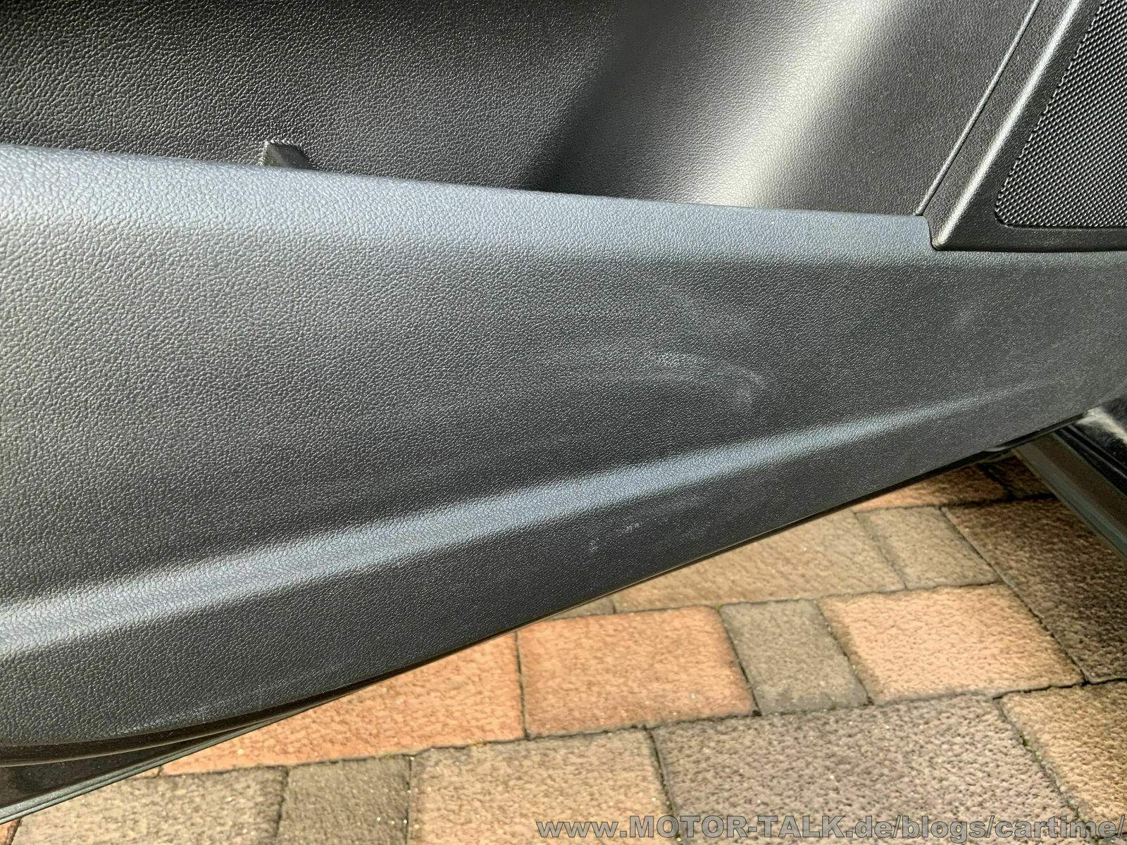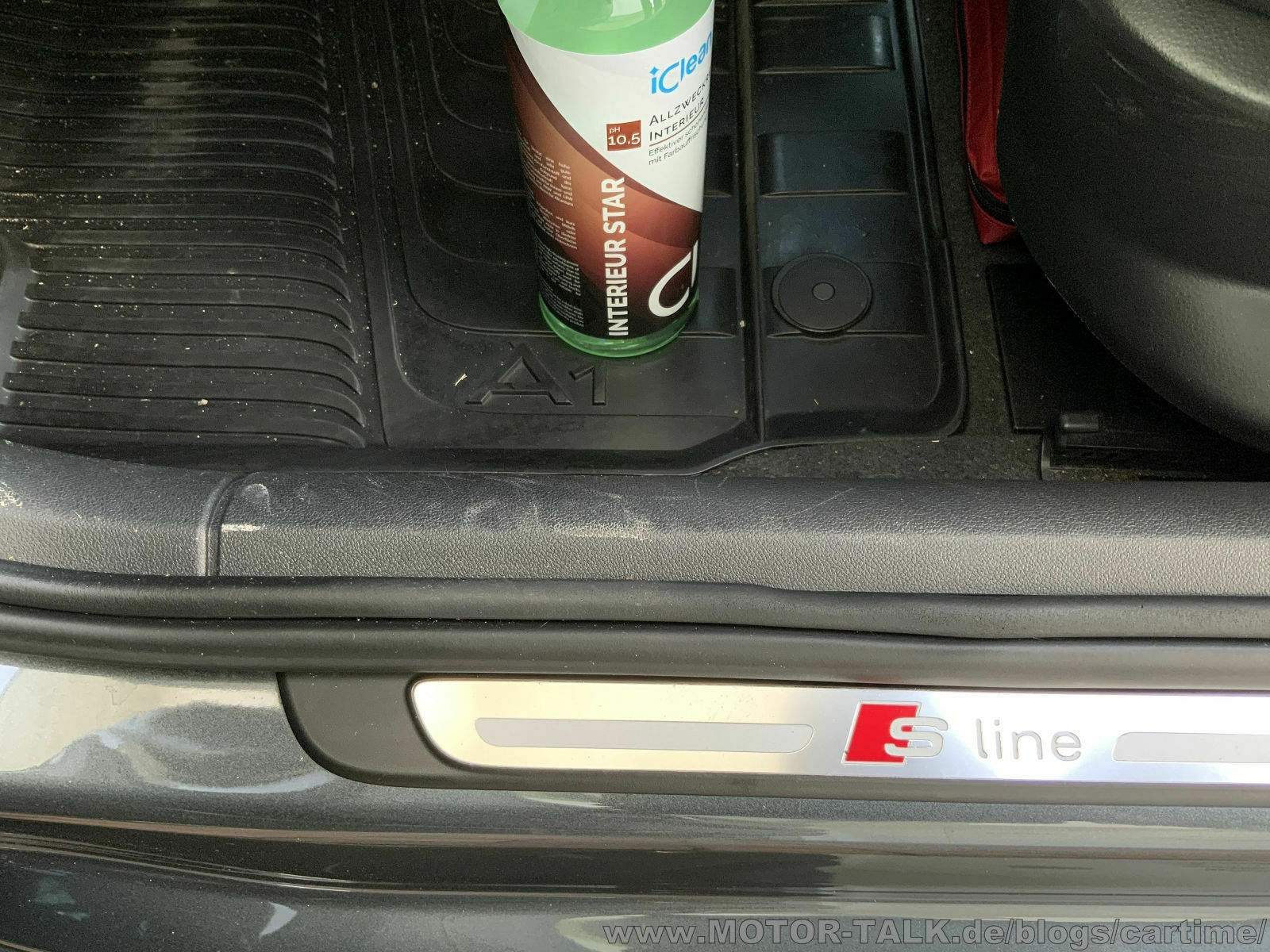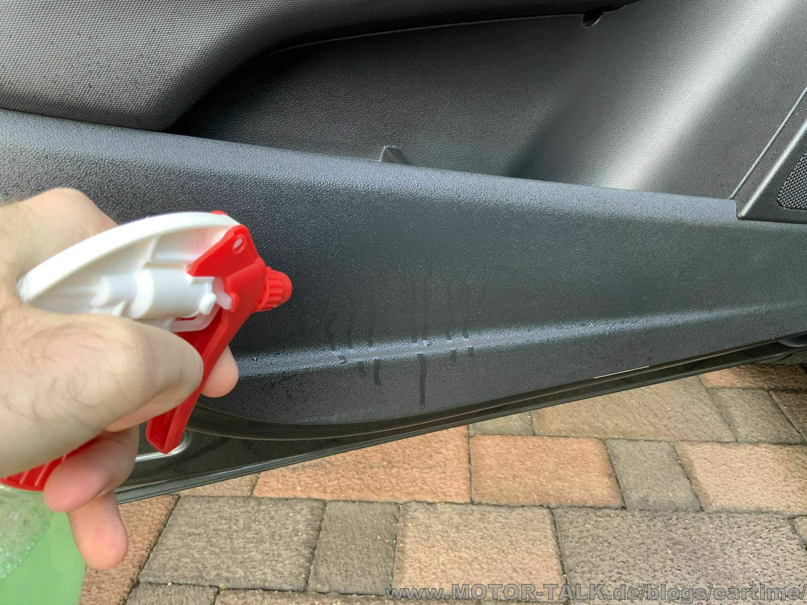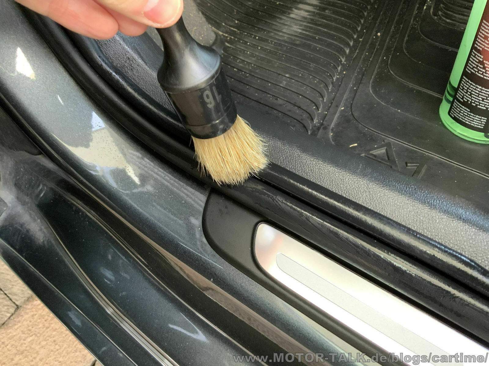 Der Innenraum sieht auch mehr nicht so gut aus. Die Einstiege sehen am schlimmsten aus. Gesaugt werden müsste auch mal wieder. Um die Reinigungswirkung zu unterstützen habe ich mir dort einen Pinsel zur Hilfe genommen. Der kommt auch in den strukturierten Kunststoff gut rein. Danach einfach mit einem Tuch abwischen, fertig. Ich konnte feststellen, dass sich nach dem Bearbeiten ein kleiner Glanzgad einstellte. Anwendbar ist der Interior Star auf Kunststoff und Textilien, aber Achtung, nicht auf Alcantara!