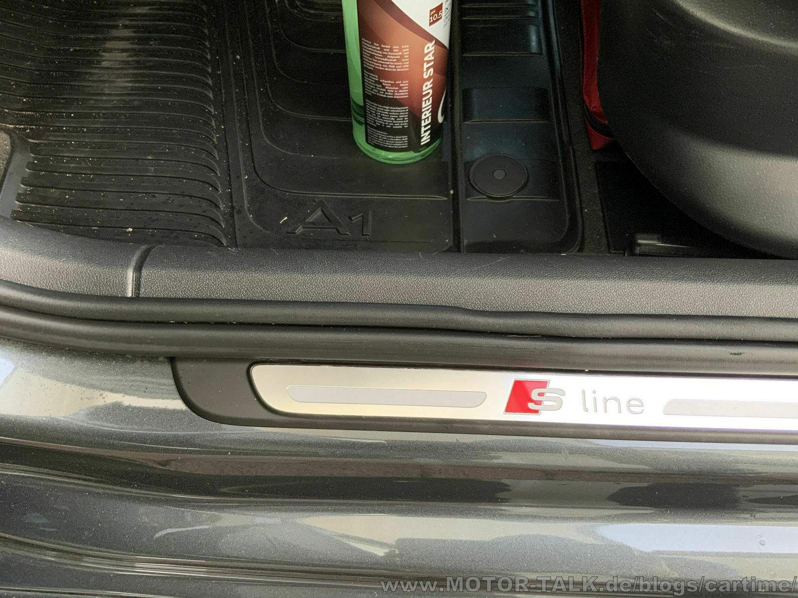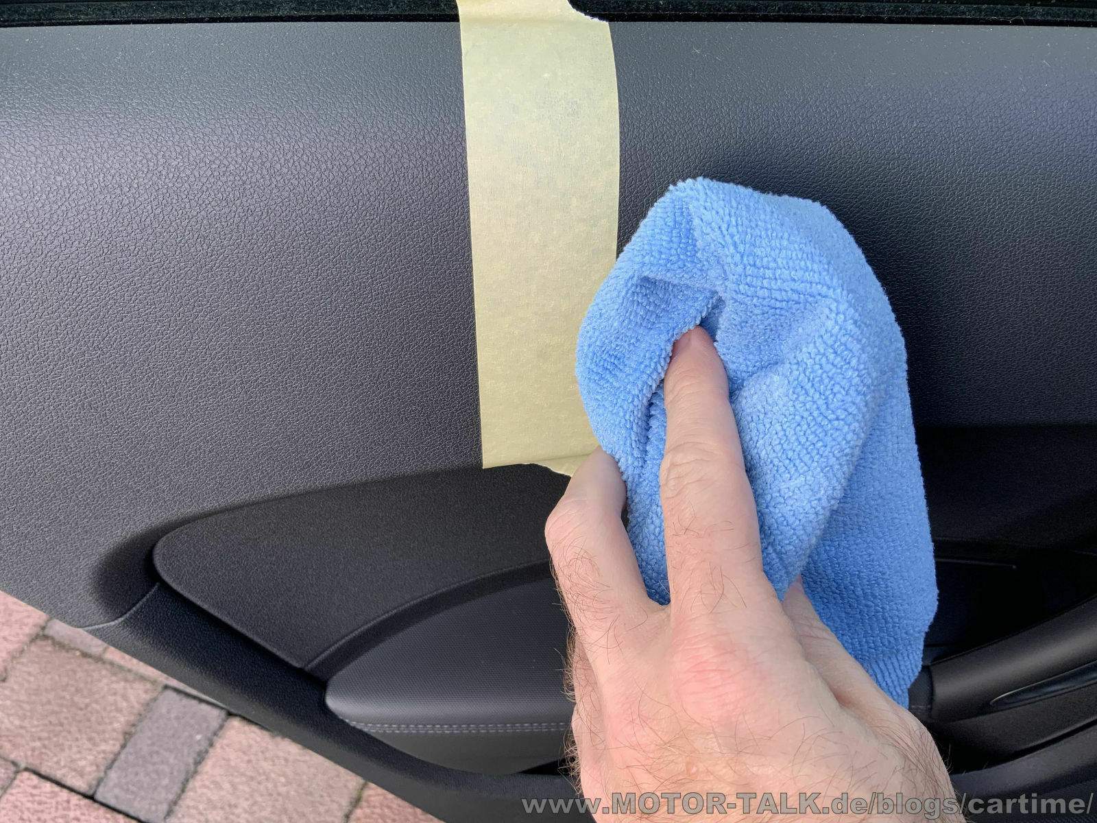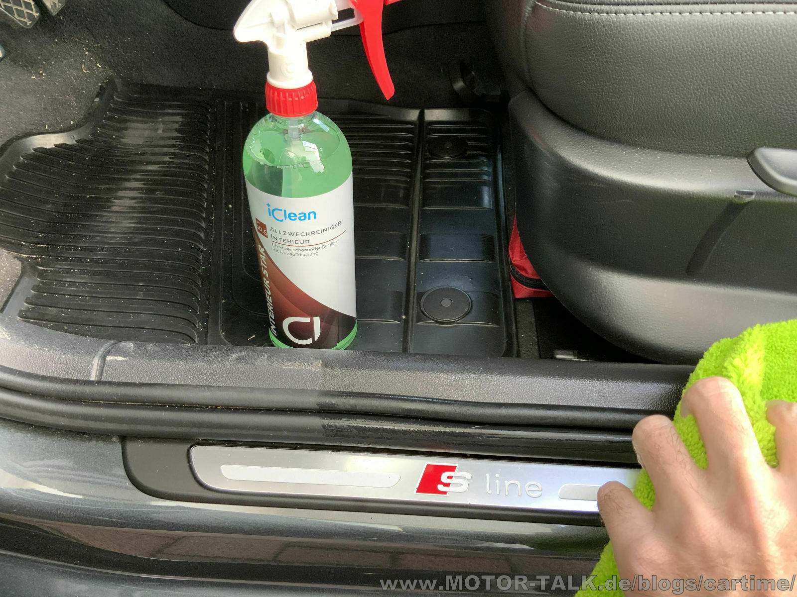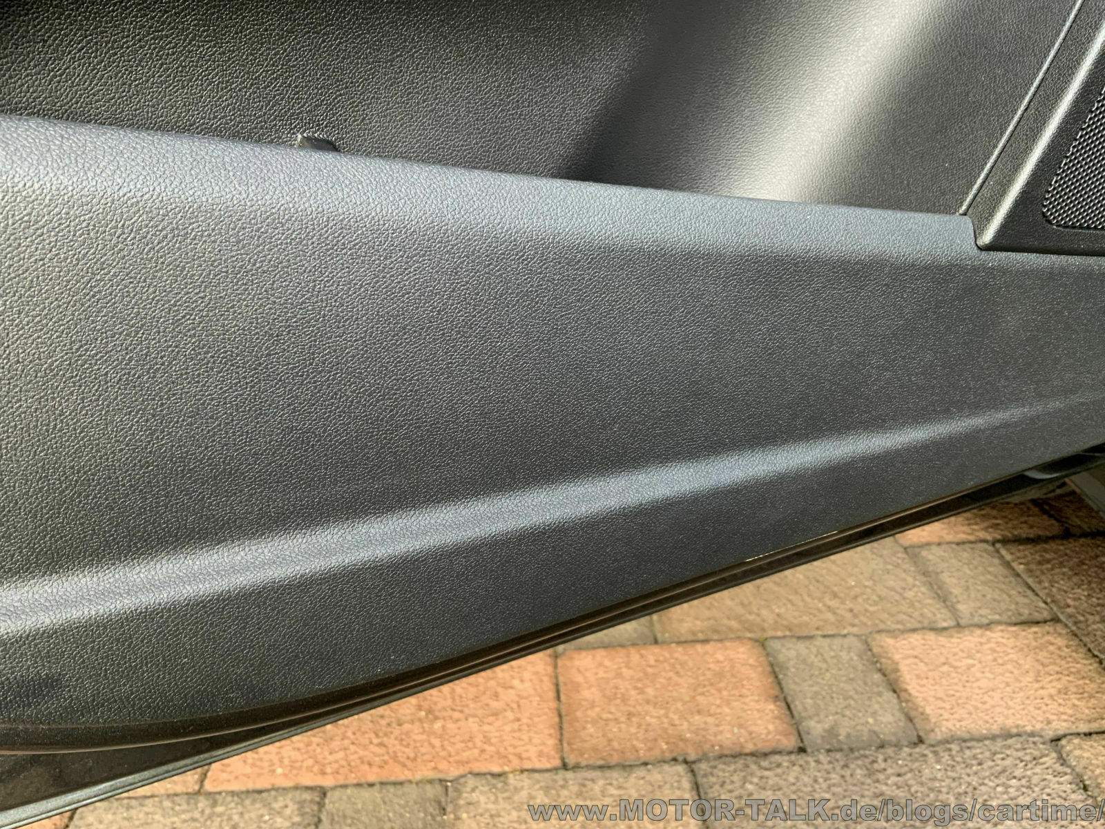 Der Innenraum sieht auch mehr nicht so gut aus. Die Einstiege sehen am schlimmsten aus. Gesaugt werden müsste auch mal wieder. Um die Reinigungswirkung zu unterstützen habe ich mir dort einen Pinsel zur Hilfe genommen. Der kommt auch in den strukturierten Kunststoff gut rein. Danach einfach mit einem Tuch abwischen, fertig. Ich konnte feststellen, dass sich nach dem Bearbeiten ein kleiner Glanzgad einstellte. Anwendbar ist der Interior Star auf Kunststoff und Textilien, aber Achtung, nicht auf Alcantara!