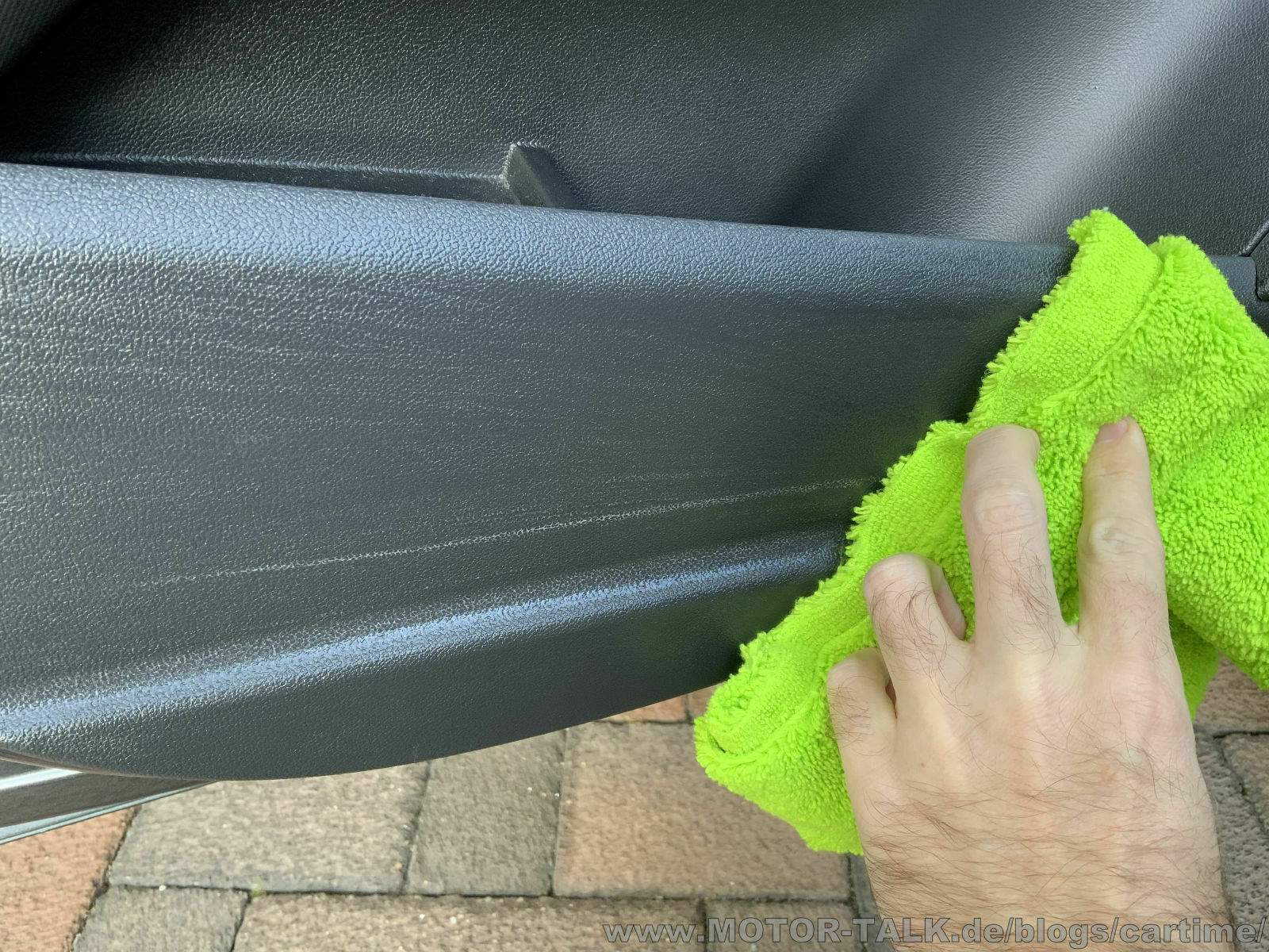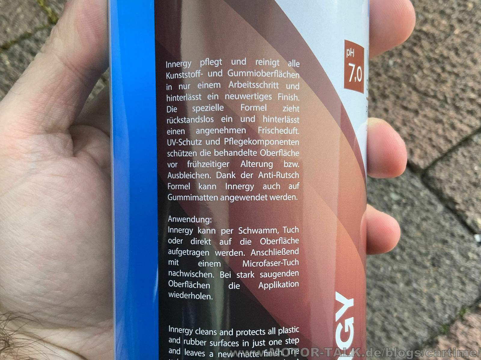 Um die gereinigen Kunststoffteile im Innenraum auch wieder bestmöglich zu pflegen gibt es den Innergy. Eine Innenraumpflege mit ganz ganz wenig Abdunklung. Sogar weniger als Koch Chemie RefreshCockpitCare. Gut dann, wenn man den Ist-Zustand halten möchte. Einfach mit einem Tuch oder Pad verteilen und je nachdem nochmal nachwischen. Hinweis: kann lt. Hersteller sogar auf Gummimatten verwendet werden. Es hat eine Antirutschformel. Das ist tatsächlich für so ein Produkt eher unüblich.