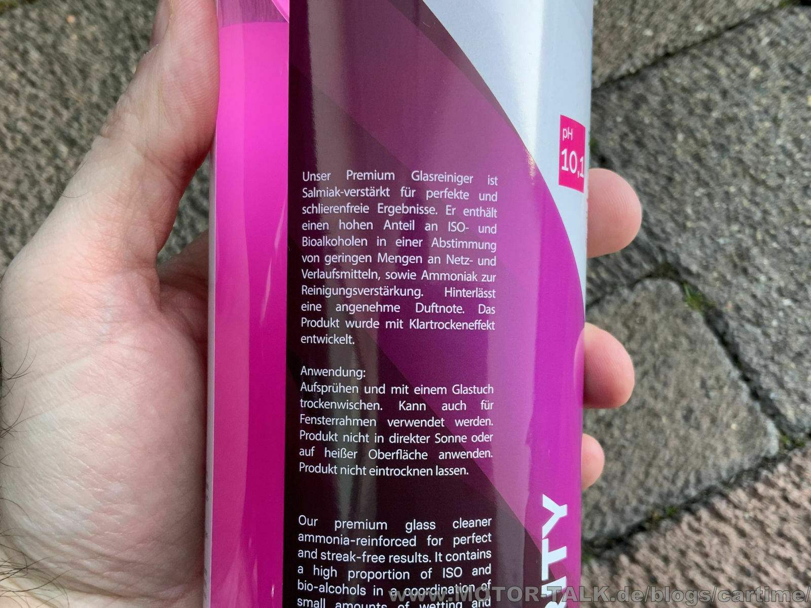 Der sogenannte Clarity ist der Glasreiniger im Sortiment und lässt sich durch den Canyon Sprühkopf k wie alle anderen auch, sehr gut zerstäuben. Zudem stinkt er nicht beißend nach Alkohol. Mit dem richtigen Glastuch reinigt er auch problemlos schlierenfrei. Da gibts nichts zu meckern. Hinweis: Nicht in der Sonne anwenden.