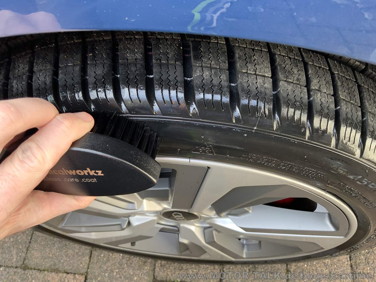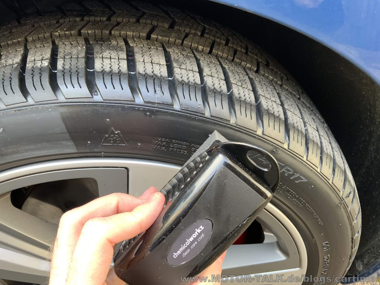 Der Tire & Cleaner hat gute Arbeit geleistet. Demnächst werde ich ihn auch mal verdünnt anwenden. Er bekommt den Reifen wieder in einen Neuzustand oder auch noch besser. Mit einem APC ist das auch möglich, aber nicht so schnell. Ich brauchte mit der Bürste nur einen Anlauf. Beim APC je nachdem immer 2-3 Runden im Vergleich. Das Protection als Pflege lässt sich sehr leicht auftragen und zieht gut ein. Selbst bei den 4 Grad, die ich beim Test hatte. Mit dem chemicalworkz Tire Pad macht man sich die Finger nicht schmutzig. Eine sehr gute preisgünstigere Alternative zum altbekannten Meguair‘s Tire Pad, welches ich damals schon sehr gut fand. Die Bürste hat mir nicht ganz so gut gefallen, lag zwar gut in der Hand, ist mir von den Borsten allerdings zu hart.
