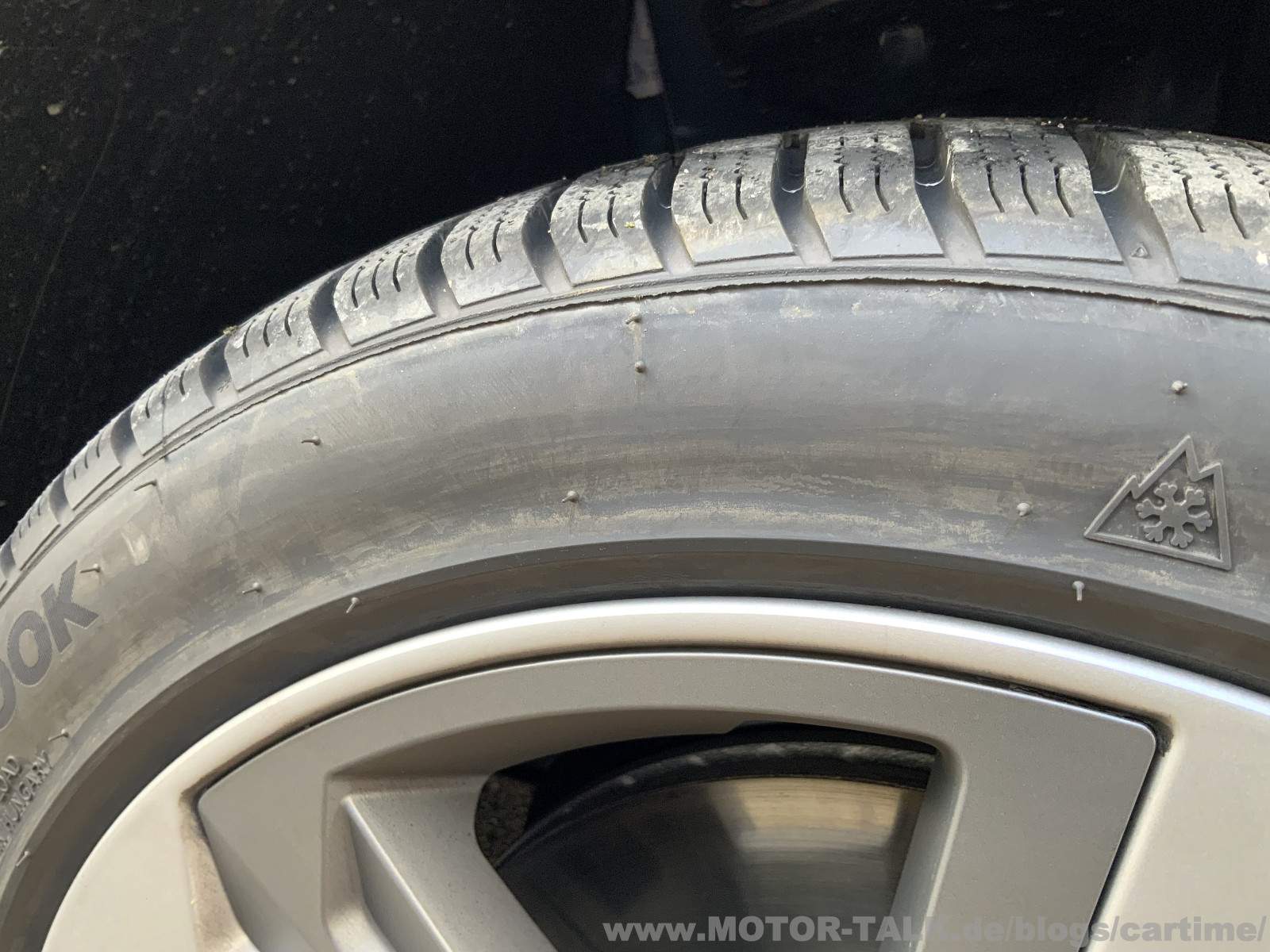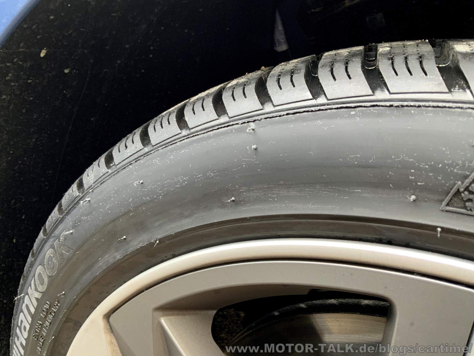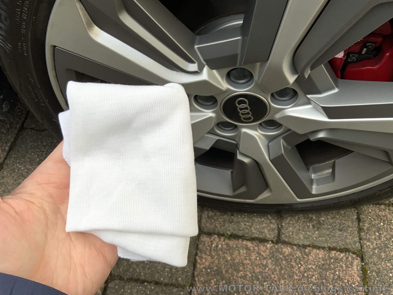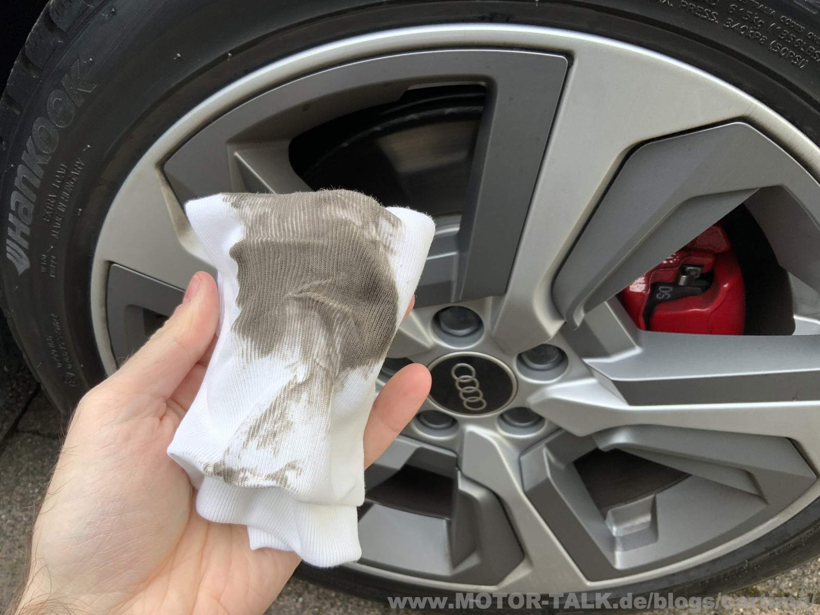 Nun beim Abwischen mit einem alten Tuch merkt man erst was alles an Schmutz im Gummi saß. Der Reifen ist wiegesagt noch gar nicht allzu alt. Alternativ zum Lappen kann man es auch später mit einem Hochdruckreiniger abspülen. Dort Vorsicht, nicht zu nah mit der Lanze ran gehen!