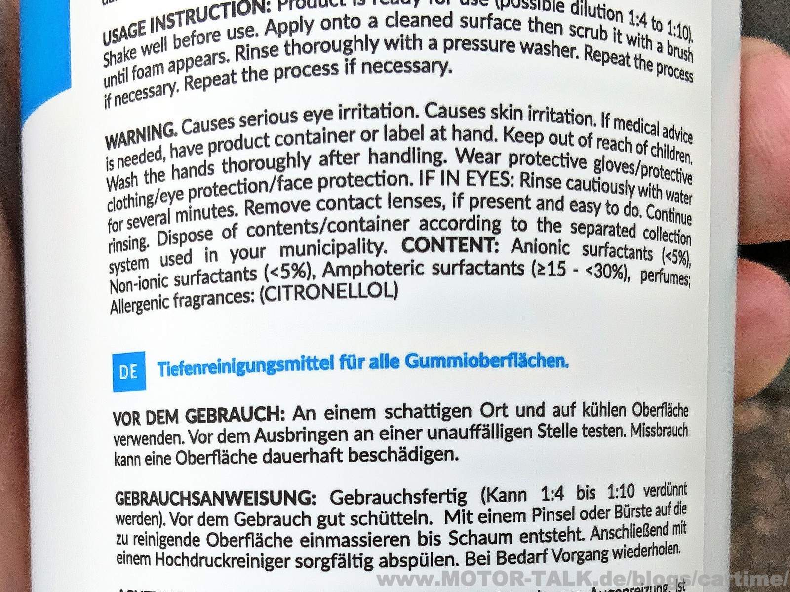 Sehr lange halten wird die Reifenpflege nicht, aber das schafft kaum eine. Regen ist auch der Feind einer solchen Pflege. Bei regenfreien Tagen hält es allerdings schon einige Zeit. Man legt es sonst einfach schnell mal nach. Wenn man die Reifen vorher gut reinigt, hält eine Pflege auch schon länger. Durch die verbauten Canyon Sprühköpfe verbraucht man auch allzu nicht viel Produkt. Die zählen zu den besten auf dem Markt. So kann man sie später auch noch weiter aufheben. Den Reiniger und die Pflege kann man natürlich auch an Gummidichtungen rund um die Türen verwenden, wobei der Reiniger hier je nachdem zu stark wäre. Außer es handelt sich z.B. um sehr stark verdreckte oder vermooste. In diesem Anwendungsbereich würde ich ansonsten definitiv mit Wasser verdünnen oder einen milden APC vorziehen.