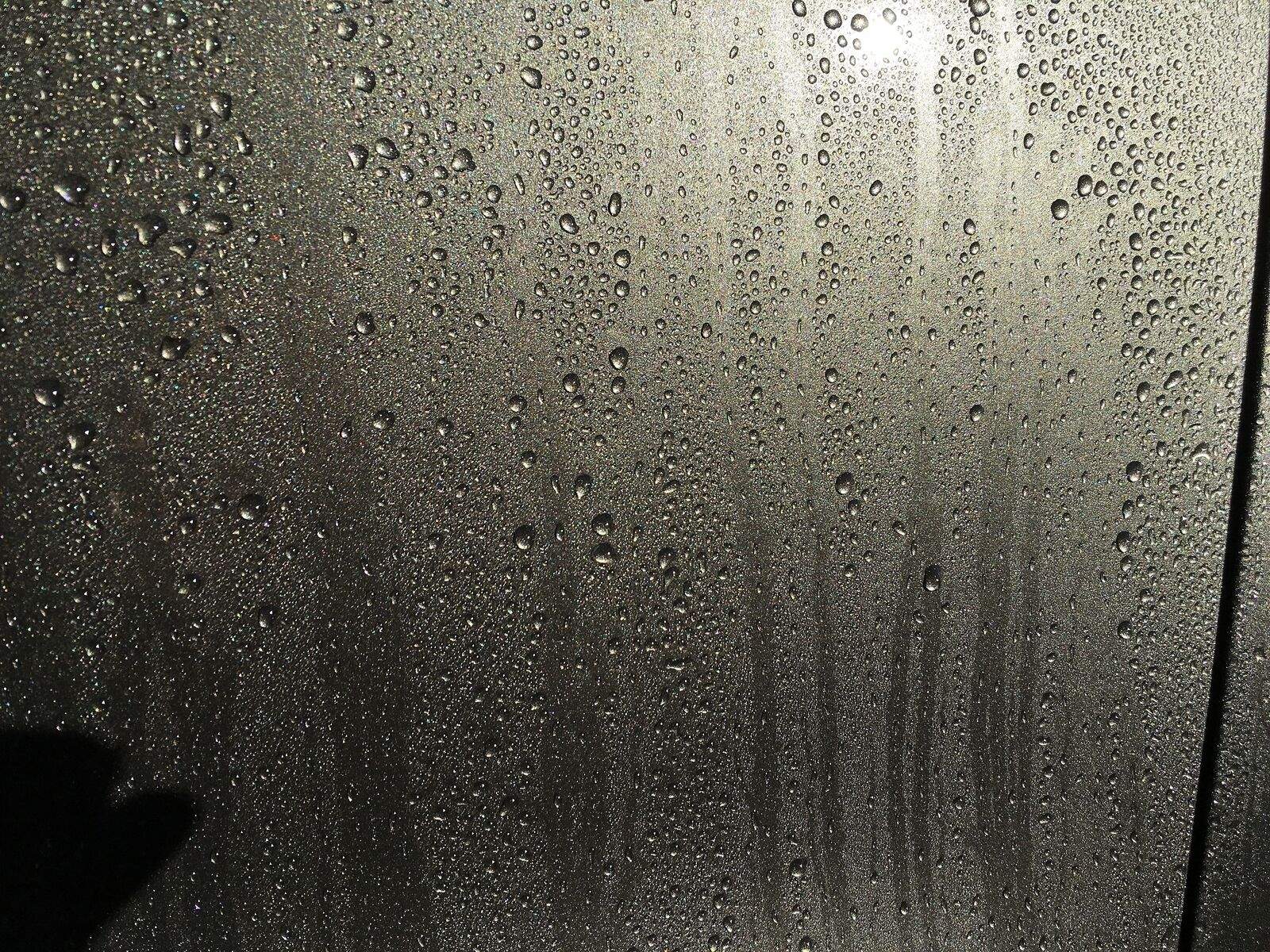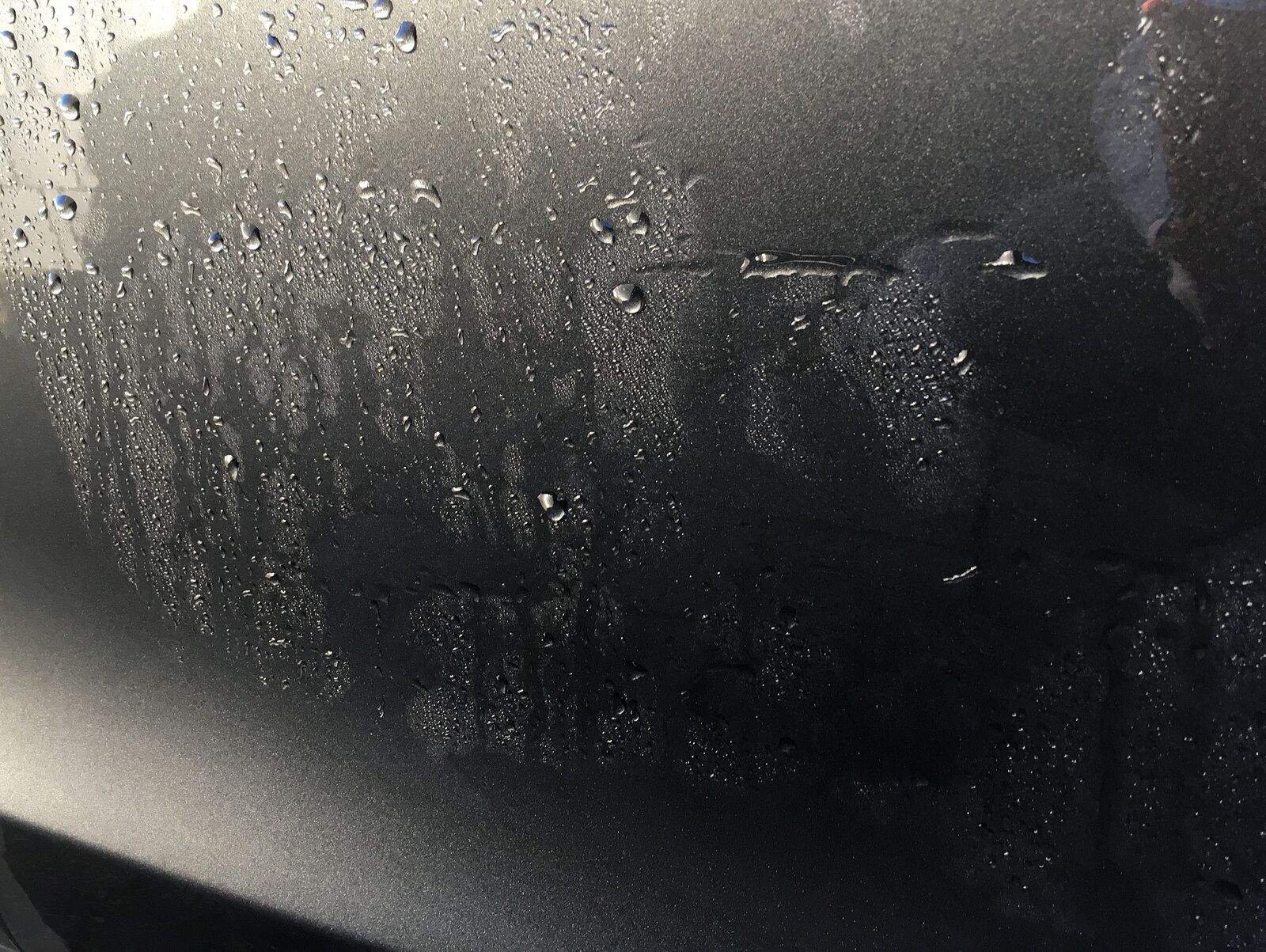 Man darf allerdings keine enorme Perlenbildung auf einem unversiegelten Lack á la Sonax Brilliant Shine Detailer erwarten. Denn dieser neue Gyeon Detailer ist wiegesagt auf reiner Carnauba-Basis. Das bedeutet nicht, das er schlecht ist. Er bringt sogar durchaus ein auffrischendes Abperlverhalten mit sich. Das kann man gut unten an meinem schon sehr gelittenen Wachsschutz sehen. Trotz des Härtetests sind sogar ein paar mehr Perlchen hinzugekommen.