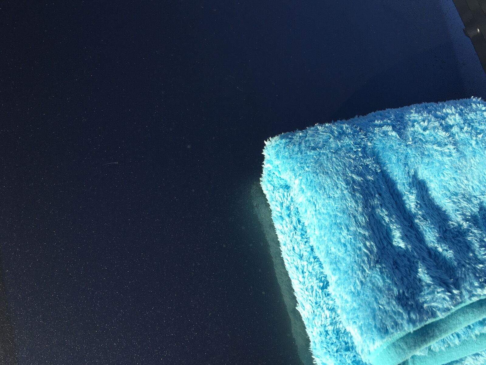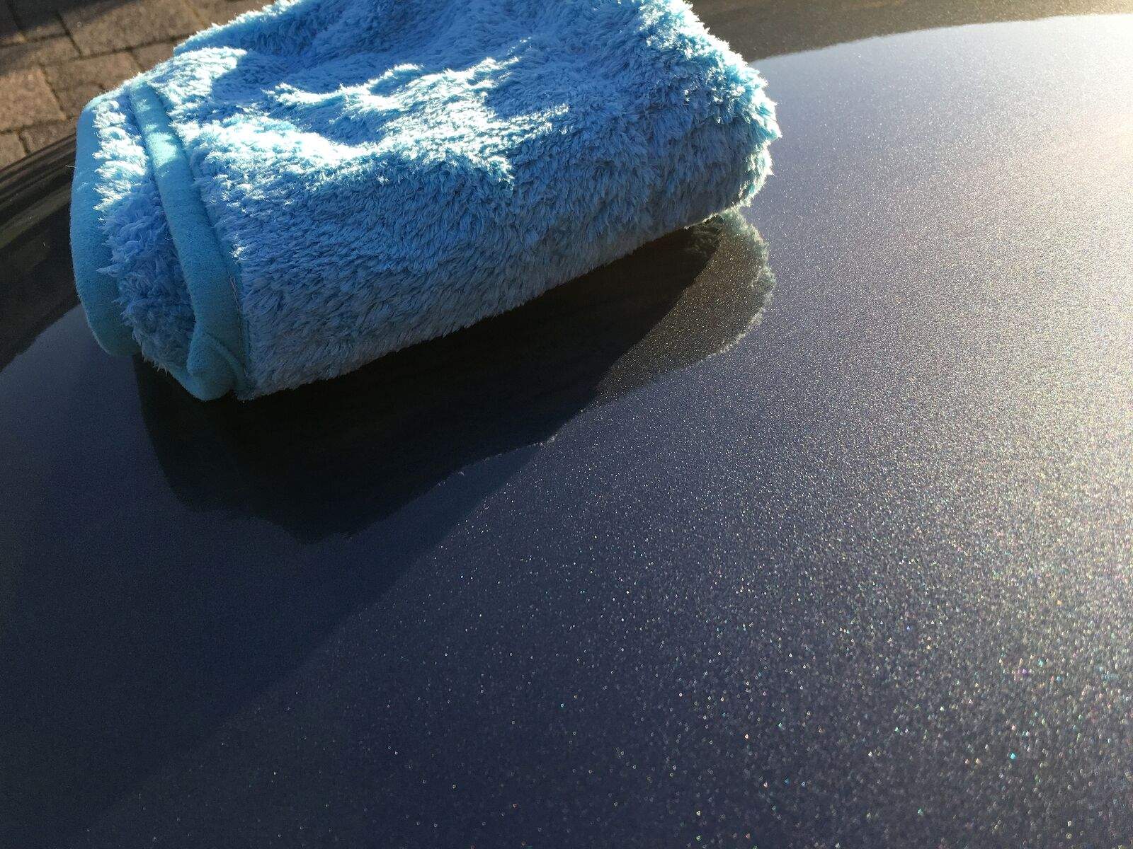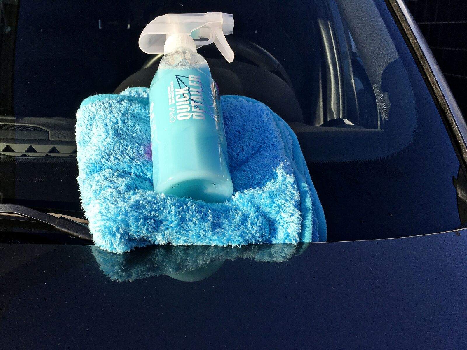 Auf geht’s! Schon beim Öffnen des Q²M QuickDetailer Deckels strömt einem ein Kokos-Duft (ist der selbe wie beim Q²M TireExpress) entgegen. Nun wird der Sprühkopf aufgeschraubt, der extra mit beiliegt. Vorher gut schütteln, denn wenn er lange steht, setzt sich oben ein milchiger Film ab. Das ist der Carnauba-Anteil, der sich abtrennt (siehe Bild). Ich sprühe einfach dünn etwas auf den Lack und verteile es mit einem weichen und flauschigen Mikrofasertuch. Dafür habe ich das Micofiber Madness Crazy Pile Deluxe in der passenden Farbe zum Detailer. Das Verteilen und Aufnehmen mit einer anderen Tuchseite klappt wunderbar. Ein sehr feines Tuch. Ihr könnt sonst auch ein etwas dünneres nehmen. Nur nicht unbedingt ein kurzfloriges.