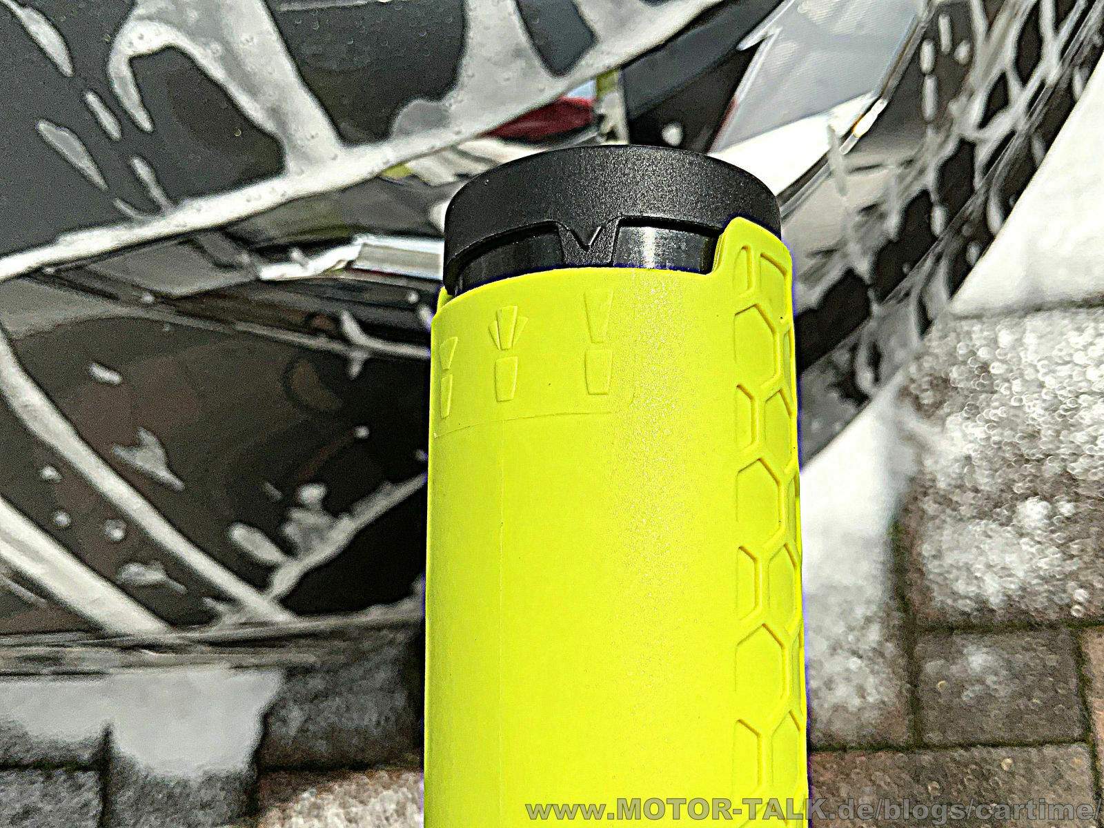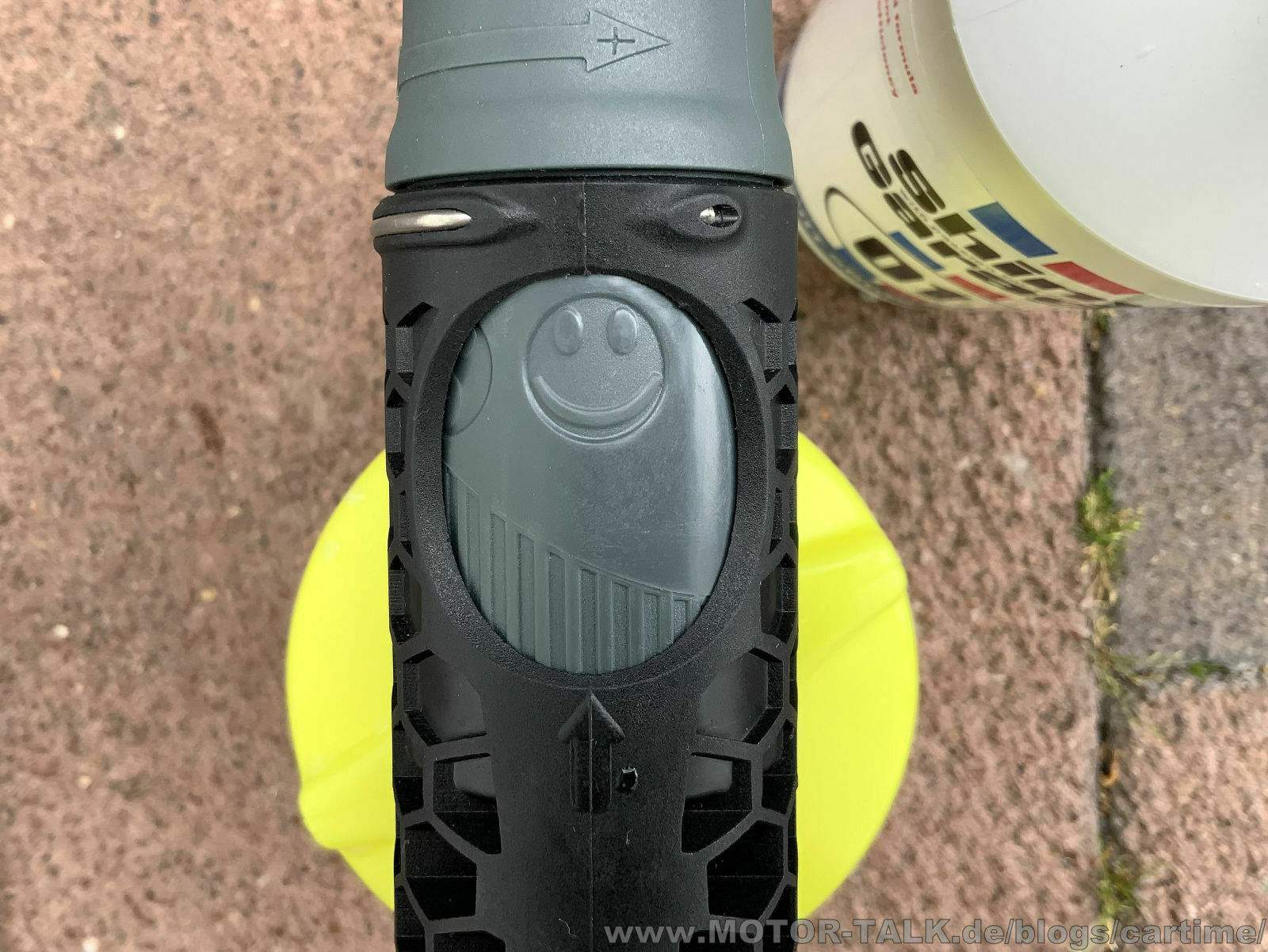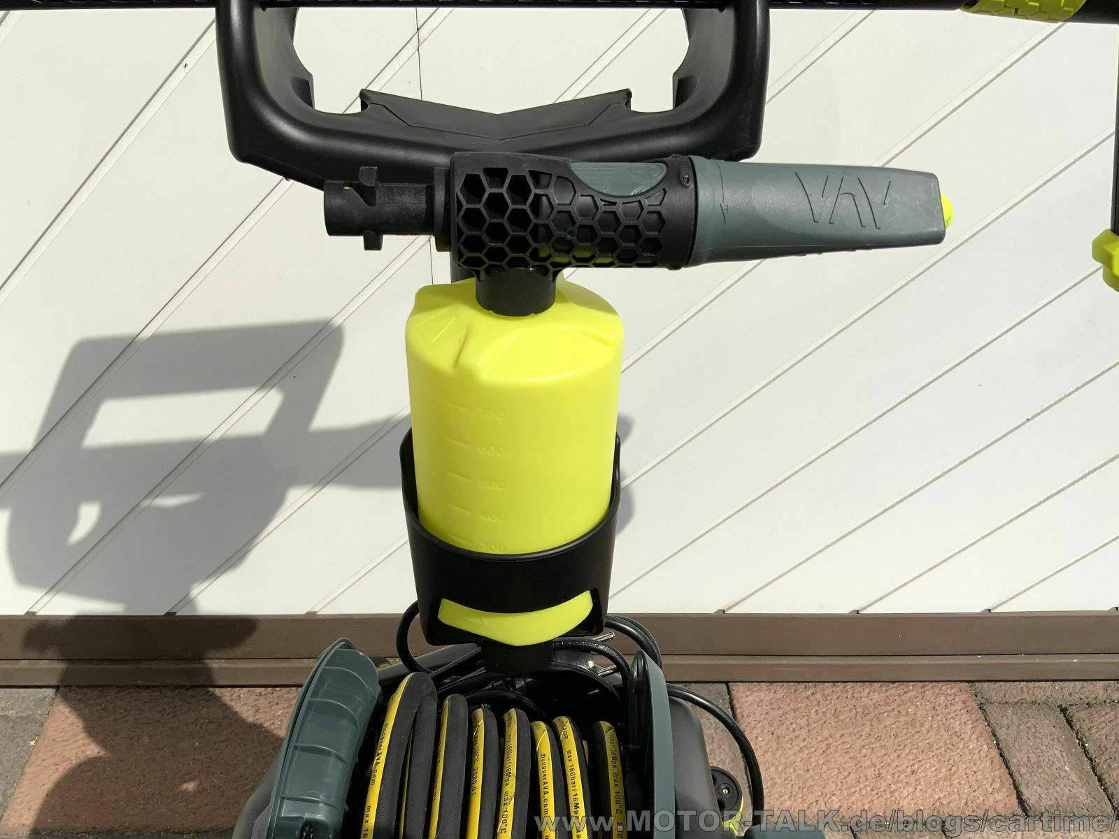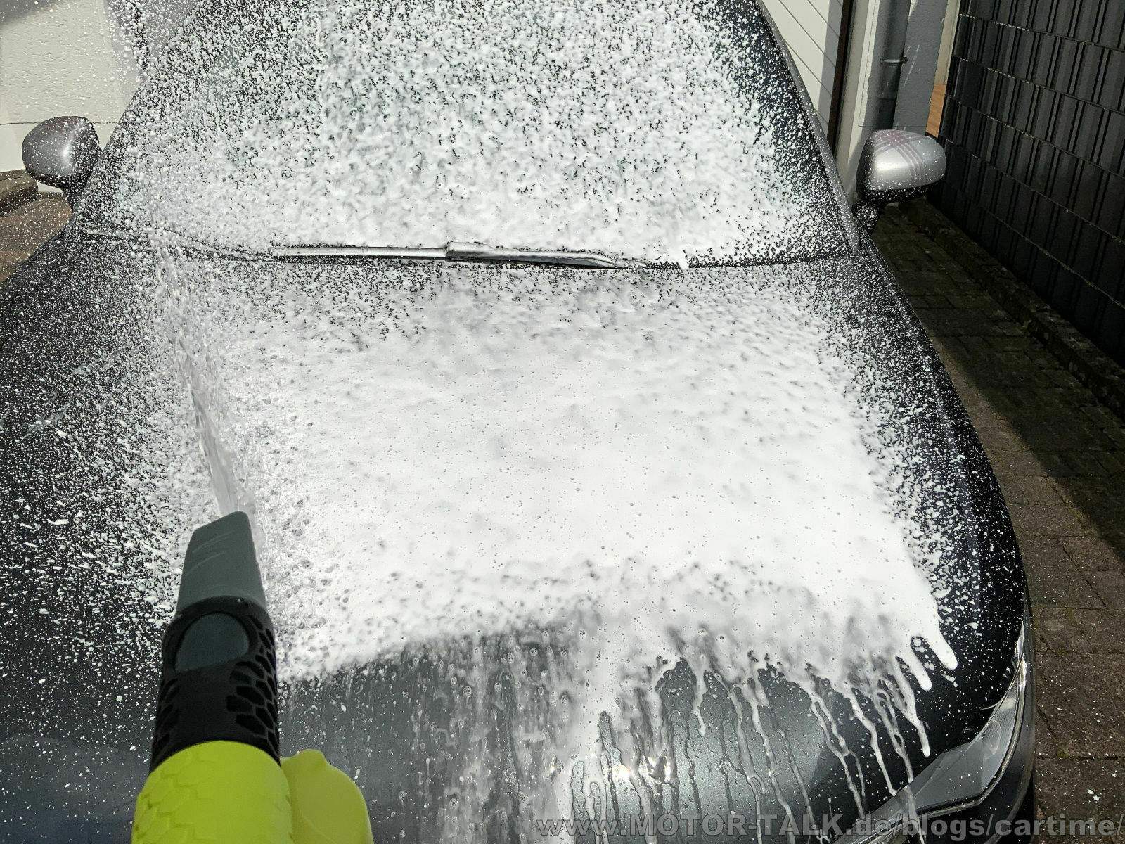 Los geht es mit der Schaumkanone. Die lässt sich einfach eindrehen einklicken, ganz im Kärcher Style. Als Snow Foam hat er von Shiny Garage das Fruit Snow Foam dabei. Gibts u.a. auch bei HQS. Davon füllen wir 20 ml auf 700 ml Wasser in den Schaumkanonenbehälter. AVA hat unter den Einstellmöglichkeiten für das Schaumbild zwei zur Auswahl. Ein lachenden Smiley für etwas dünneren Schaum und ein Smiley mit weit geöffnetem Mund für dickeren Schaum. Lustig gemacht. Das „dickere“ Schaumbild kann sich sehen lassen, wie ich finde. Richtig dicker Rasierschaum ist es auch dann nicht, aber zu dick ist auch nicht gut. Es soll ja einwirken und gleichzeitig ich anlaufen. Von daher passt das schon gut.