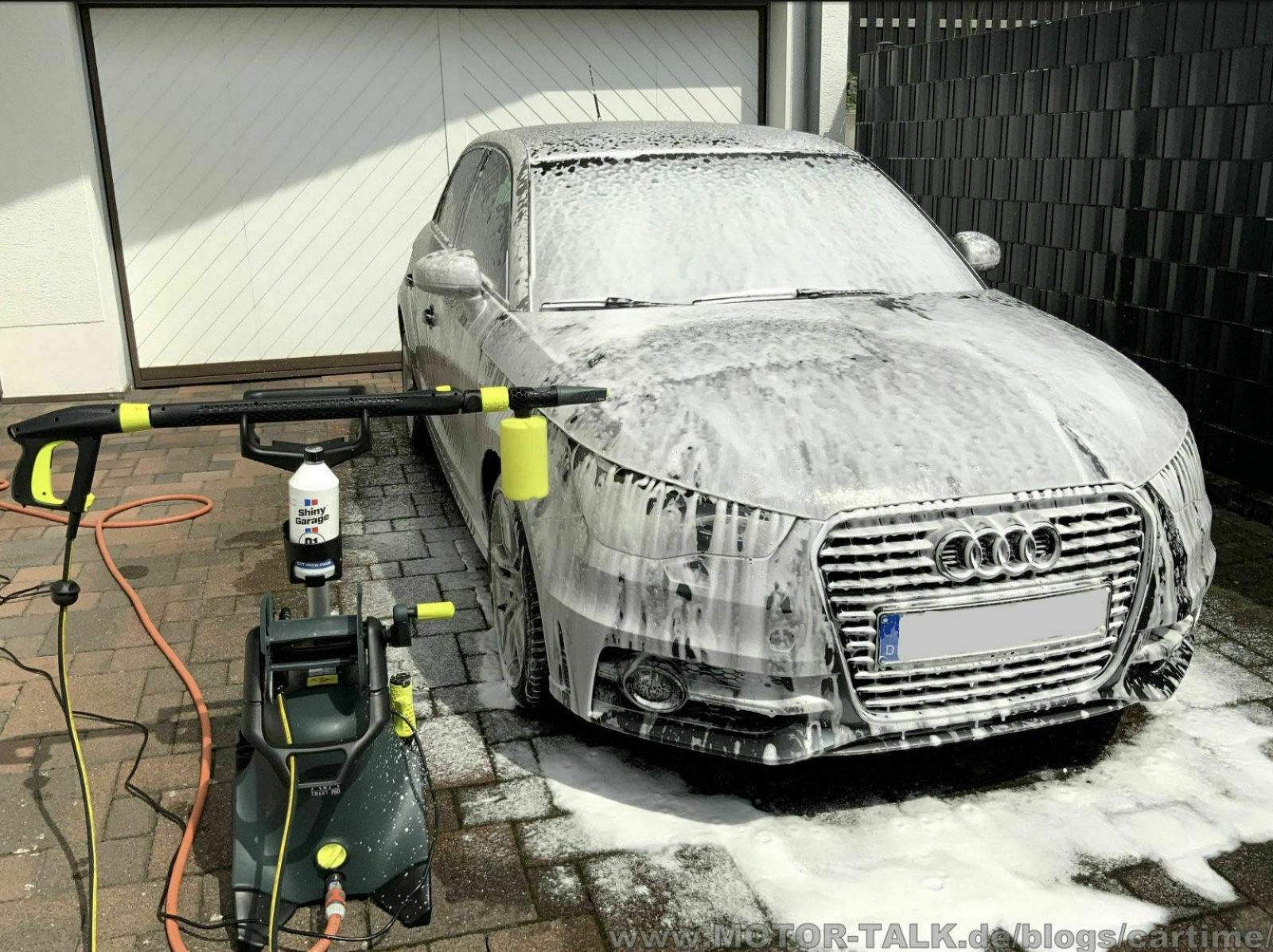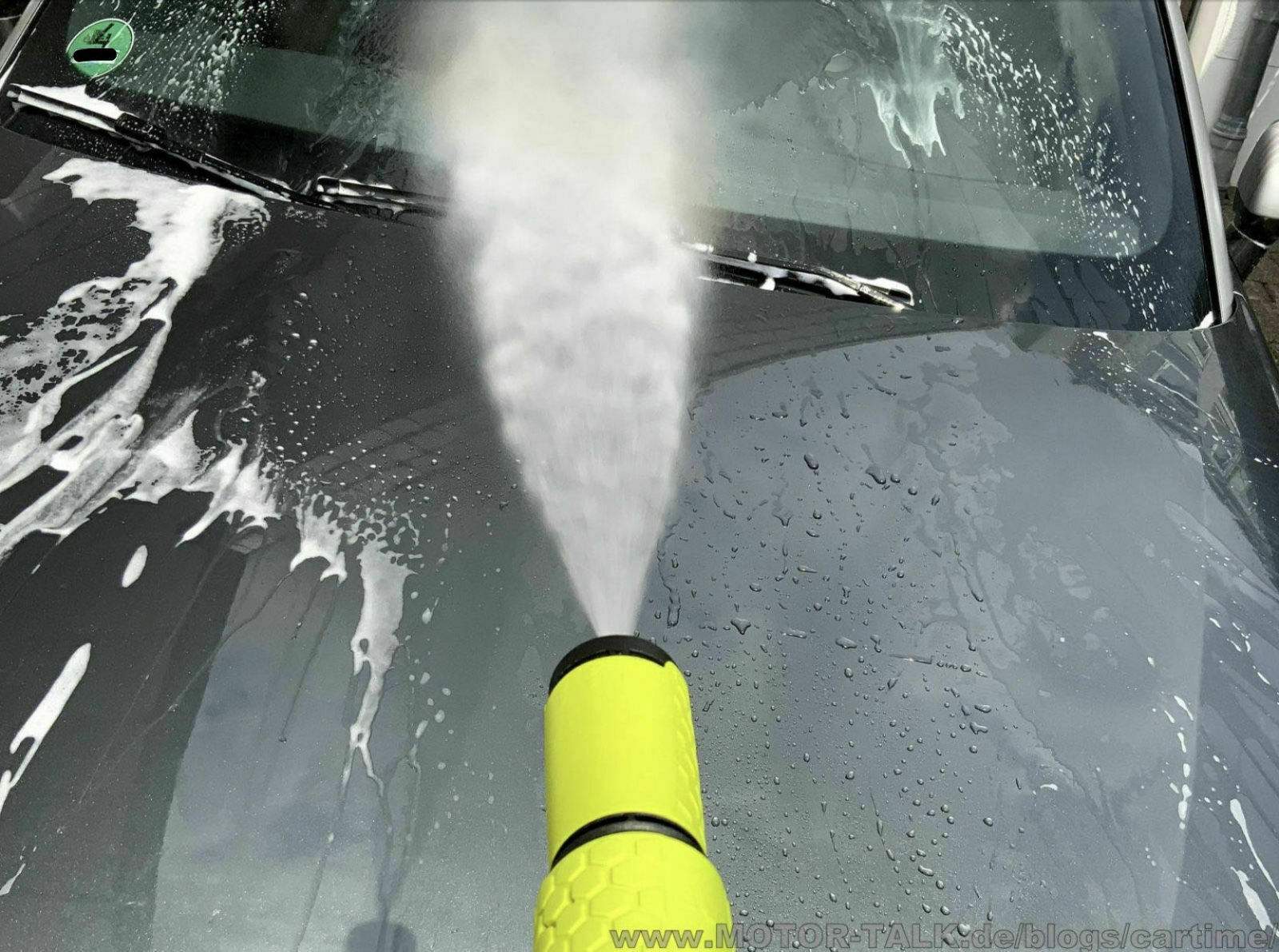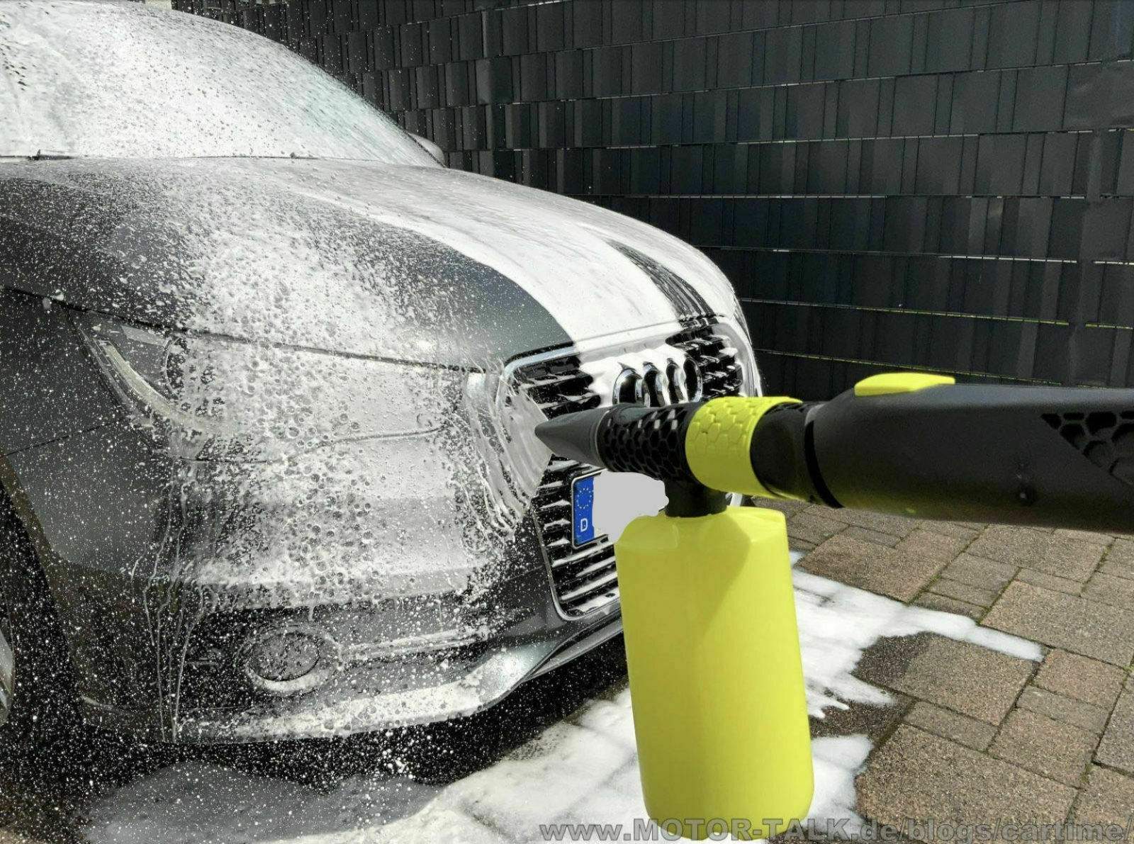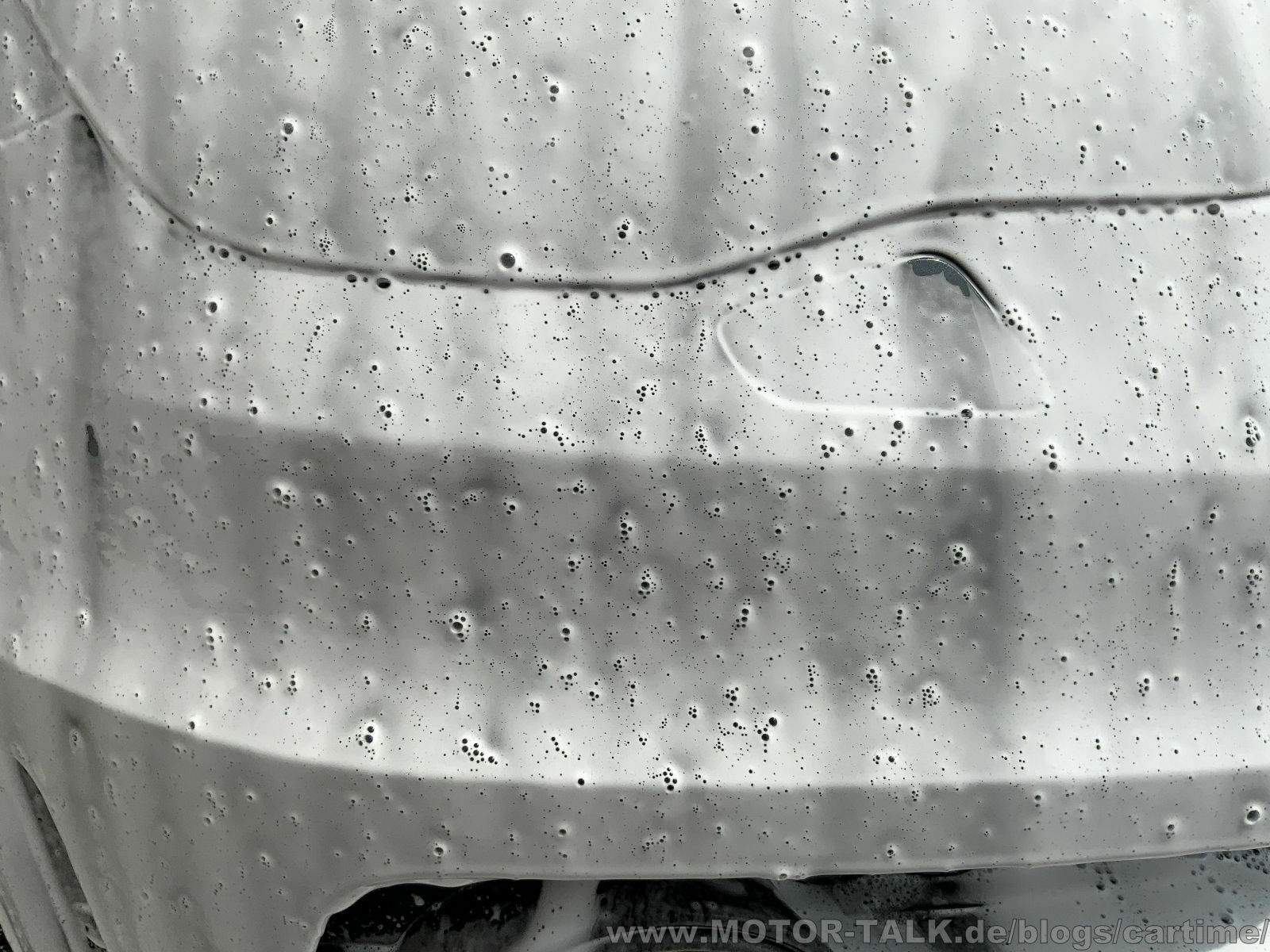 Los geht es mit der Schaumkanone. Die lässt sich einfach eindrehen einklicken, ganz im Kärcher Style. Als Snow Foam hat er von Shiny Garage das Fruit Snow Foam dabei. Gibts u.a. auch bei HQS. Davon füllen wir 20 ml auf 700 ml Wasser in den Schaumkanonenbehälter. AVA hat unter den Einstellmöglichkeiten für das Schaumbild zwei zur Auswahl. Ein lachenden Smiley für etwas dünneren Schaum und ein Smiley mit weit geöffnetem Mund für dickeren Schaum. Lustig gemacht. Das „dickere“ Schaumbild kann sich sehen lassen, wie ich finde. Richtig dicker Rasierschaum ist es auch dann nicht, aber zu dick ist auch nicht gut. Es soll ja einwirken und gleichzeitig ich anlaufen. Von daher passt das schon gut.