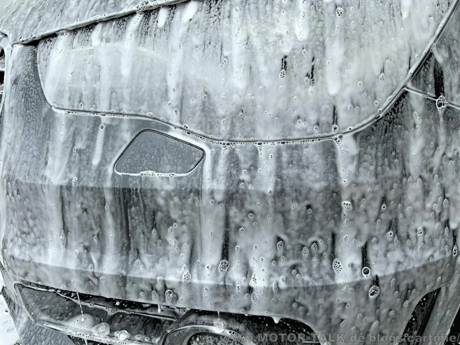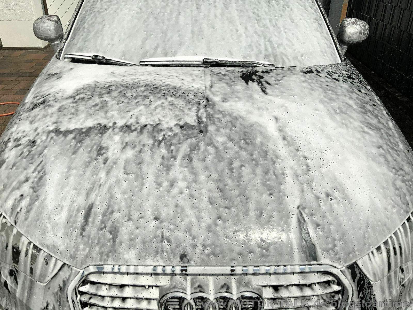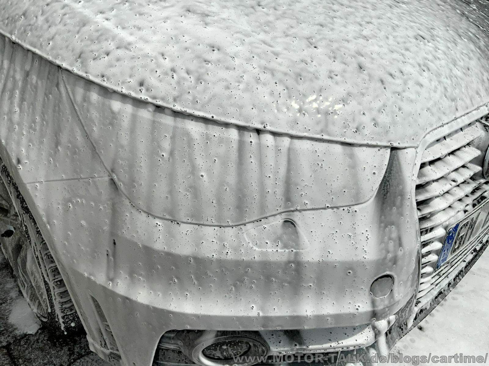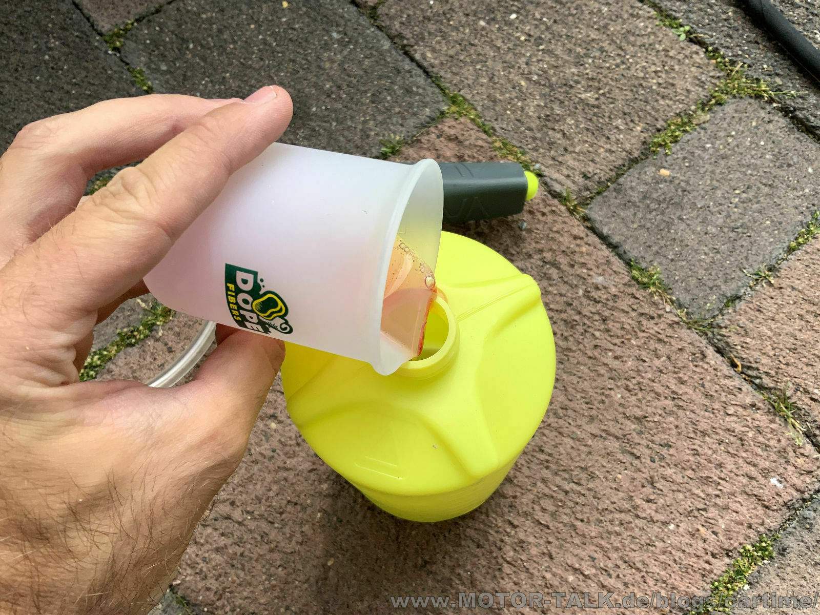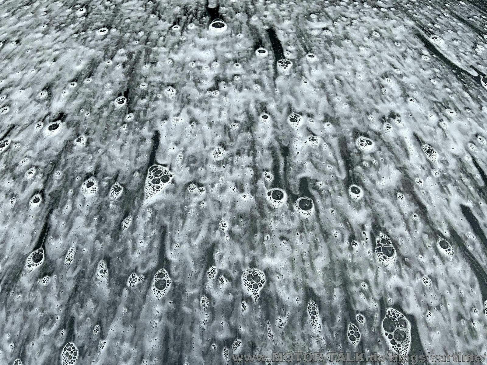 Los geht es mit der Schaumkanone. Die lässt sich einfach eindrehen einklicken, ganz im Kärcher Style. Als Snow Foam hat er von Shiny Garage das Fruit Snow Foam dabei. Gibts u.a. auch bei HQS. Davon füllen wir 20 ml auf 700 ml Wasser in den Schaumkanonenbehälter. AVA hat unter den Einstellmöglichkeiten für das Schaumbild zwei zur Auswahl. Ein lachenden Smiley für etwas dünneren Schaum und ein Smiley mit weit geöffnetem Mund für dickeren Schaum. Lustig gemacht. Das „dickere“ Schaumbild kann sich sehen lassen, wie ich finde. Richtig dicker Rasierschaum ist es auch dann nicht, aber zu dick ist auch nicht gut. Es soll ja einwirken und gleichzeitig ich anlaufen. Von daher passt das schon gut.