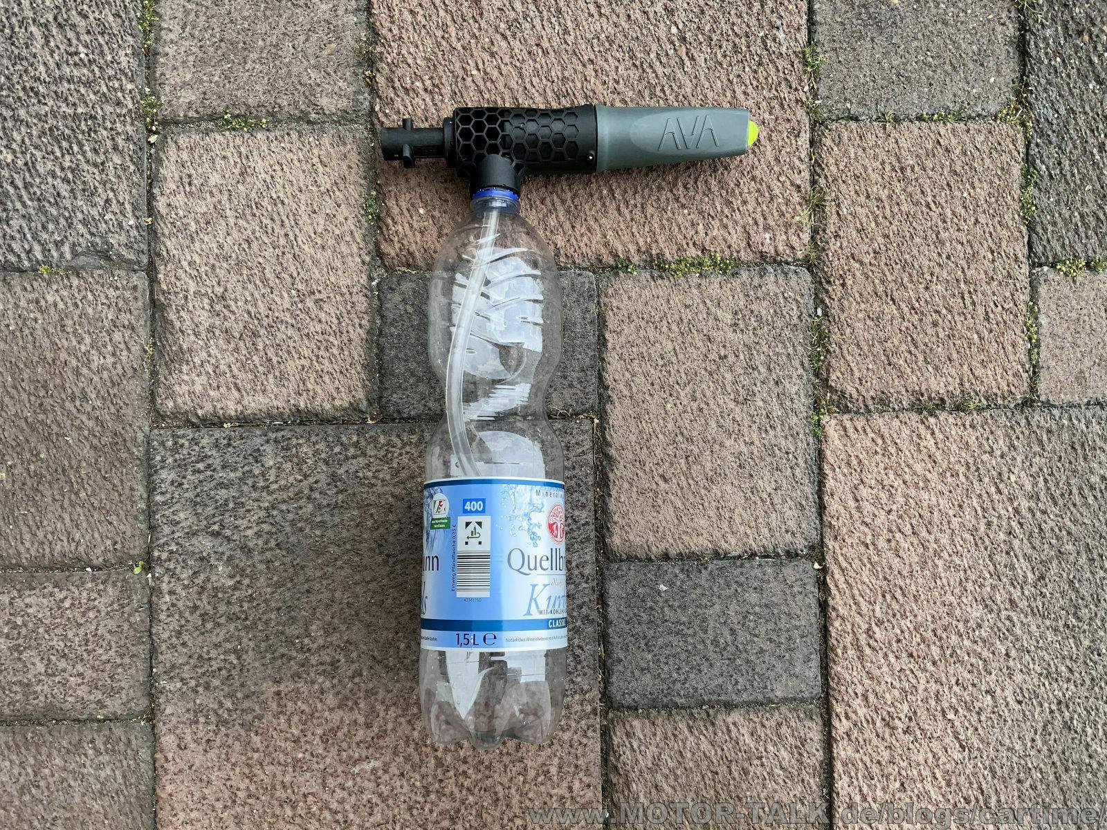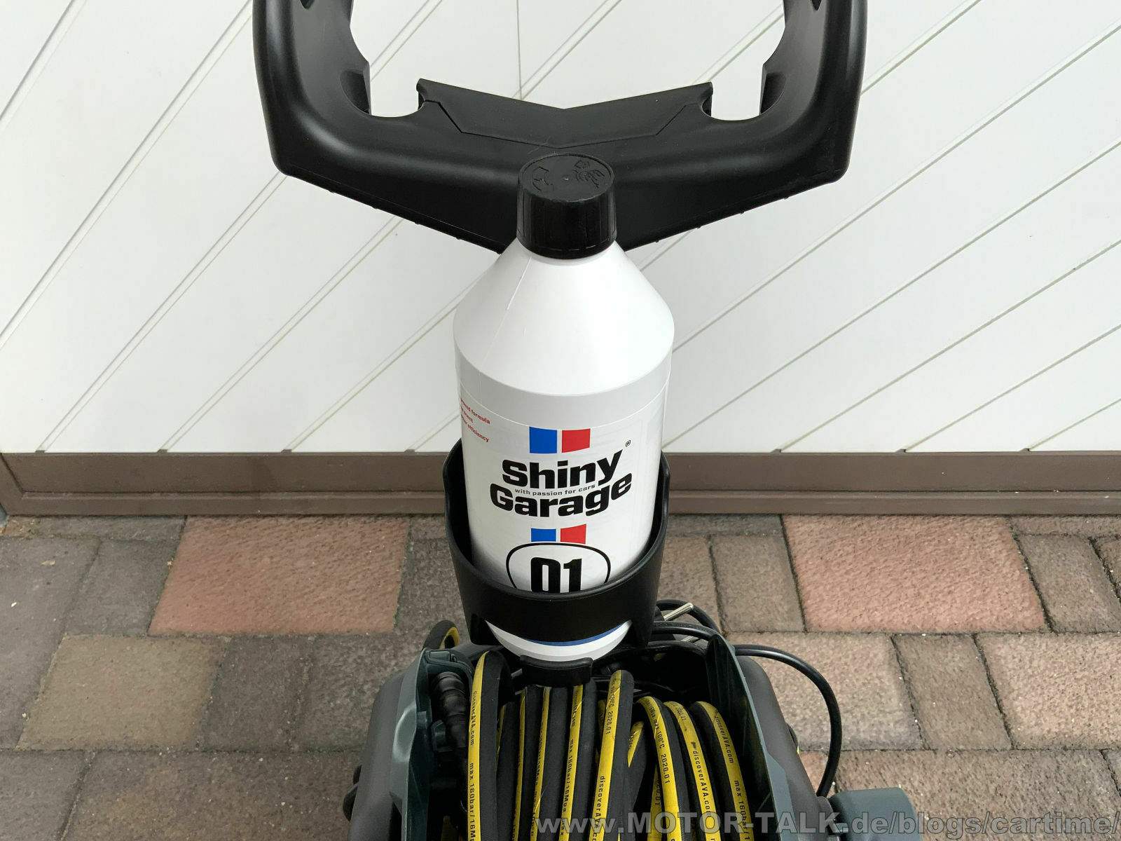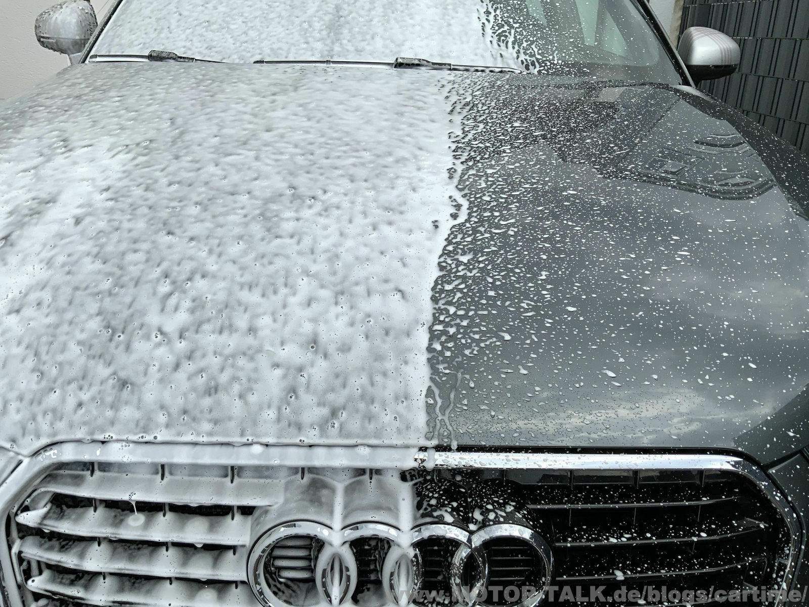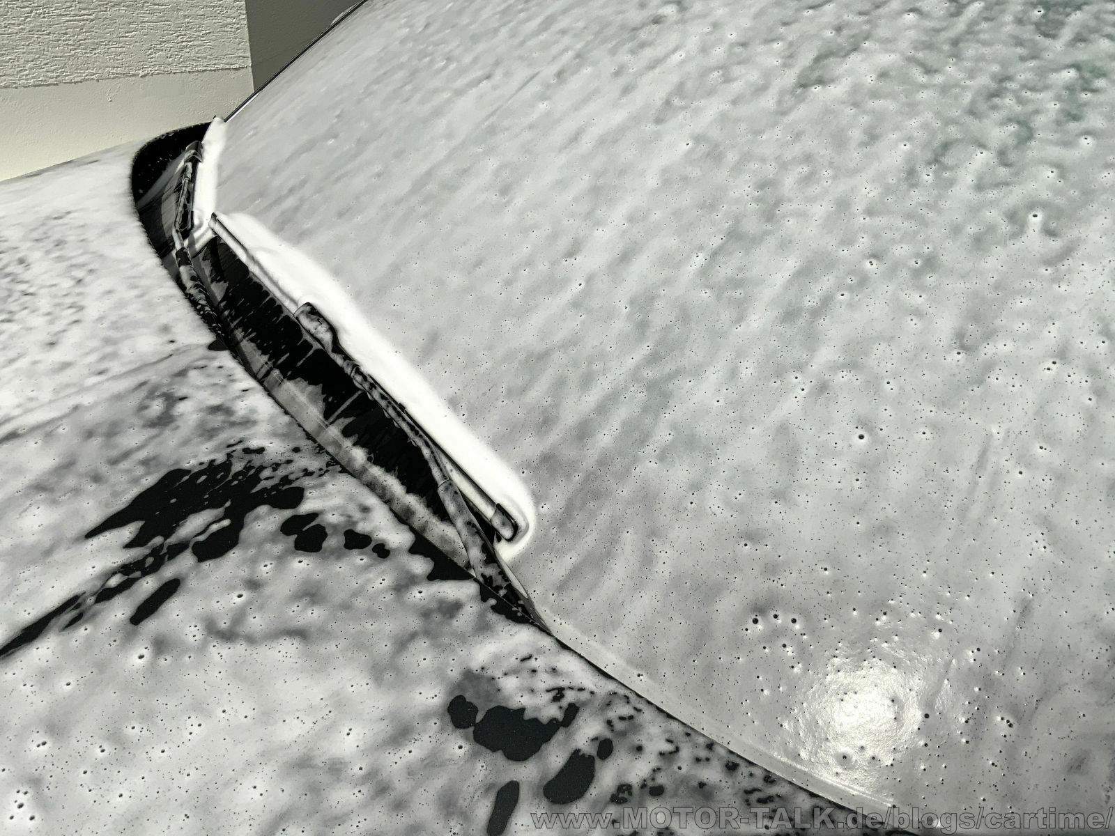 Los geht es mit der Schaumkanone. Die lässt sich einfach eindrehen einklicken, ganz im Kärcher Style. Als Snow Foam hat er von Shiny Garage das Fruit Snow Foam dabei. Gibts u.a. auch bei HQS. Davon füllen wir 20 ml auf 700 ml Wasser in den Schaumkanonenbehälter. AVA hat unter den Einstellmöglichkeiten für das Schaumbild zwei zur Auswahl. Ein lachenden Smiley für etwas dünneren Schaum und ein Smiley mit weit geöffnetem Mund für dickeren Schaum. Lustig gemacht. Das „dickere“ Schaumbild kann sich sehen lassen, wie ich finde. Richtig dicker Rasierschaum ist es auch dann nicht, aber zu dick ist auch nicht gut. Es soll ja einwirken und gleichzeitig ich anlaufen. Von daher passt das schon gut.