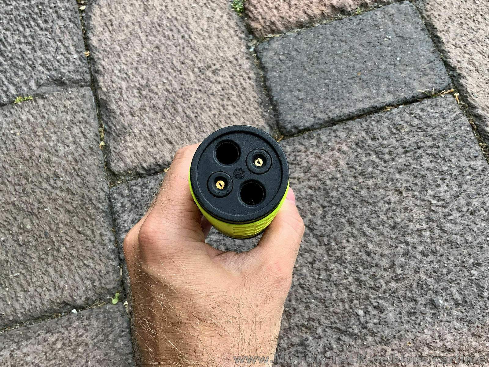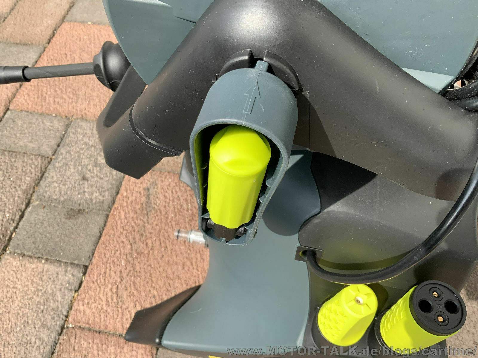 Halterungen für Zubehör gibt es rund um den Fuß. Für alle kleinen Düsen ist dort Platz. Diese sitzen dann auch fester drin und fallen nicht beim fahren raus.