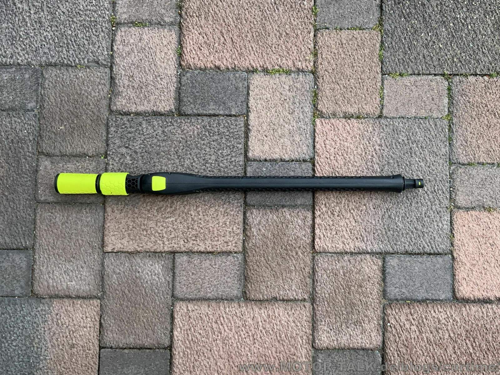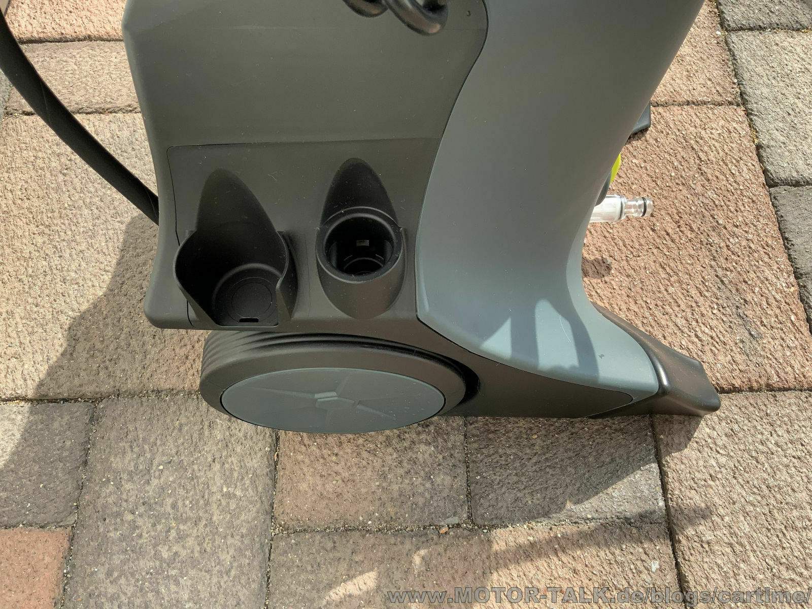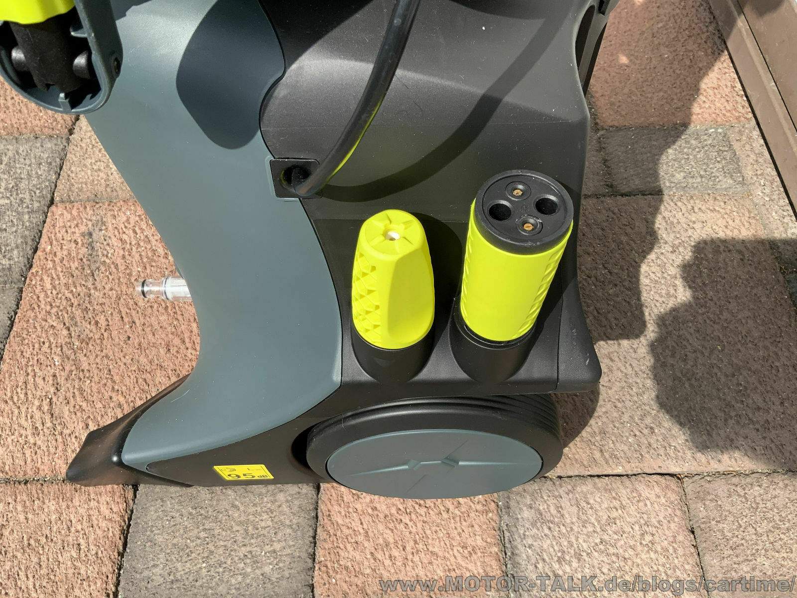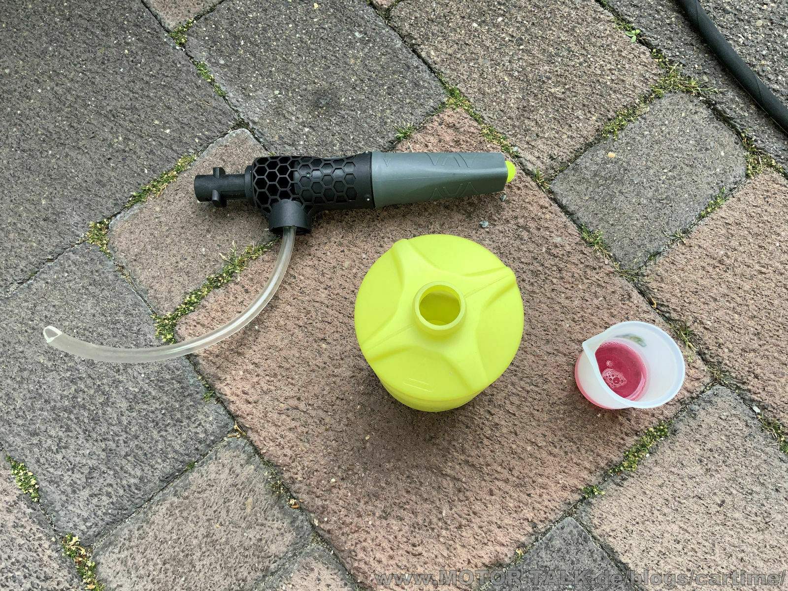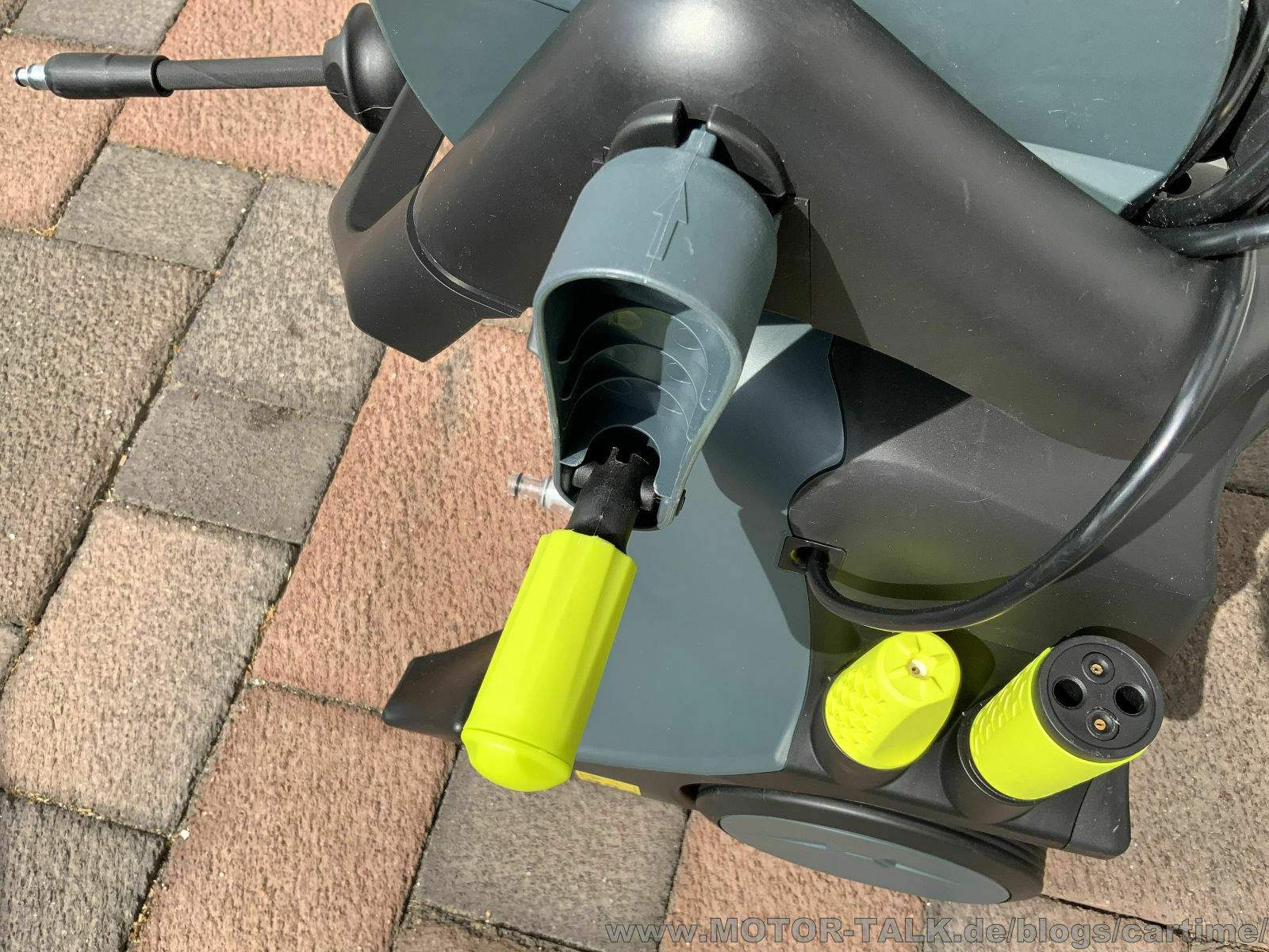 Nachdem man den Karton öffnet, gibt es noch ein paar Dinge, die vor dem Benutzen erledigt werden müssen. Das sind zum einen zwei Standfüße einklicken und den Griff inkl. Halterung für die Schaumkanone montieren und verschrauben. Was die Füße betrifft, die helfen tatsächlich, denn ein kippen ist nachher nicht mehr möglich. Außerdem muss der Wasseranschluss vorn festgeschraubt werden. An diesen passt ein Wasserschlauch mit handelsüblicher Kupplung z.B. Garden. Und an der Lanze muss noch eine Art Klammer befestigt werden, sodass vorne die Düsen nicht rauspurzeln, wenn später unter Hochdruck Wasser rauskommt.