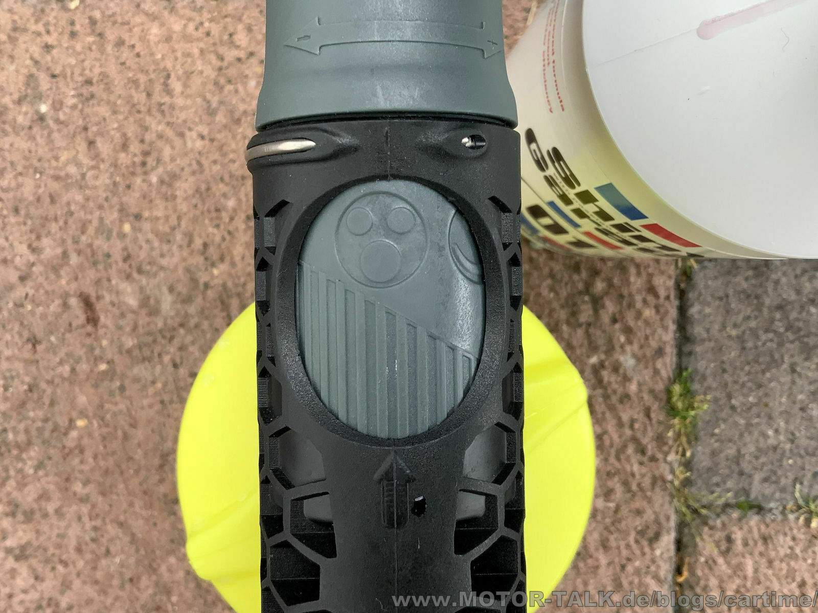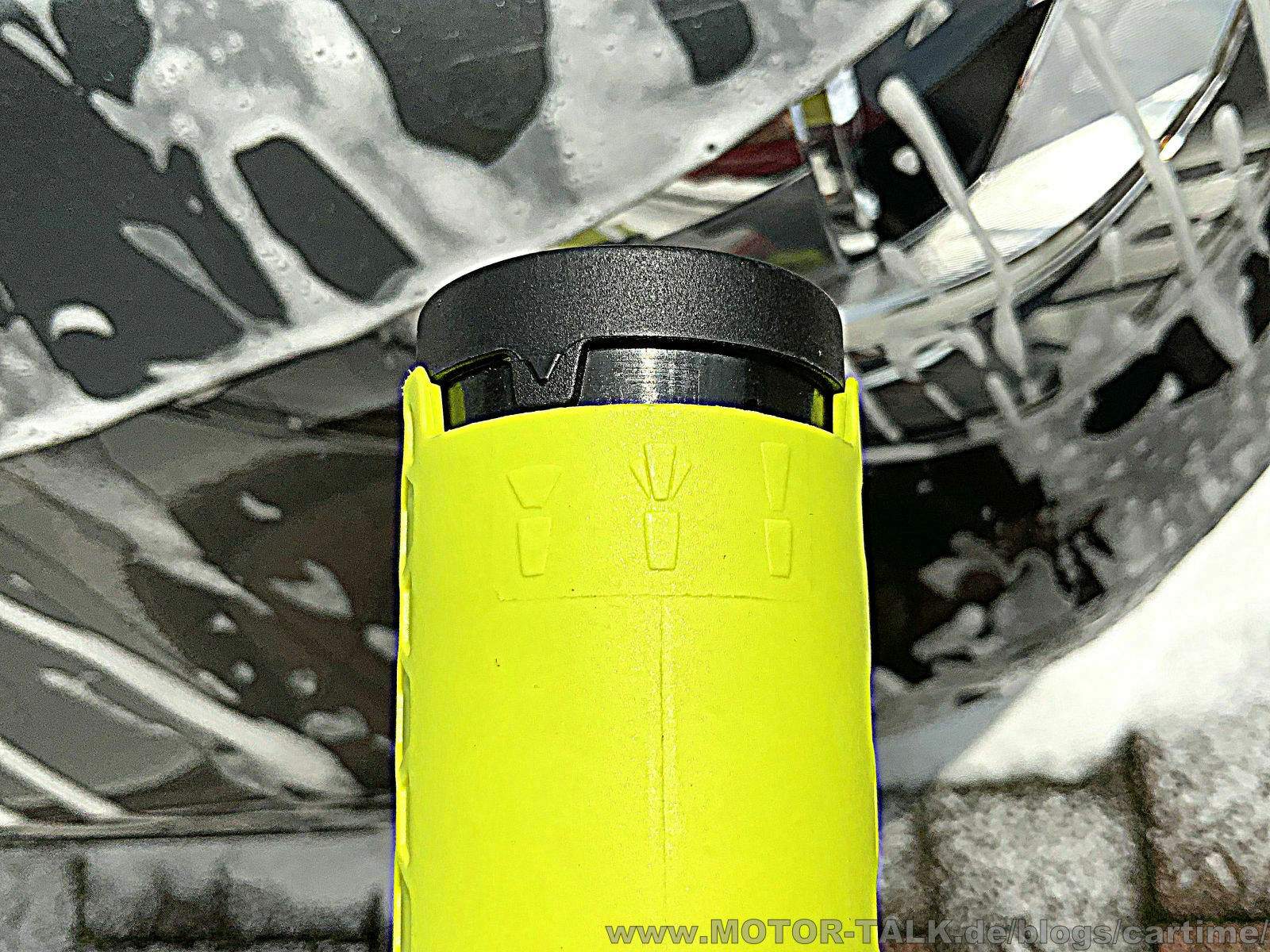 Zum Abspülen gibt es durch die Variodüse drei Möglichkeiten. Die zeige ich euch hier. Das Abspülen des Schaum geht ohne Probleme. Den ganz starken Strahl würde ich eher nicht nehmen. Wenn dann nur mit genügend Abstand. Die „Dreckfräse“ (Turbodüse) hat auch am Auto nichts verloren. Hier mal eine Nahaufnahme von der Variodüse und deren Sprühmöglichkeiten.