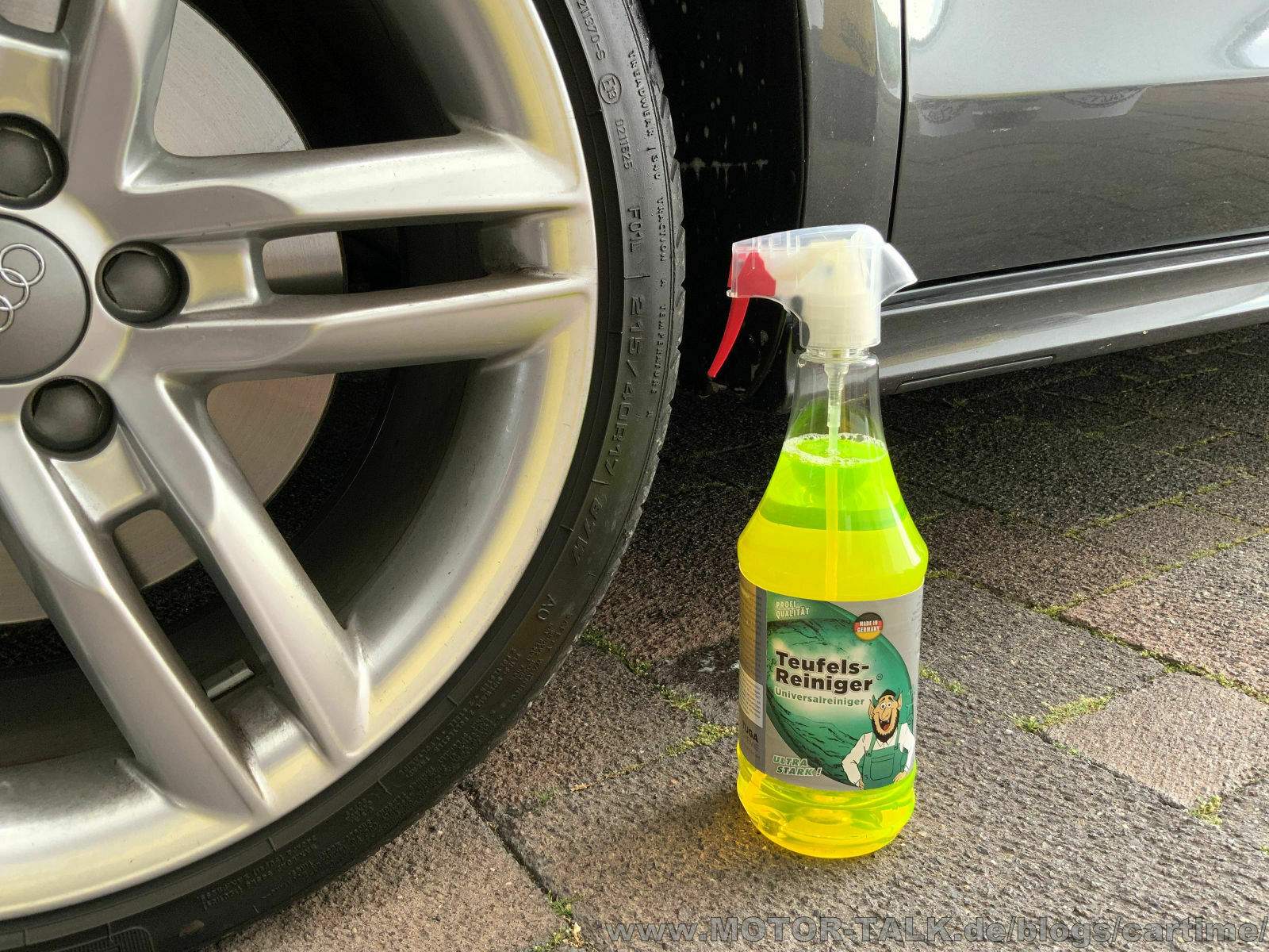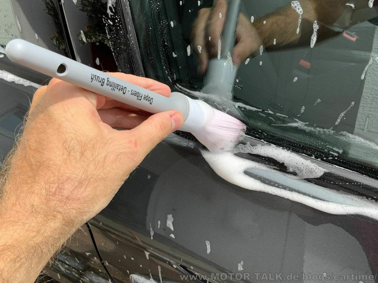 Man kann neben dem AVA Behälter auch Cola Flaschen oder z.B. die Shiny Garage Flasche anschrauben. Das mal als Beispiel. Ich bin übrigens locker ums kleine Auto gekommen mit den 700 ml Füllvolumen. Wenn man eine Shiny Garage 1L Flasche anschraubt bekommt man noch 300 ml mehr Inhalt rein. Und zum Vergleich, das Original Behältnis von Kärcher fasst 600 ml. Da ist das schon sehr gut gelöst hier. Als APC gab es mal den Tuga Teufelsreiniger mit dabei. Perfekt für stärkere Verschmutzungen z.B. im Radhaus, am Motorraum oder den Einstiegen. Auch eine Alternative für den Koch Chemie Greenstar. Zum Aufschäumen die sehr weichen Pinsel von Dope Fibers. Ähnlich denen von CarPro, die ich letzten getestet hatte. Sind haben echt sehr sehr weiche Borsten.