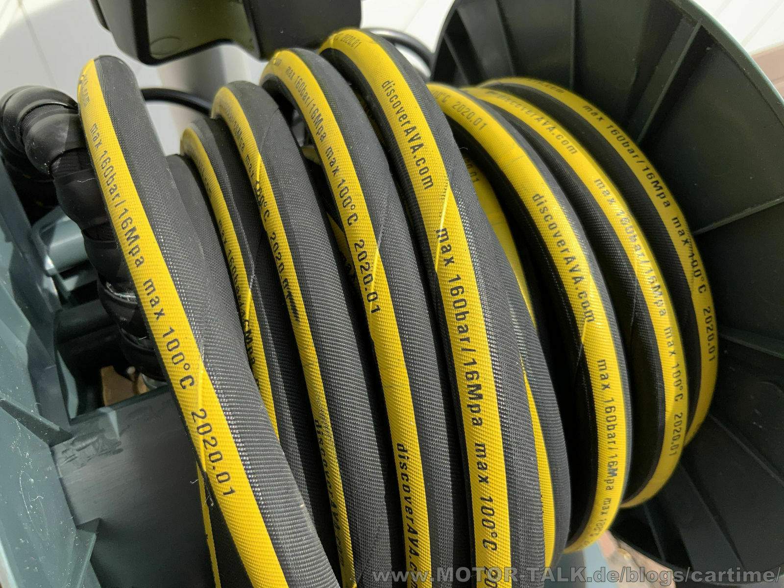 Bei einem Hochdruckreiniger sollte man nicht eine zu geringe Wasserdruck- und Wasserdurchlauf Leistung haben. Vorallem wenn man neben dem Auto öfters noch etwas rund um Haus & Hof reinigen möchte. Mit einem Wasserdruck von bis zu 150 bar ist man beim P60 schon sehr gut dabei. Damit lassen sich auch starke Verschmutzungen Außerhalb des KFZ‘s leicht lösen. Der P60 hat eine Leistung von 2200 Watt. Bis zu 500 Liter Wasser pro Stunde lassen sich für den Außenbereich umsetzen. Eine Schaumkanone ist in dem L-Pack ja auch enthalten, da sind wir besonders gespannt drauf. Habe mir dazu noch Shiny Garage Fruit Snow Foam geholt. Ja und dann gibt es noch eine praktische eingebaute Schlauchtrommel mit beweglicher Kurbel. Diese wickelt bequem den Schlauch nach der Nutzung zusammen, ohne dass sich der Schlauch biegen kann. Diese Trommel ist beweglich und nicht starr. Alles das schauen wir uns an.
