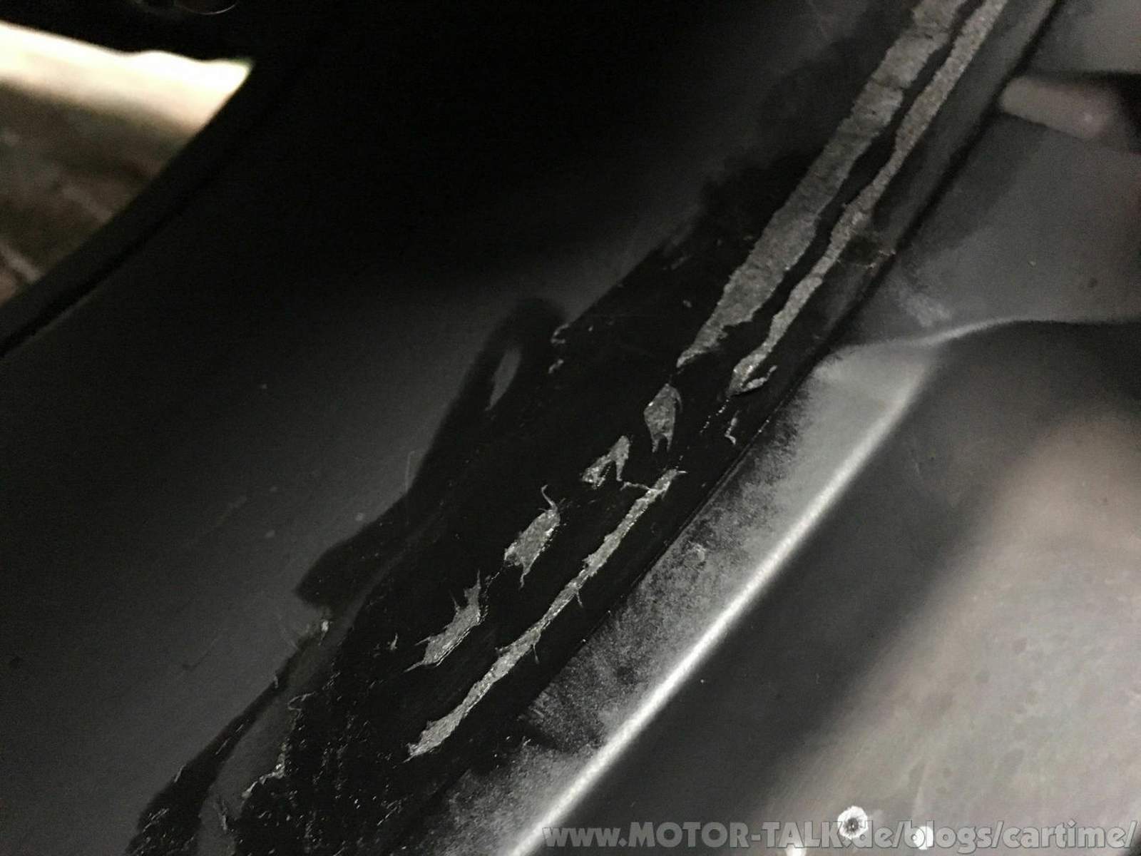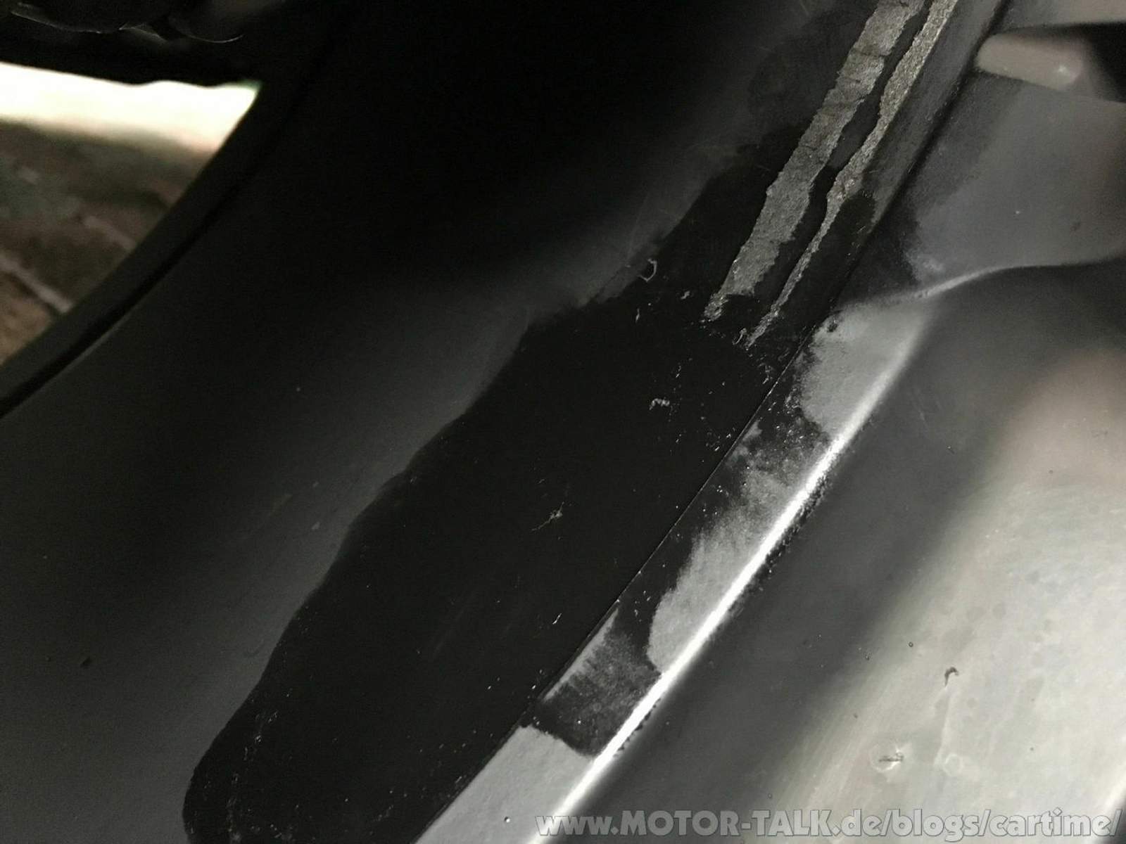 Das Produkt wird unverdünnt auf die zu behandelnden Stelle aufgetragen. Der Sprühkopf ist normal nicht dabei. Es ist eine „Dosierungskappe“ vorhanden, wo man tröpfchenweise Produkt entnehmen kann. Ihr könnt euch ansonsten auch einen Canyon-Sprühkopf aufschrauben oder ein weiches Schwämmchen zum benetzen nehmen. Hinweis: Tragt Schutzhandschuhe und ggfs. eine Atemschutzmaske. Der Geruch ist nicht besonders angenehm noch extrem beißend. Die Flüssigkeit nach dem Auftragen 1-3 Minuten einwirken lassen. Ich habe mir kleine Schwammstücke ausgeschnitten und das ganze sanft eingearbeitet. Auf der Flasche steht bei matten Flächen zunächst ohne Druck. Das klappte jedoch zunächst nicht. Die Klebereste lösen sich einfach nicht. Mit etwas mehr Druck und zwischendurch auch mal mit den Handschuh-Fingern anstatt Schwämmchen ging es schließlich. Hat aber ziemlich gedauert. Echt hartnäckiges Klebzeugs. Habt ihr die Felgen abmontiert habt ihr es leichter. Dann kann man in einem angenehmeren Winkel arbeiten. Einige Zeit später und im Schweiße meines Angesichts sind nun tatsächlich alle Klebereste verschwunden. Nun werden zunächst die lose liegenden Klebekrümmel mit Wasser abgespült. Danach wird, wie in der Anwendungsempfehlung angegeben, die behandelte Fläche nochmal mit Shampoo Wasser und Waschhandschuh gewaschen.