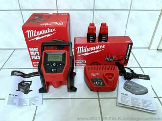 Dieser mobile Akku Kompressor schien mir dafür perfekt geeignet. Klein und handlich, trotzdem wertig. Mit geladenen Akku’s ist der M12-Serie mobil und immer einsatzbereit. Wenn man also schon Geräte der Marke hat umso besser. Da ich noch kein Milwaukee Gerät hab, habe ich das Milwaukee 12V Starterset M12 NRG-202 mit dazu bestellt. Mit dem Akku Ladegerät und zwei 12V 2.0Ah Akkus. Wie ich später noch merken werde reicht für z.B. einnormales Reifendruckkomtrollieren auch ein Akku aus.