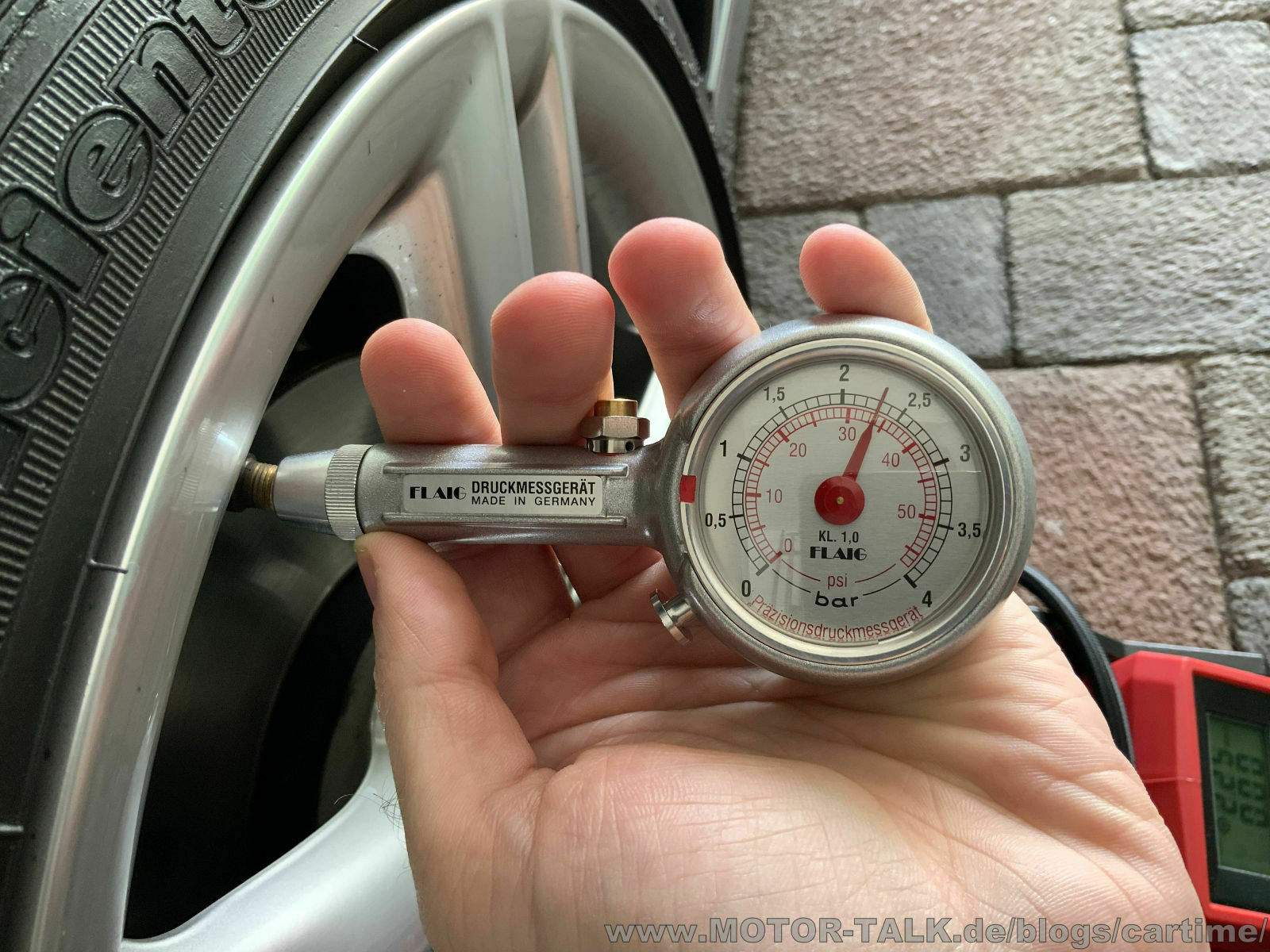 Da ich den M12 BI-201 natürlich auch genauestens unter die Lupe nehmen möchte, gibt es noch ein anderes Gerät zur Überprüfung der Messgenauigkeit. Den geeichten FLAIG Reifendruckprüfer 0-4 bar. Der Wert ist sehr genau, daran werde ich festmachen, wie genau der Milwaukee anzeigt. Das FLAIG gerät wird einfach dran gehalten und die Taste gedrückt und dann einfach loslassen. Der festgestellte Wert wird gehalten und man kann ihn auch nach dem Abnehmen noch sehen.