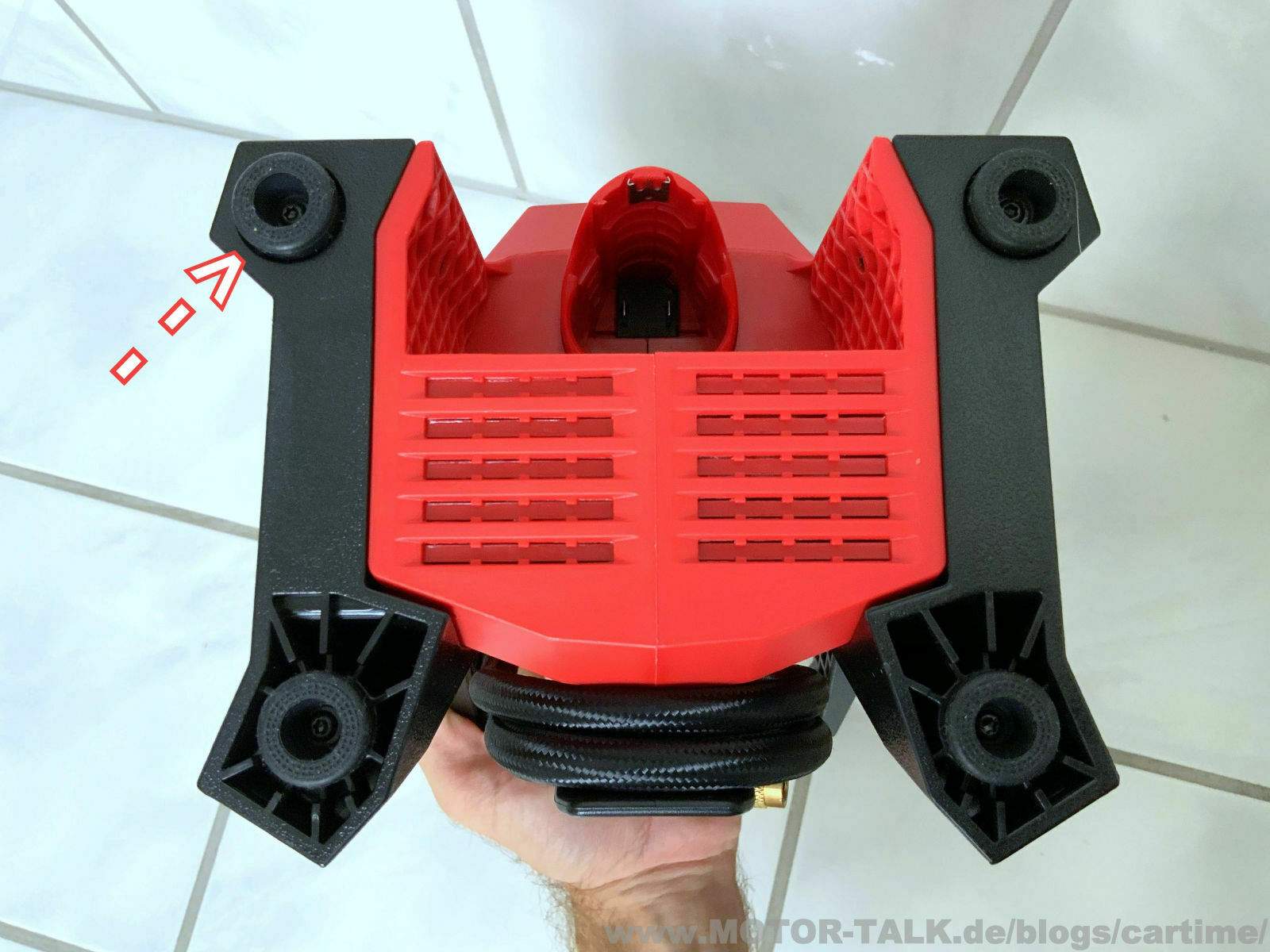 Mein Hauptaugenmerk liegt ja bei der regelmäßigen Reifenfüllung und Kontrolle. Lt. Hersteller kommt das Gerät mit Autoreifen zurecht, die einen maximalen Luftdruck von 1,8 bis 2,4 bar benötigen und kann ebenfalls zur Füllung von LKW-Reifen verwendet werden. Bis 8,7 bar kann man gehen. Für so ein kleines Teil schon beachtlich. Durch die Milwaukee REDLINK-Technologie ist der Akku Kompressor M12 BI-201 lt. Hersteller sowohl vor Überhitzung als auch vor Überfüllung geschützt. Das käme der Lebensauer zugute. Was man theoretisch auch machen könnte, Arbeitsflächen von Staub und Schmutz säubern oder Bohrlöcher auszublasen. Er steht übrigens auf Gummifüßen und kann nicht wegrutschen. Ein fester Stand ist immer garantiert.