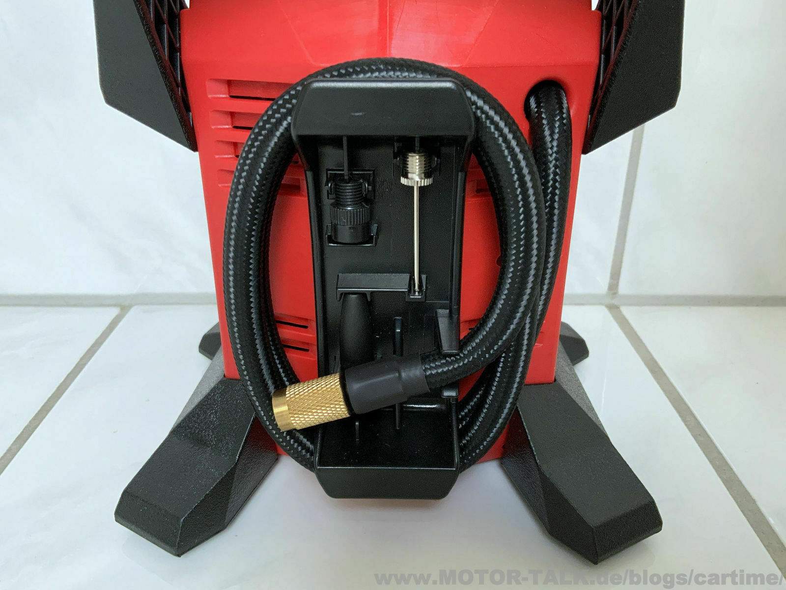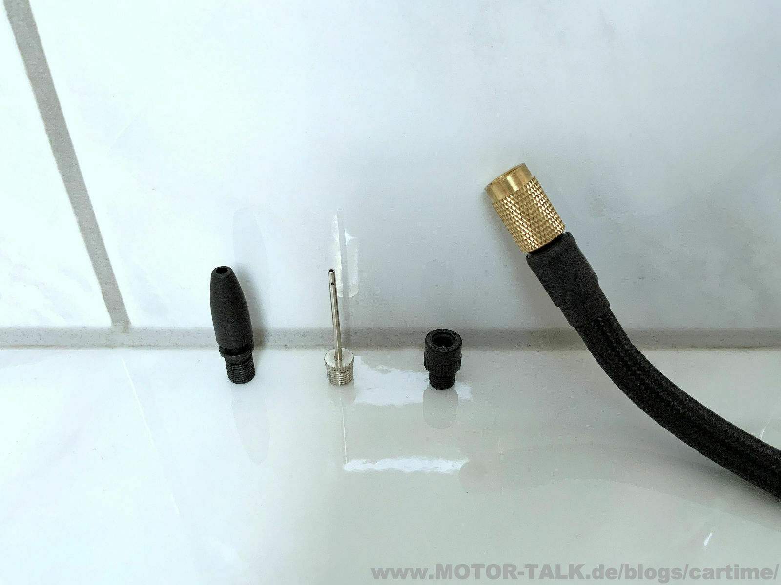 Was mich hier an dem Milwaukee stört ist die Ausführung des Autoreifenadapters in "gerade zum Aufschrauben" - damit leider für meinen geplanten Haupteinsatz "Motorrad" als Alternative zu den gerne auch nicht passenden Tankstellen-Kompressoren nicht unmittelbar geeignet, dafür brauche ich wohl einen zusätzlichen Winkeladapter.