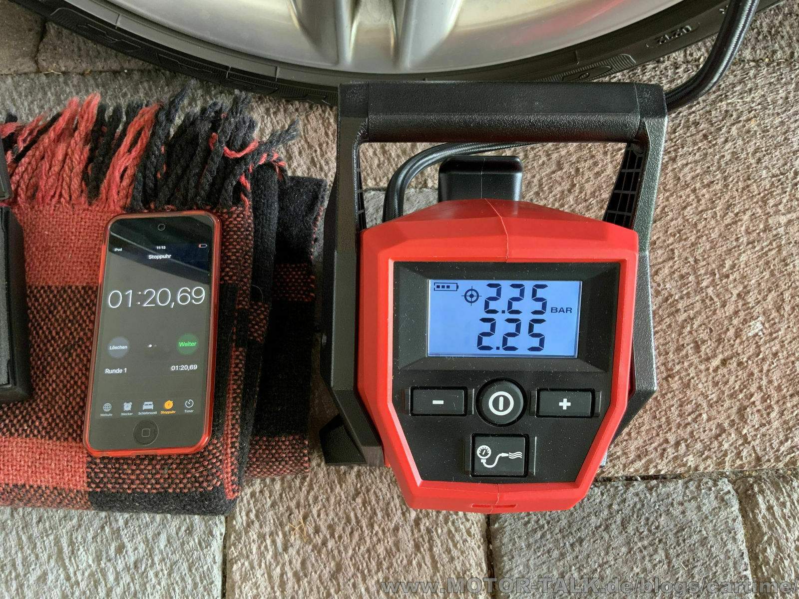 Habe wie oben erwähnt zu Testzwecken Luft bis auf 1.25 bar herausgelassen. Der Kompressor soll auf 2.25 bar aufpumpen. Genau +1 bar. Unten zeigt das Gerät den IST-wert an, oben drüber steht der SOLL-wert. Stoppuhr am Handy auf GO und ab dafür. Übrigens wenn man „+“ länger gedrückt lässt, geht es in schneller aufwärts.