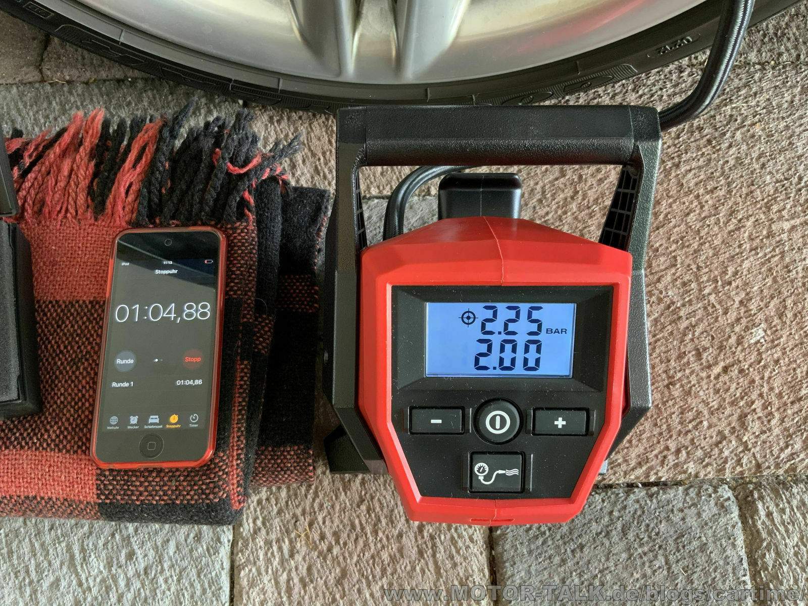 Schlussendlich braucht es laut Stoppuhr für +1 bar an einem Reifen obiger Größe knapp 1 Minute und 21 Sekunden. Finde ich absolut in Ordnung.