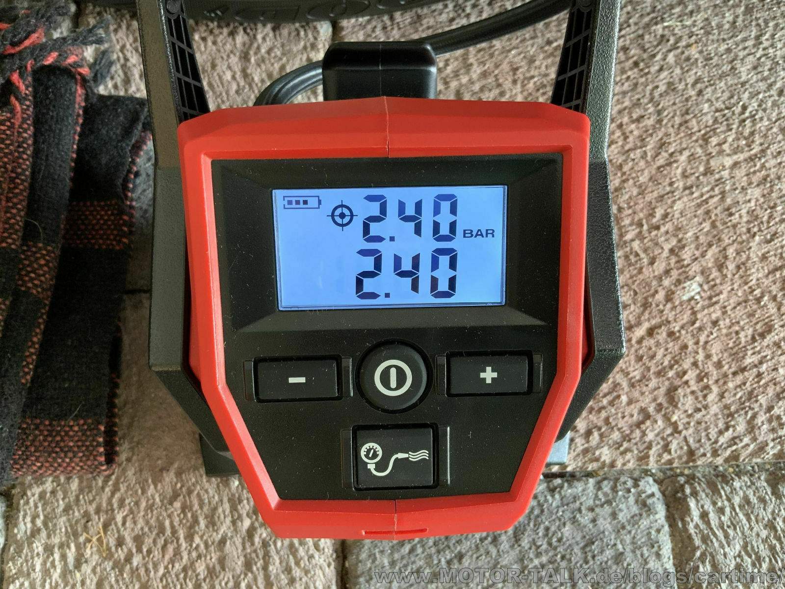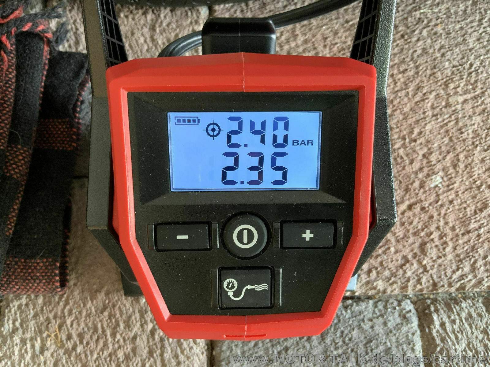Da noch nicht der Wert erreicht ist, mit dem ich schlussendlich fahre, wird nun nochmal weiter gepumpt bis knapp 2.4 bar (etwas mehr als Werkangabe) erreicht sind. Die +0.15 bar mehr waren in einige Sekunden im Reifen drin. Das könnte jetzt ein realitätsnahes Aufpumpen sein. Sprich so ein Wert pumpt man schon mal öfters nach. Bei dem Test, also insgesamt 1.15 bar aufpumpen ist ein Balken der Batterie Anzeige weggegangen.
